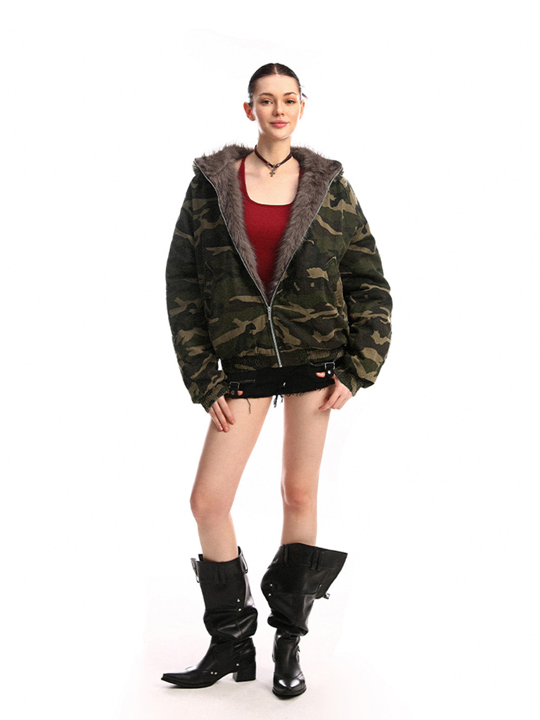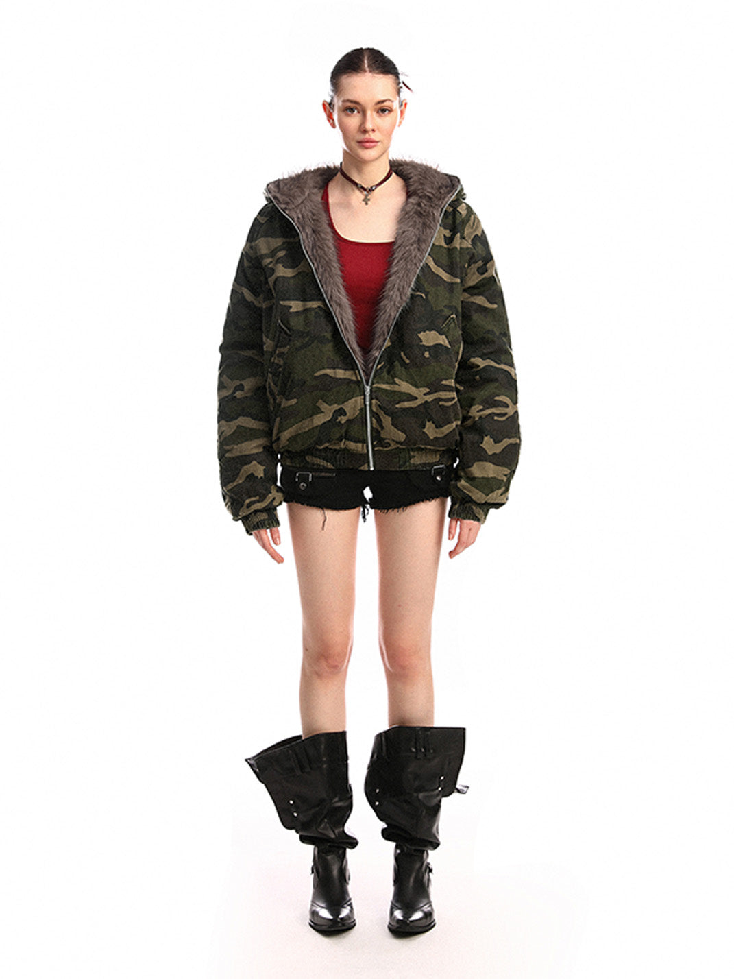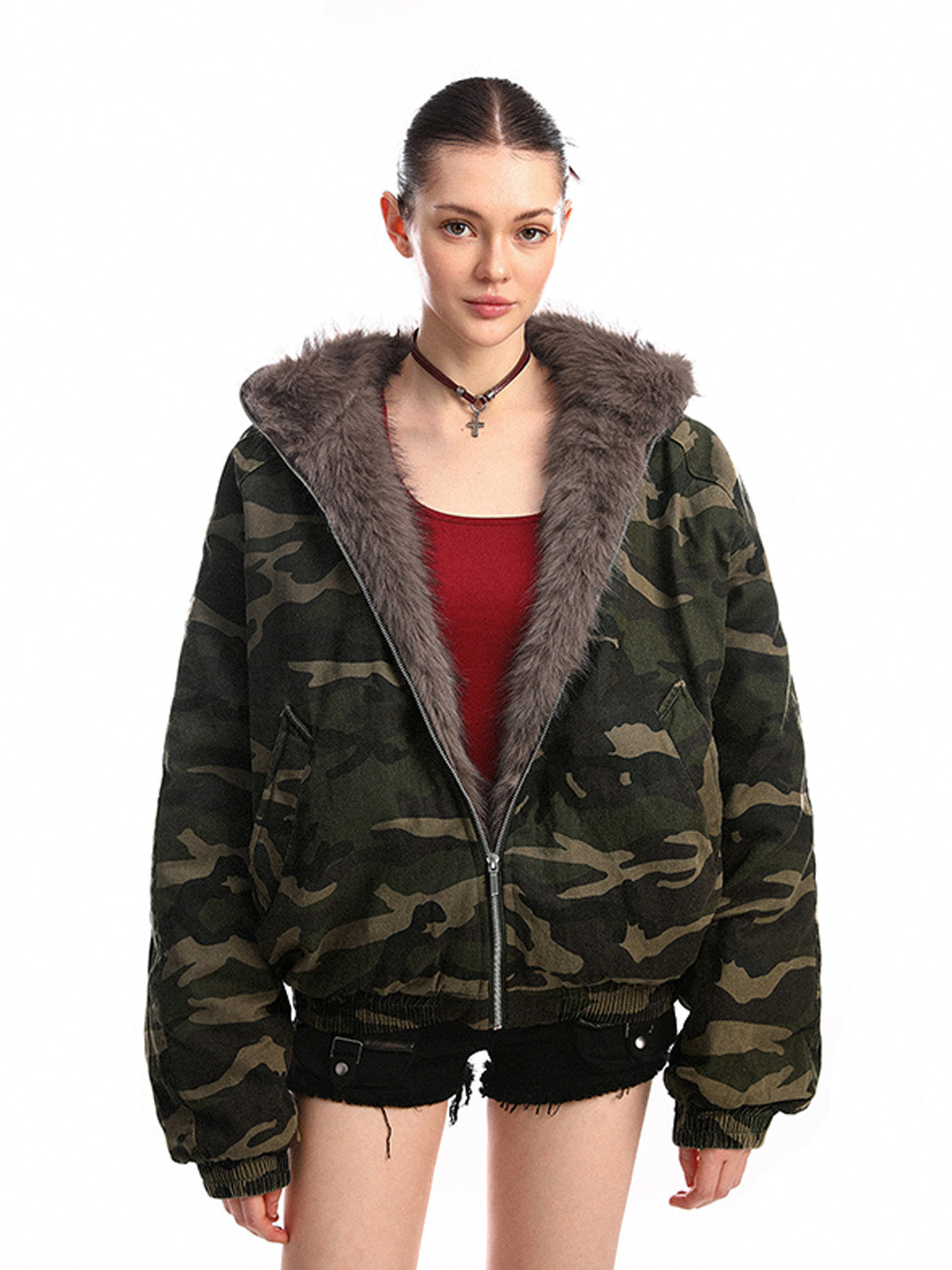 BIGGOLD | Vintage Camouflage Faux Fur Hooded Coat