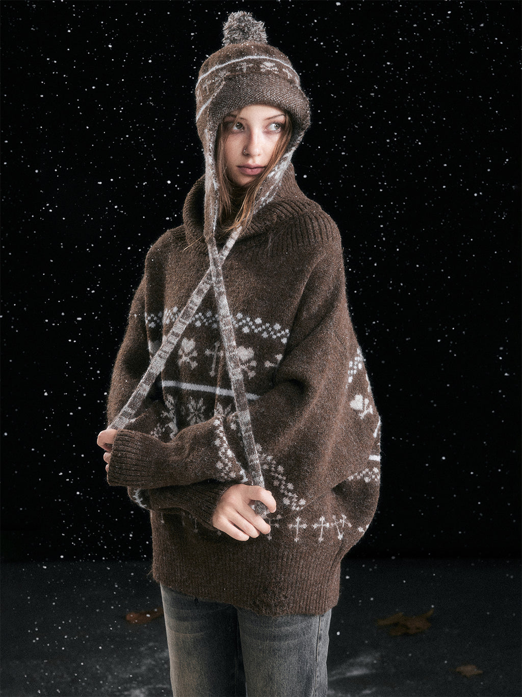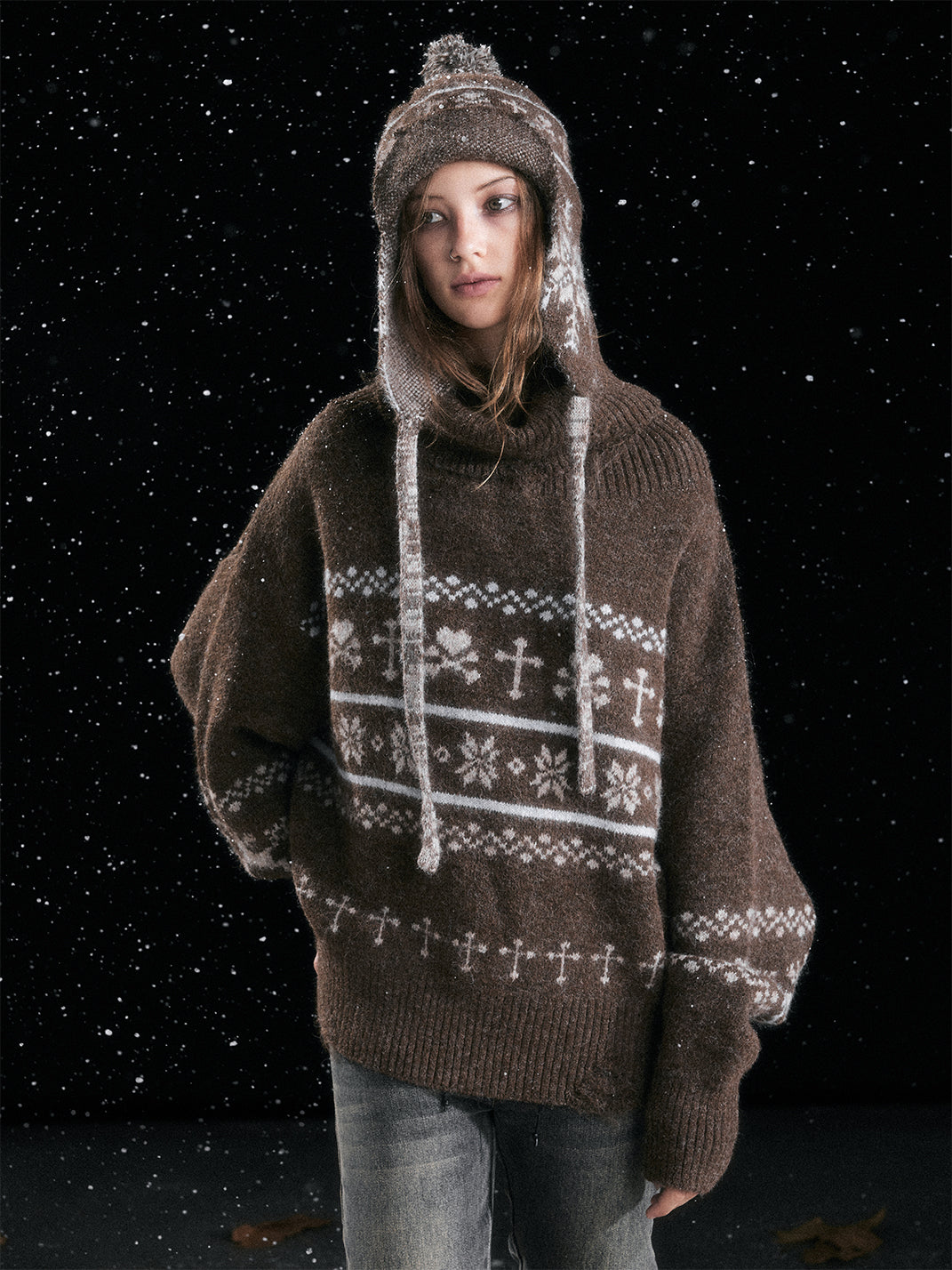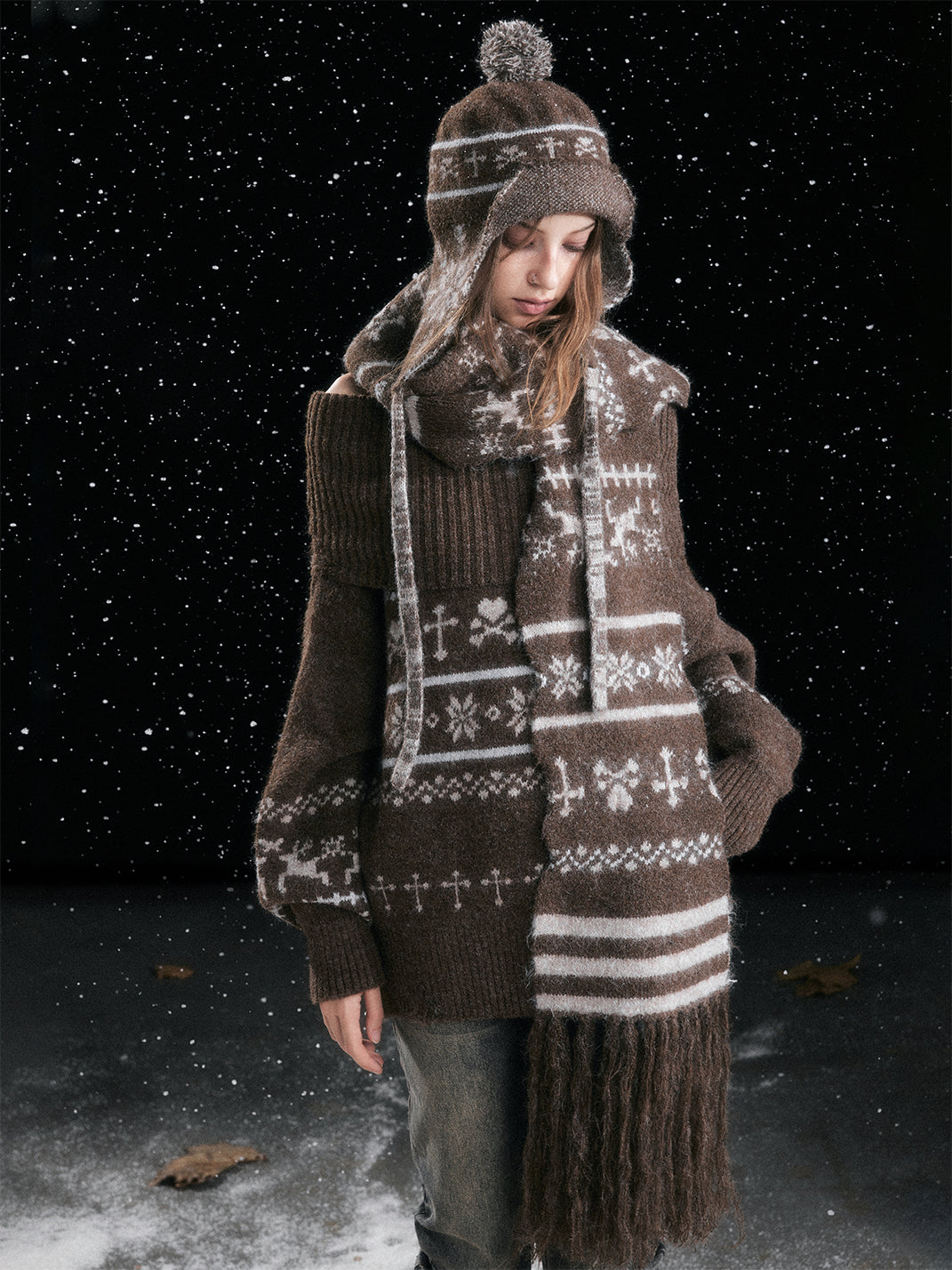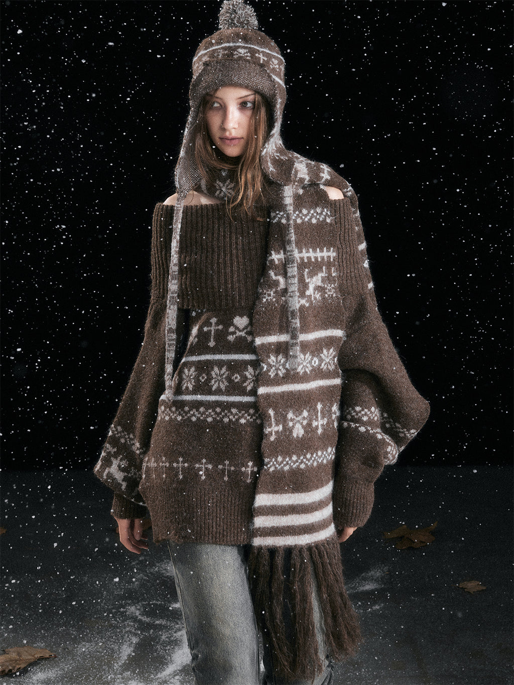 Cest Nous | Jacquard Knit Hat With Cord And Pom-Poms