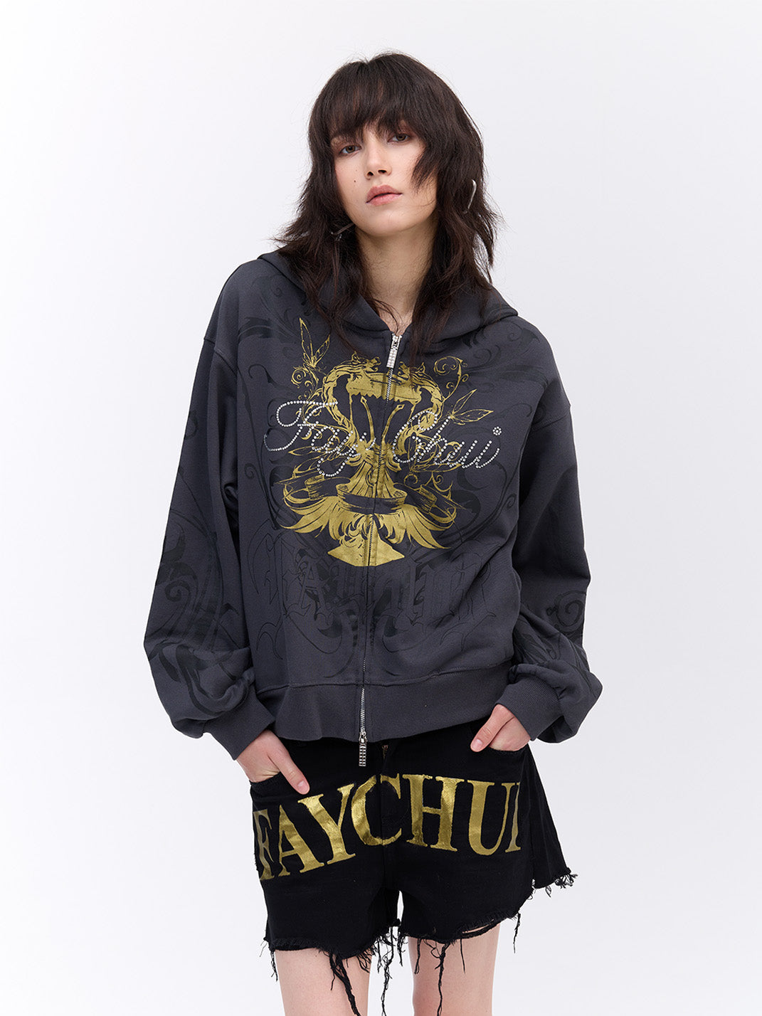 FayChui | Vintage Wash Gold Print Hoodie Jacket saltar al contenido