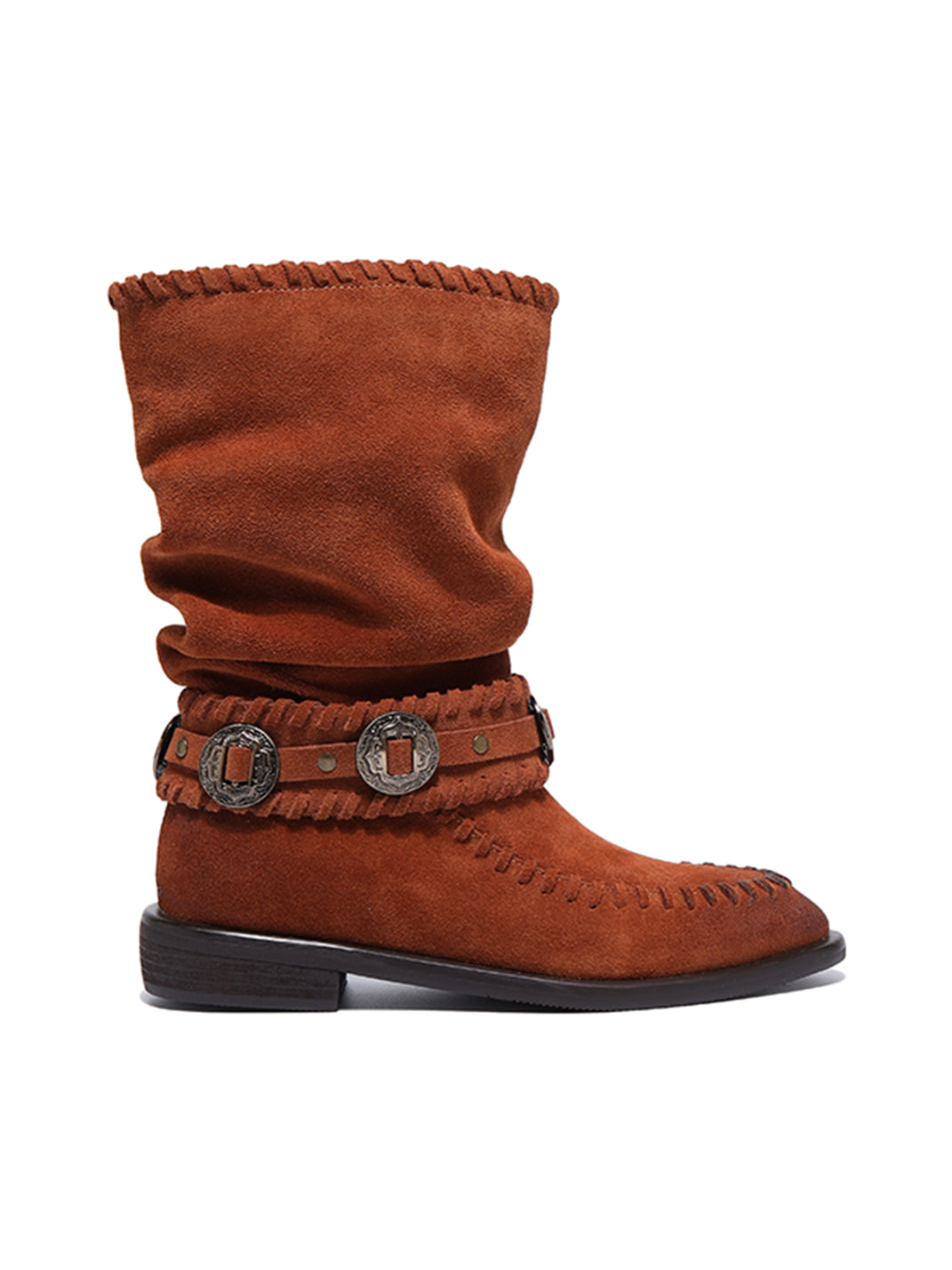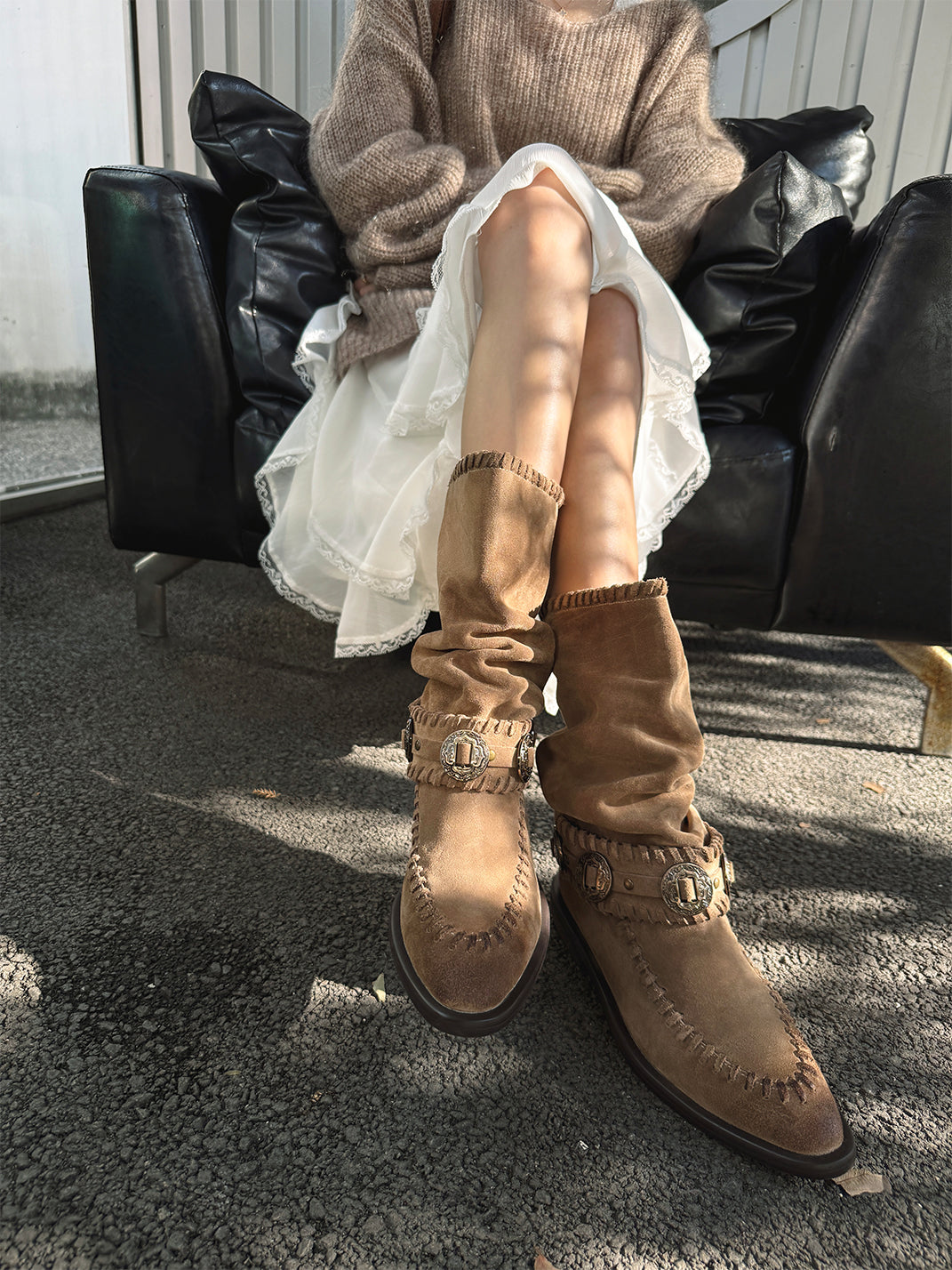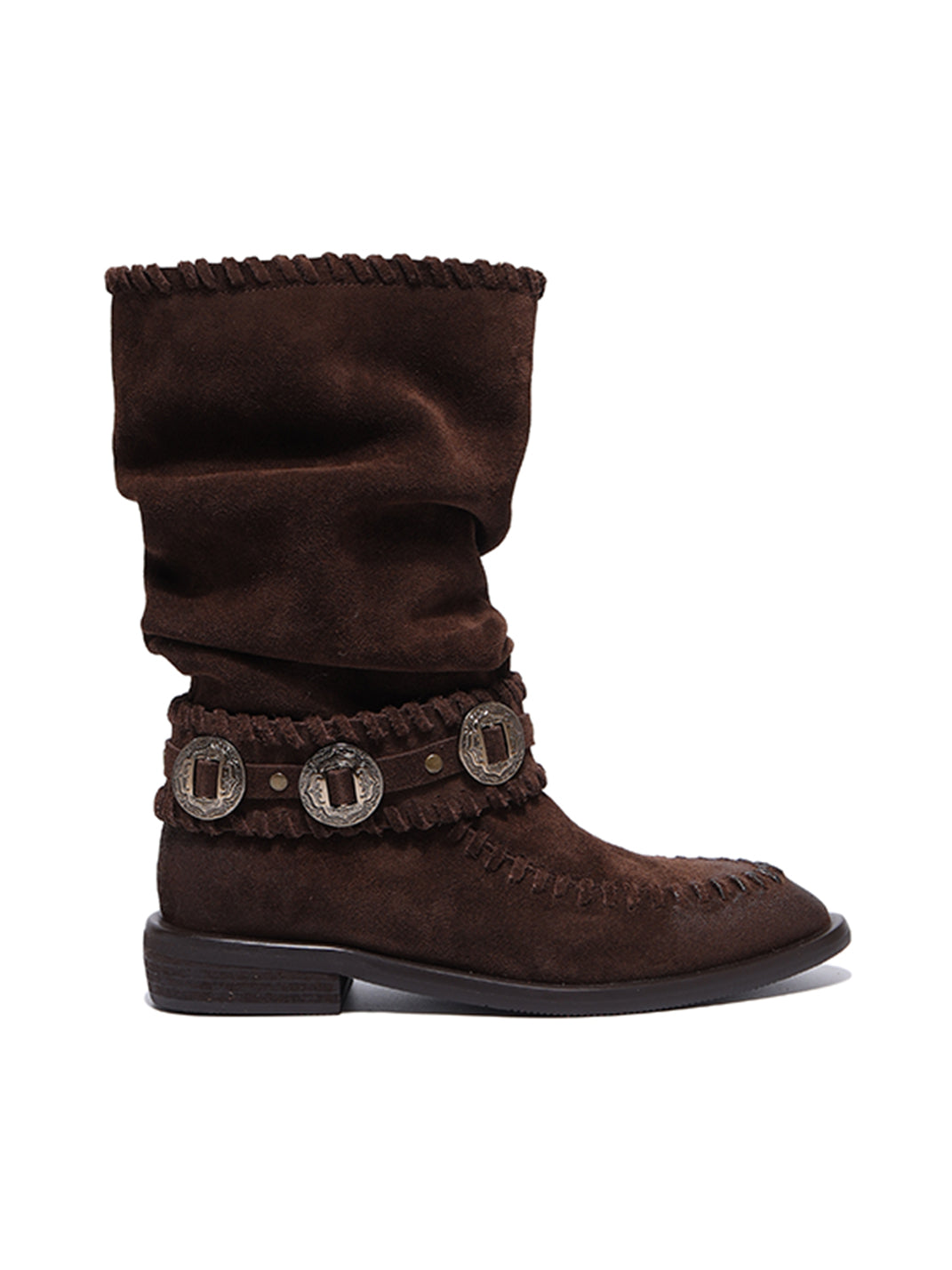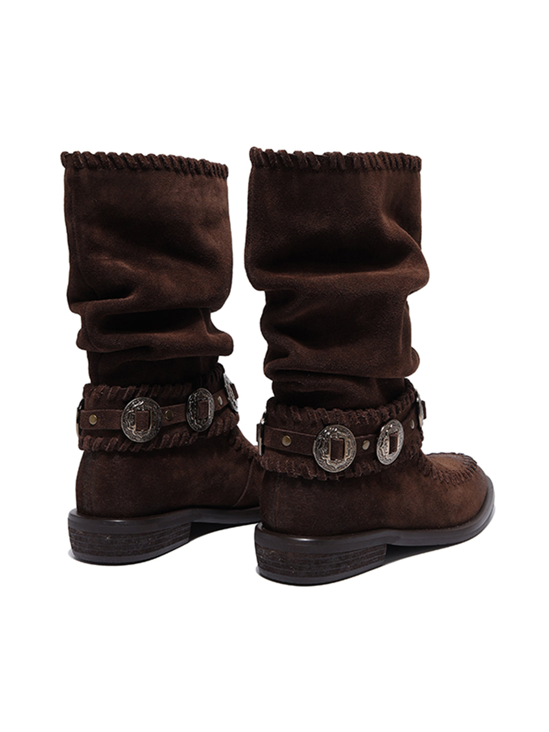 GSL | Retro Western Buckle Detail Suede Mid-calf Boots