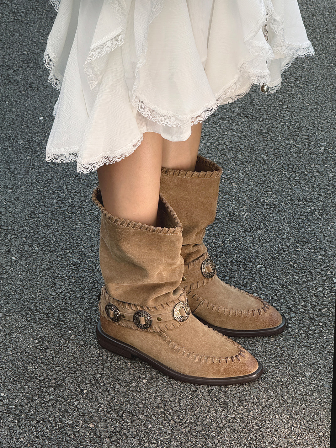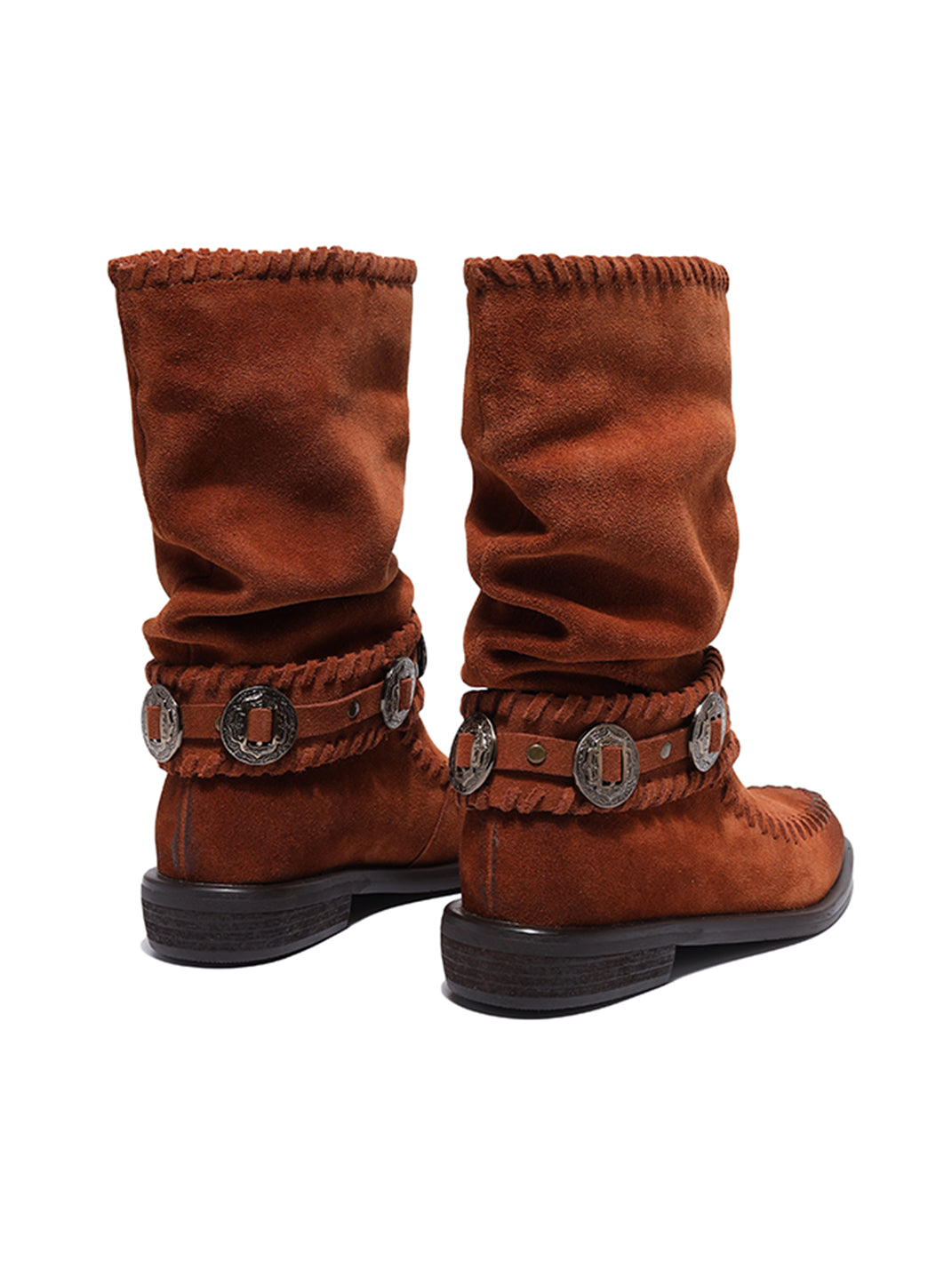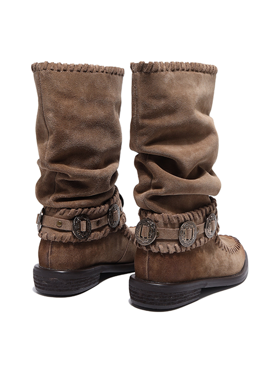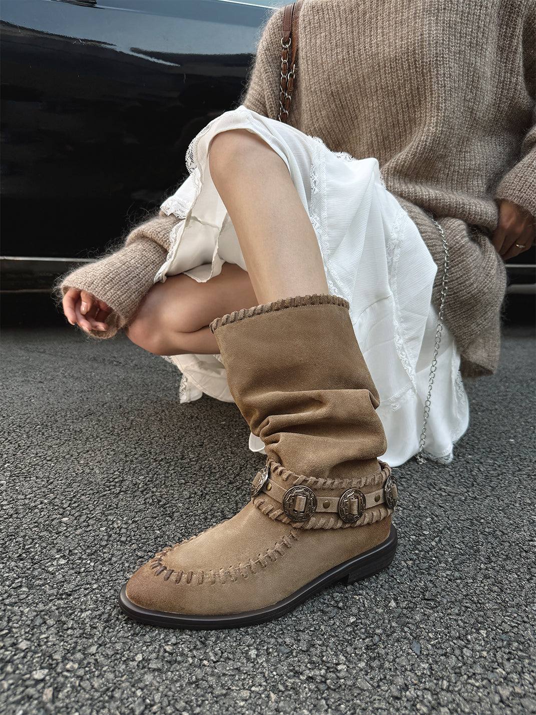 GSL | Retro Western Buckle Detail Suede Mid-calf Boots