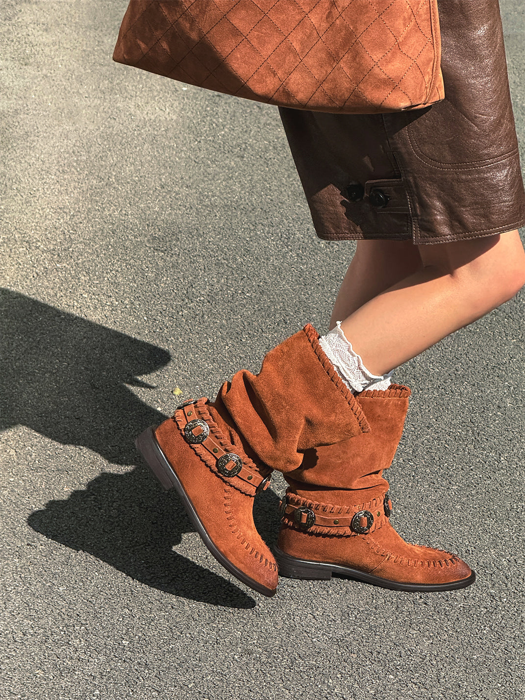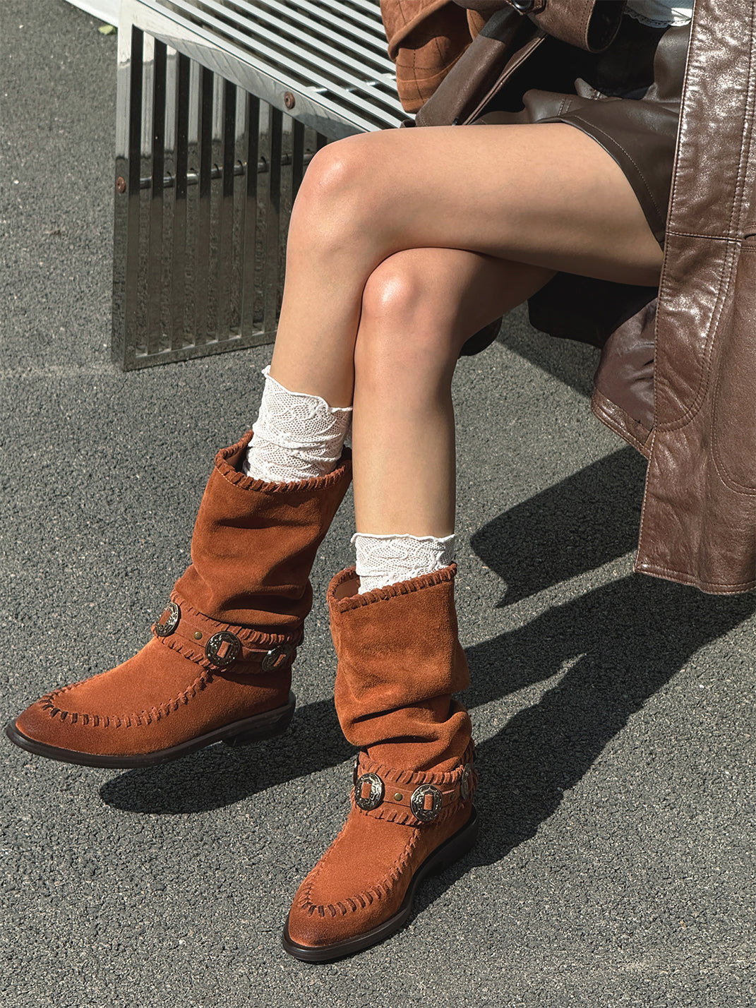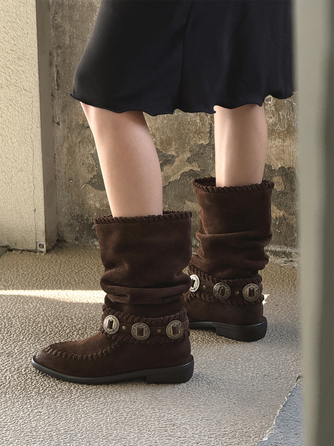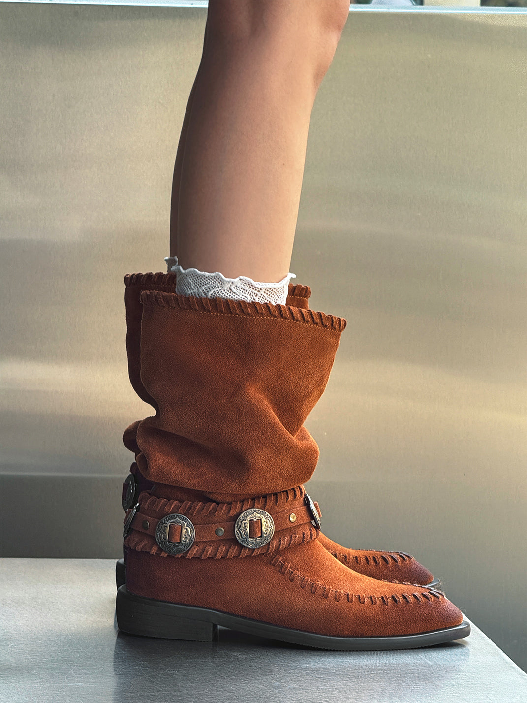 GSL | Retro Western Buckle Detail Suede Mid-calf Boots