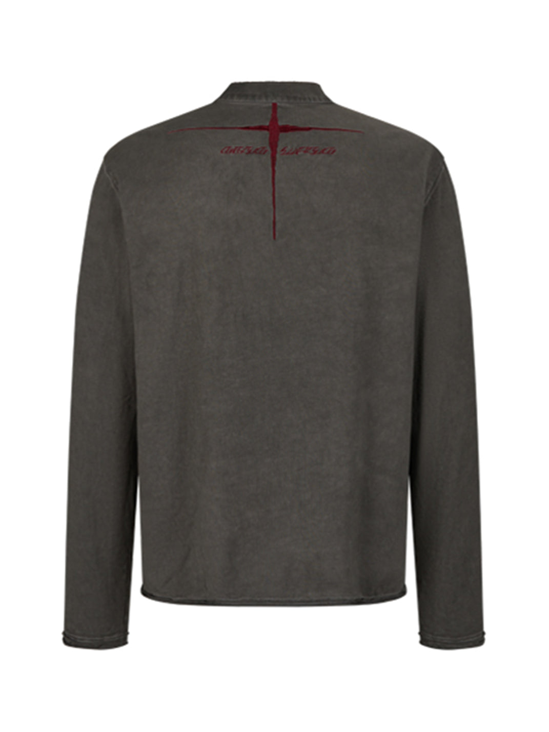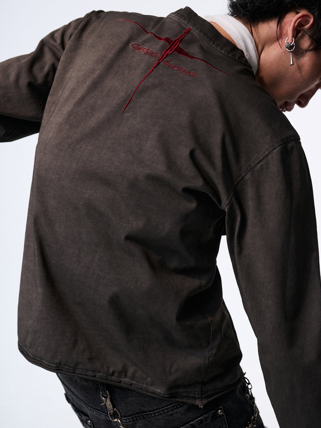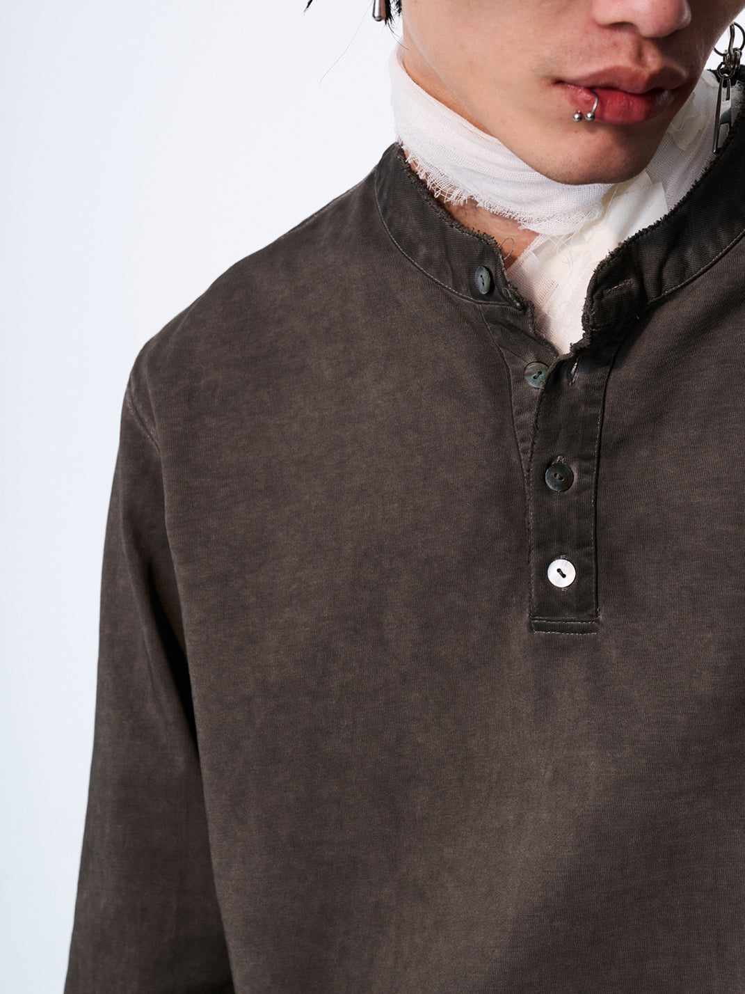 The Distressed Cross-Stitched Henley Shirt blends streetwear cool with a forward-thinking edge. This Henley shirt features an aged, distressed finish and a raw-edged neckline that exudes effortless style. The standout cross-stitch embroidery on the back shoulder adds a bold visual statement, while the logo print near the cuffs delivers a subtle branded touch. The double-layered rolled edges at the cuffs and hemline elevate the design with intricate detail. Crafted from a heavy-weight 310g premium 100% cotton fabric, this slightly oversized shirt offers both durability and a relaxed contemporary silhouette.