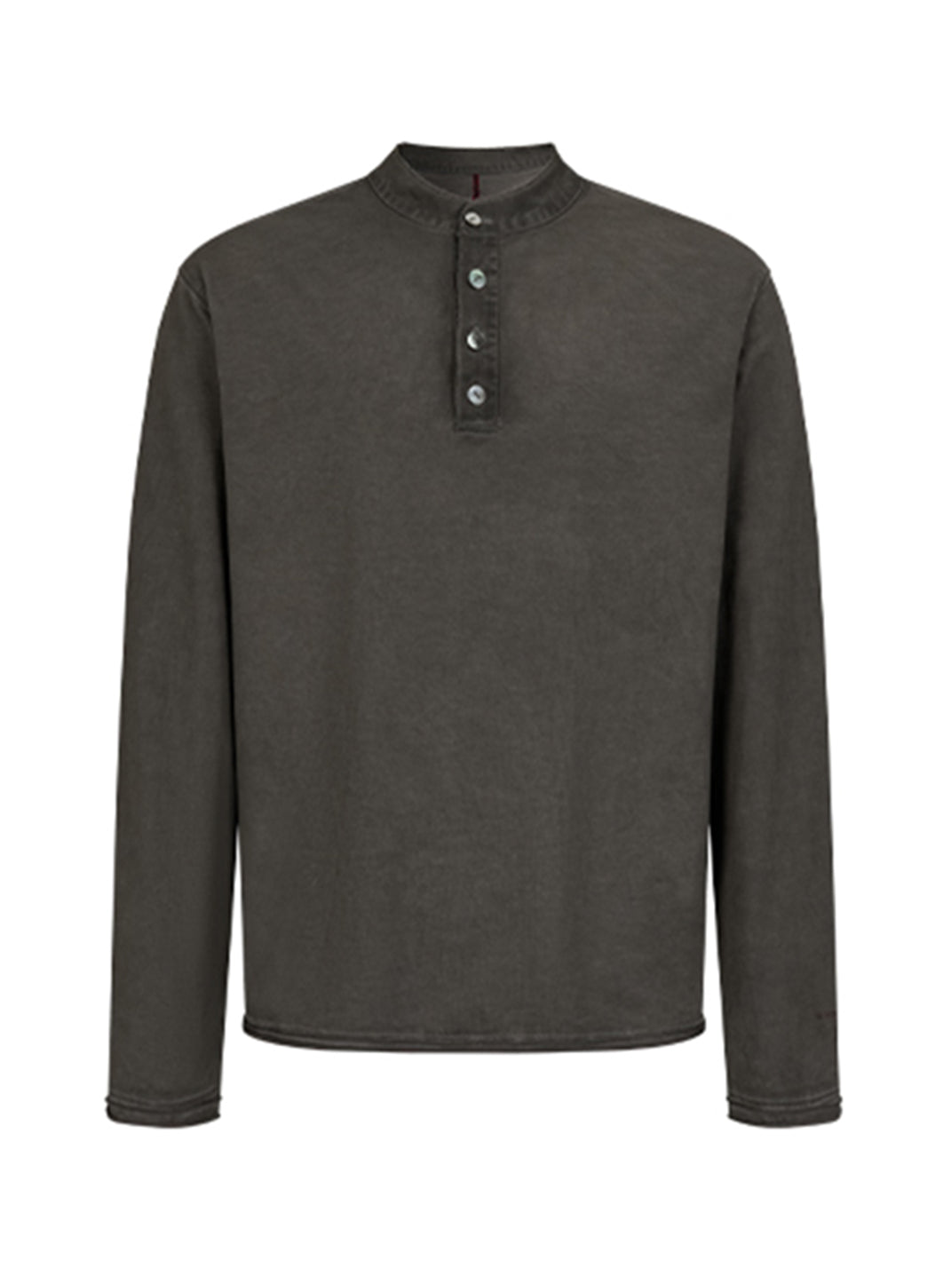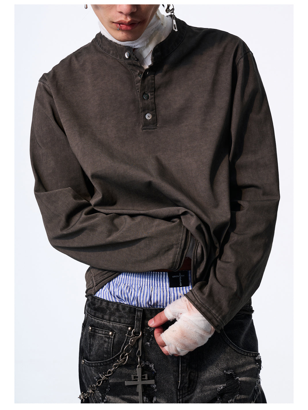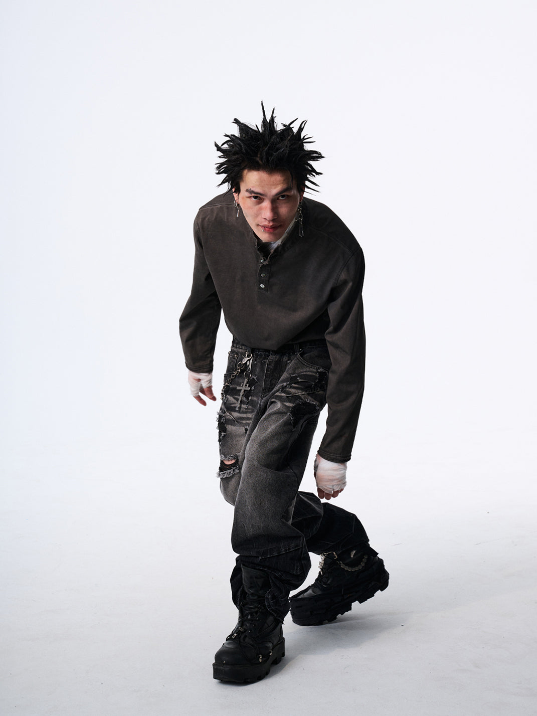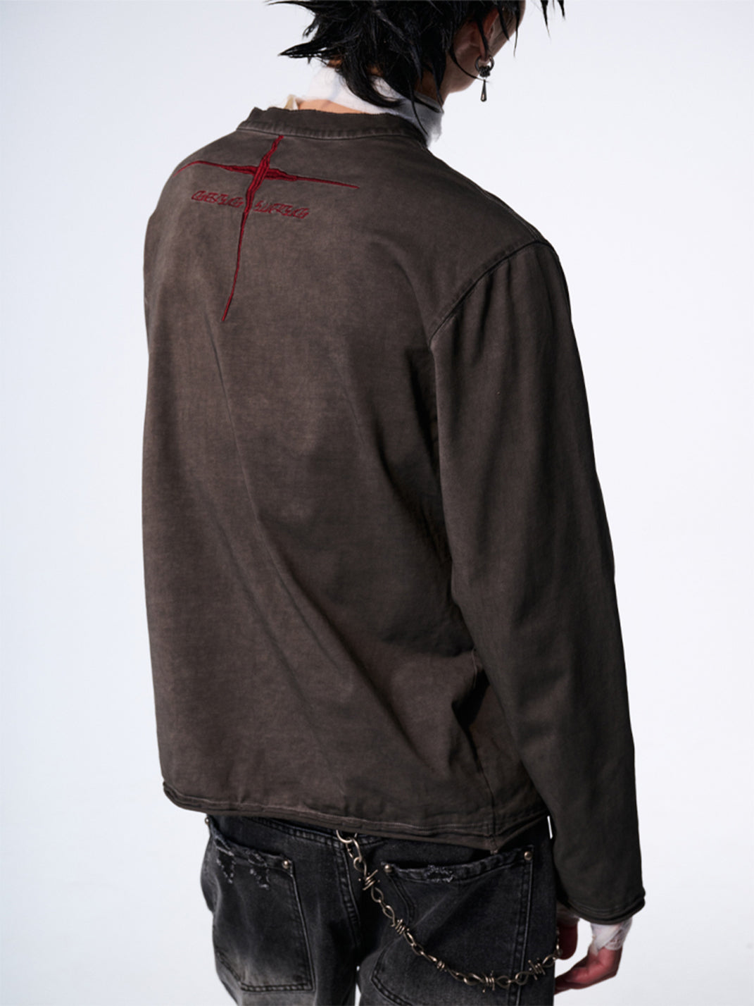 The Distressed Cross-Stitched Henley Shirt blends streetwear cool with a forward-thinking edge. This Henley shirt features an aged, distressed finish and a raw-edged neckline that exudes effortless style. The standout cross-stitch embroidery on the back shoulder adds a bold visual statement, while the logo print near the cuffs delivers a subtle branded touch. The double-layered rolled edges at the cuffs and hemline elevate the design with intricate detail. Crafted from a heavy-weight 310g premium 100% cotton fabric, this slightly oversized shirt offers both durability and a relaxed contemporary silhouette.