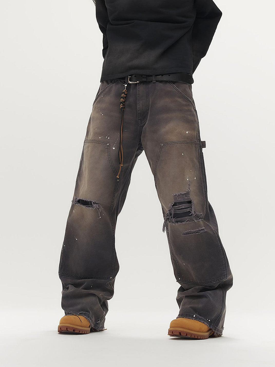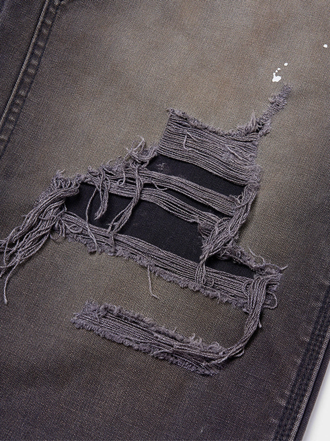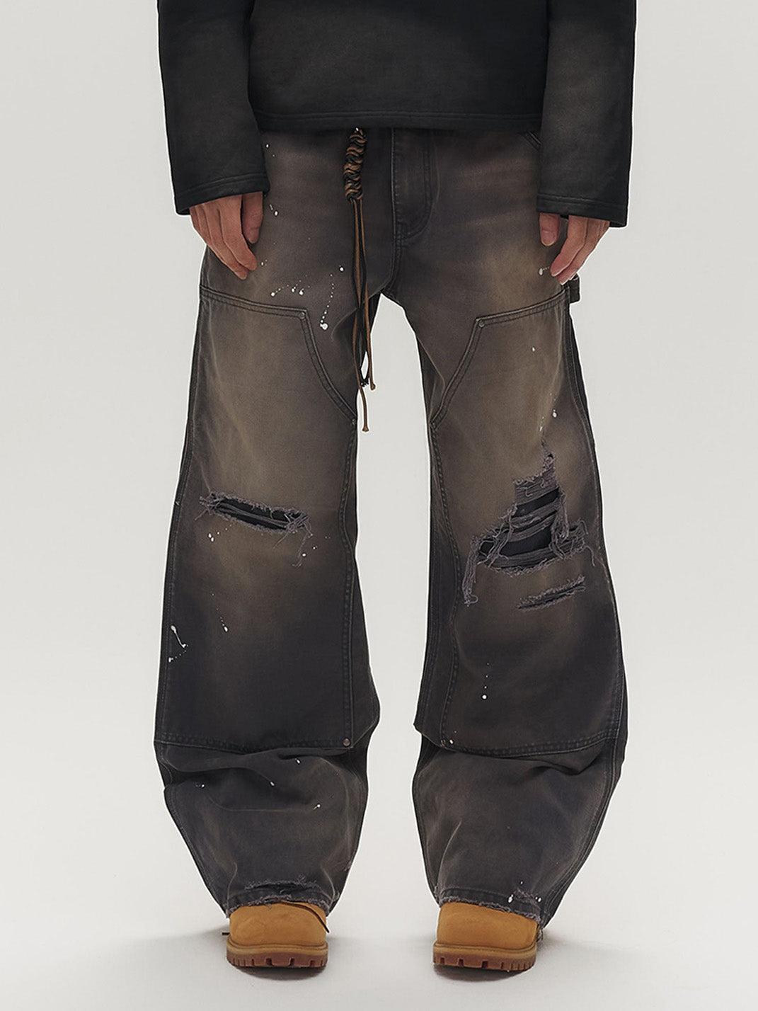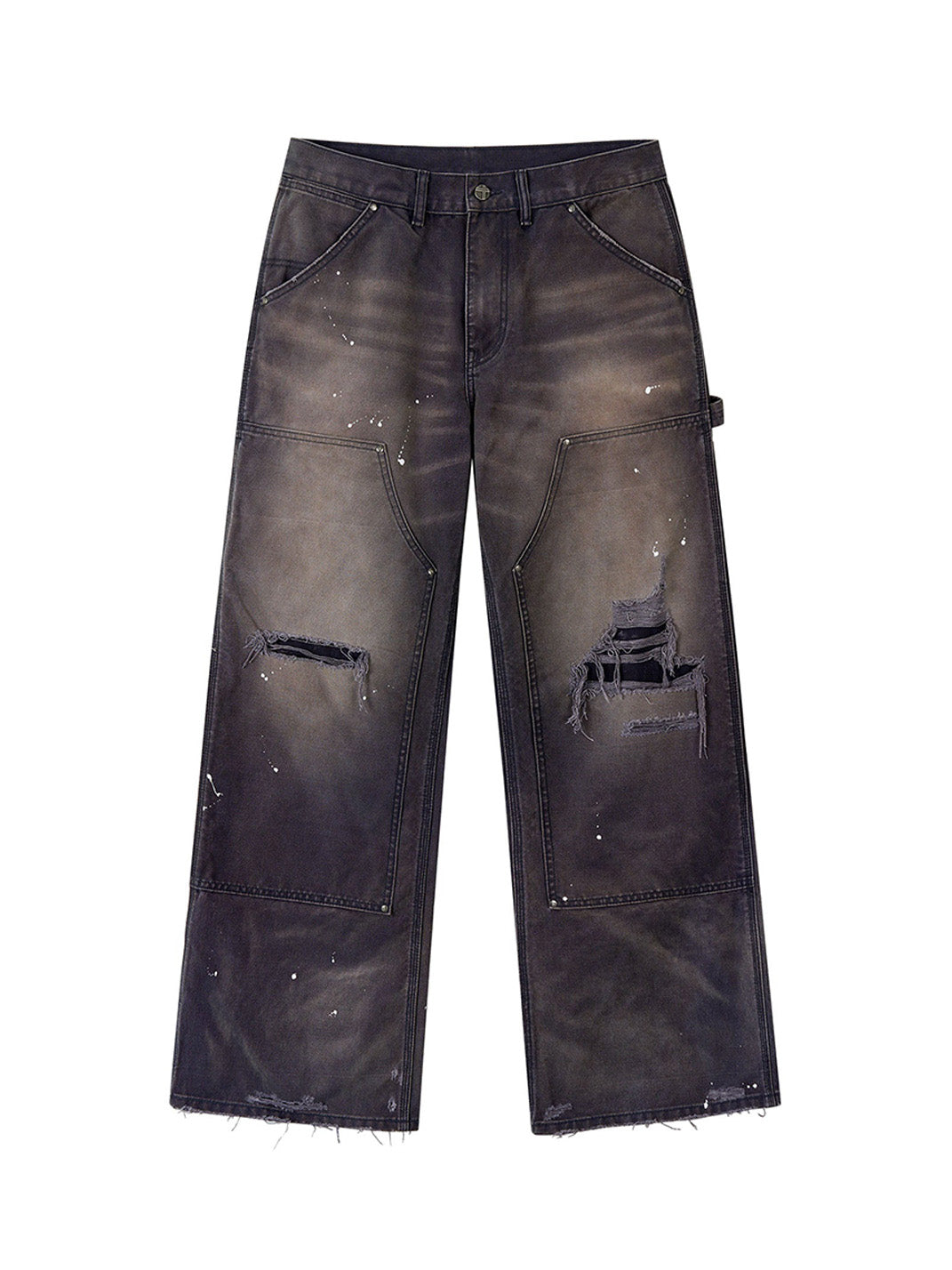 The Distressed Double-Knee Splatter Jeans reinterpret utilitarian workwear through a raw, contemporary lens. Crafted from 100% premium cotton, the design features reinforced double-knee panels and deconstructed rips that highlight its lived-in texture. Subtle paint splatter detailing adds an expressive, street-informed edge, while oversized cargo pockets enhance its functional appeal. The relaxed, wide-leg cut completes its industrial-inspired silhouette with effortless attitude.