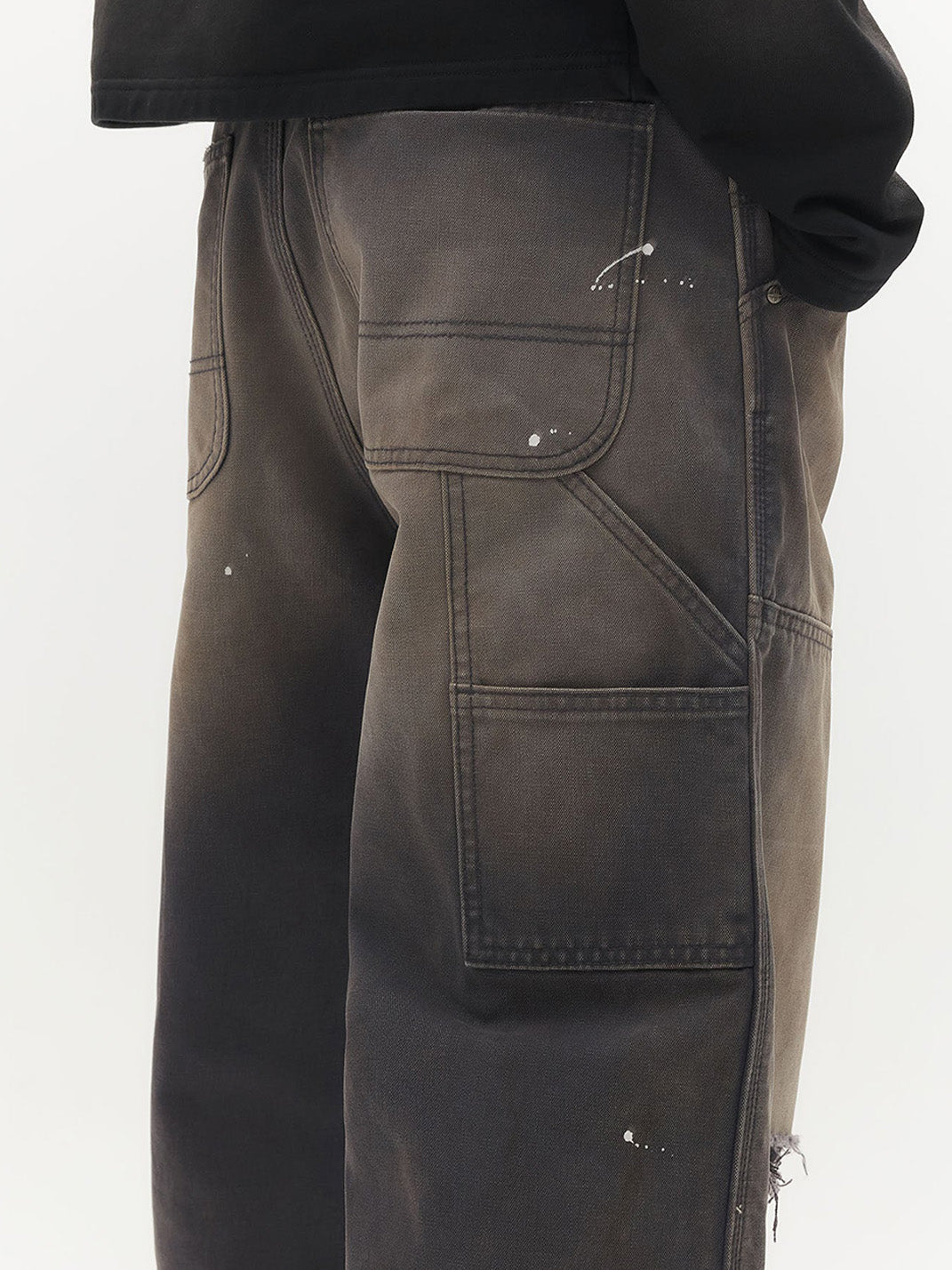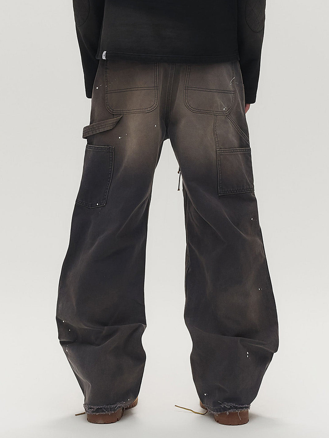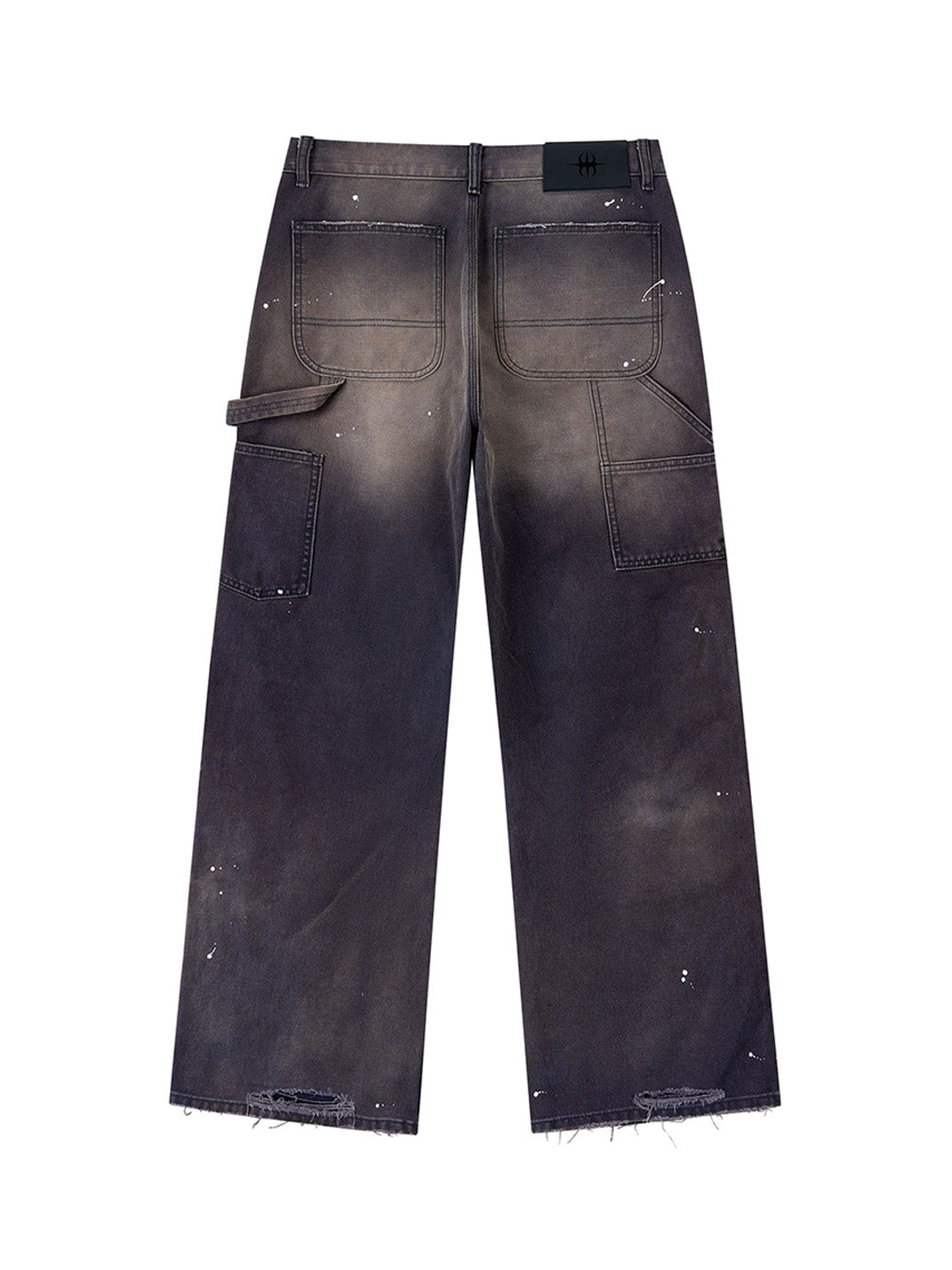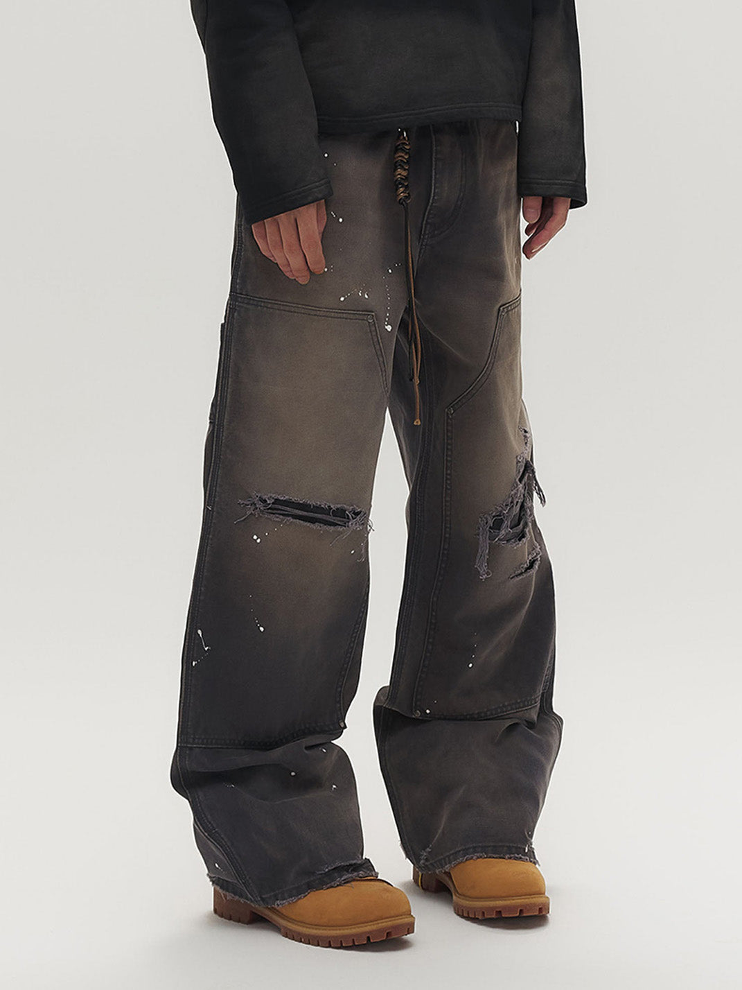 The Distressed Double-Knee Splatter Jeans reinterpret utilitarian workwear through a raw, contemporary lens. Crafted from 100% premium cotton, the design features reinforced double-knee panels and deconstructed rips that highlight its lived-in texture. Subtle paint splatter detailing adds an expressive, street-informed edge, while oversized cargo pockets enhance its functional appeal. The relaxed, wide-leg cut completes its industrial-inspired silhouette with effortless attitude.
