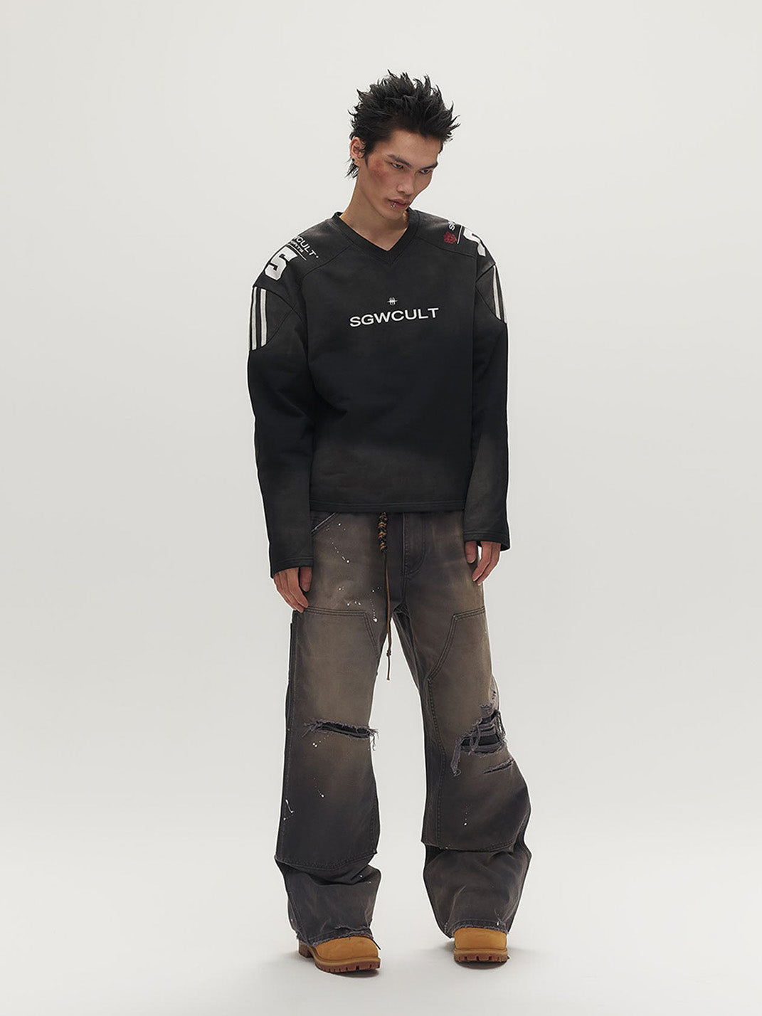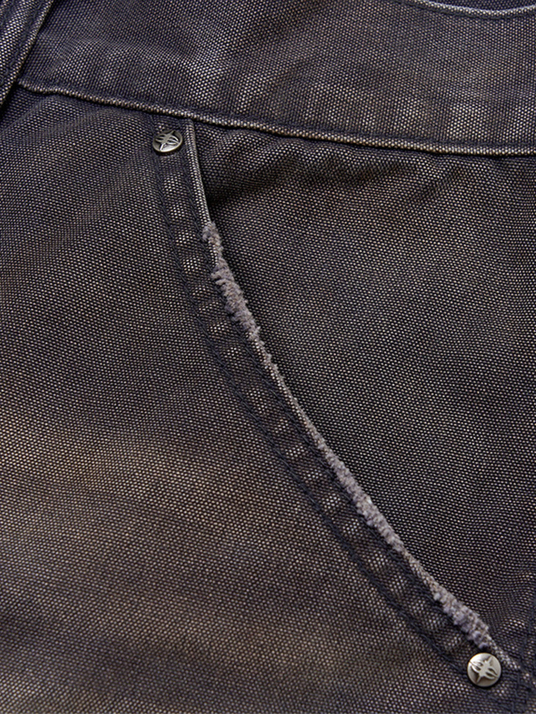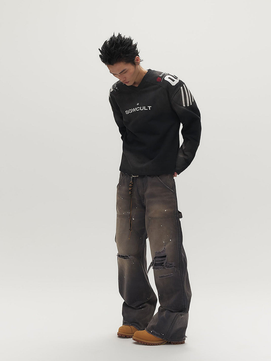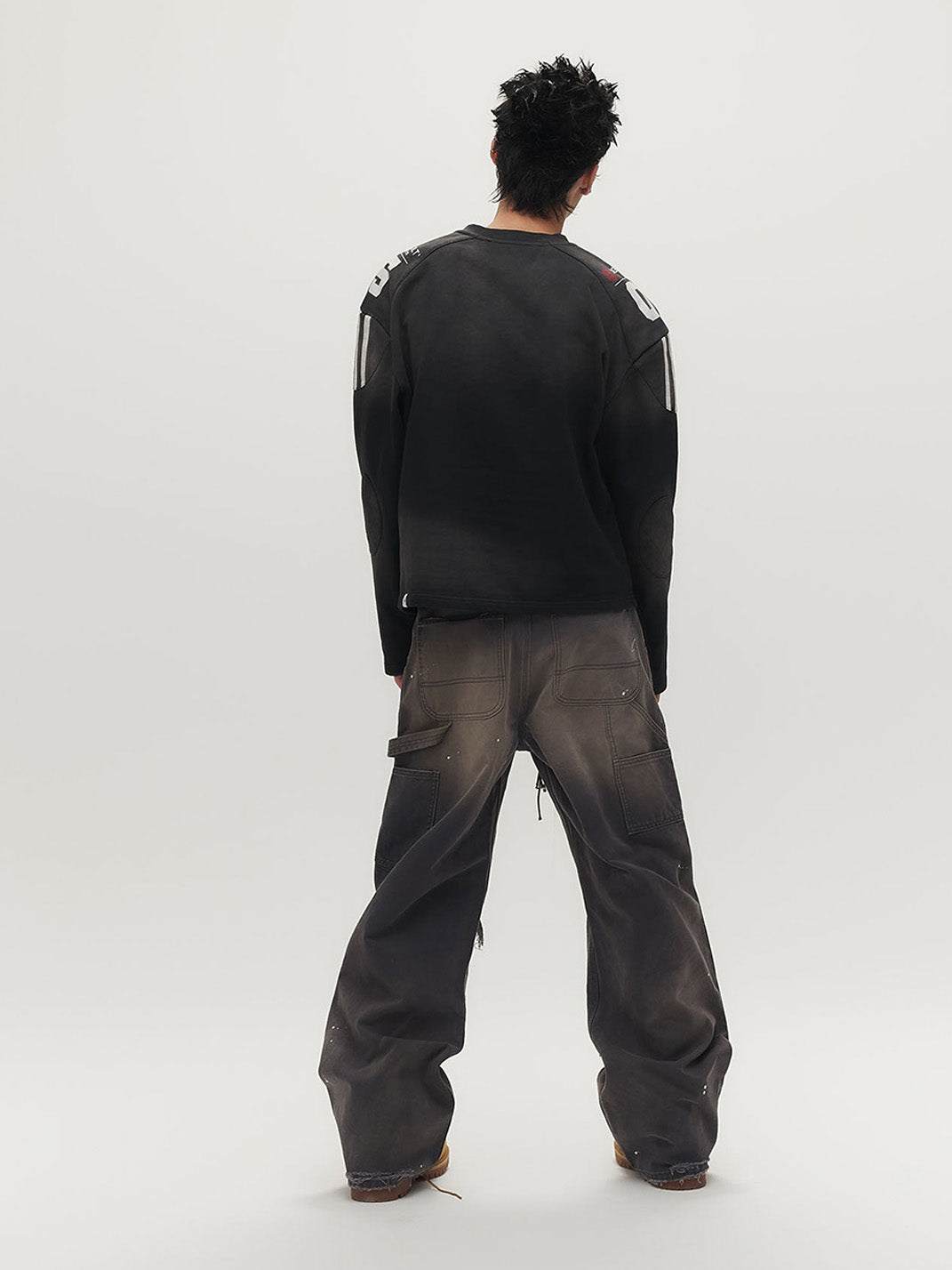The Distressed Double-Knee Splatter Jeans reinterpret utilitarian workwear through a raw, contemporary lens. Crafted from 100% premium cotton, the design features reinforced double-knee panels and deconstructed rips that highlight its lived-in texture. Subtle paint splatter detailing adds an expressive, street-informed edge, while oversized cargo pockets enhance its functional appeal. The relaxed, wide-leg cut completes its industrial-inspired silhouette with effortless attitude.
