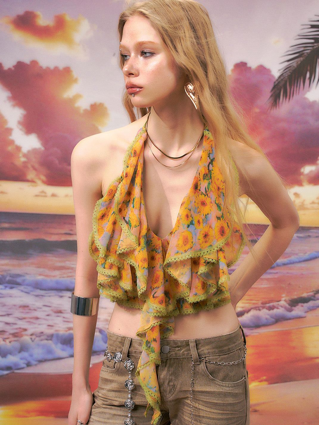 THE NEVERMORE | Floral Print Ruffle Halter Top saltar al contenido