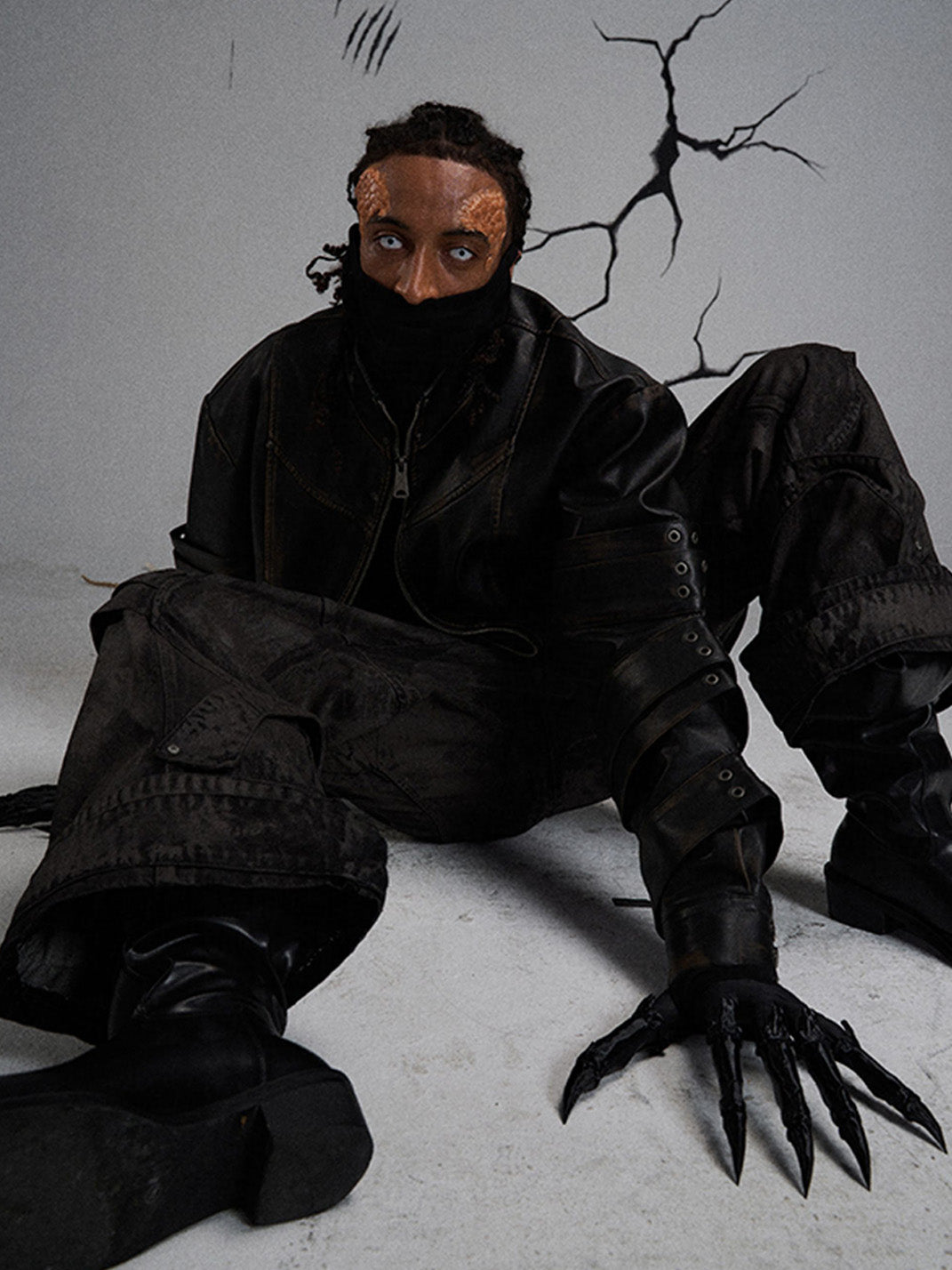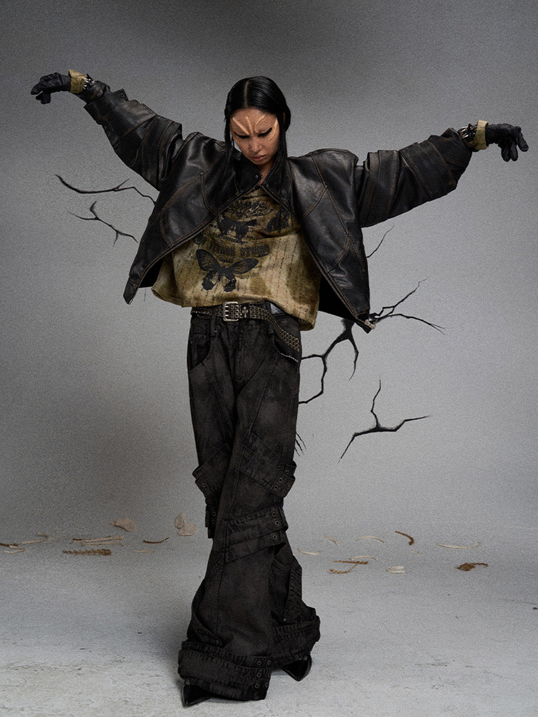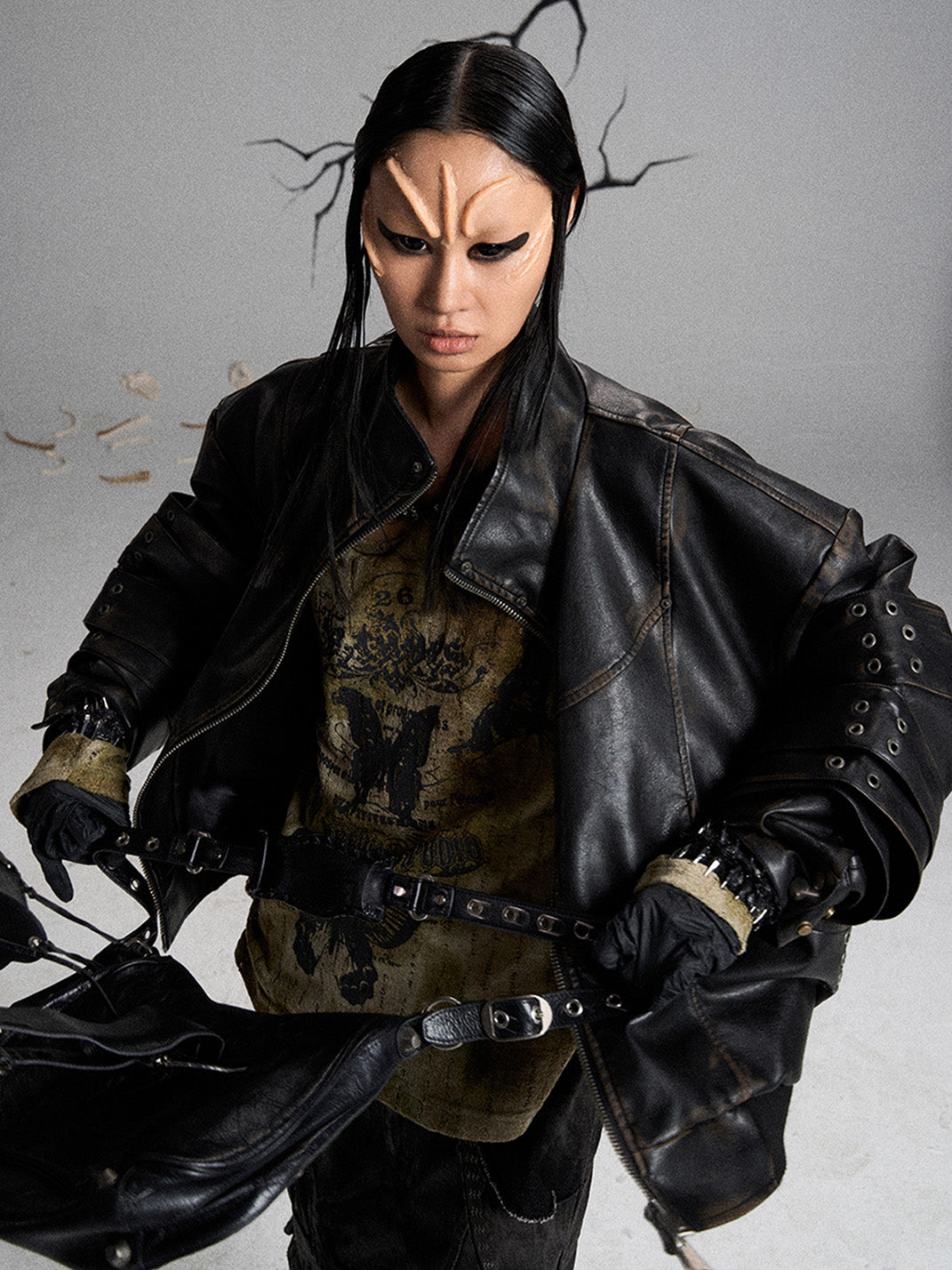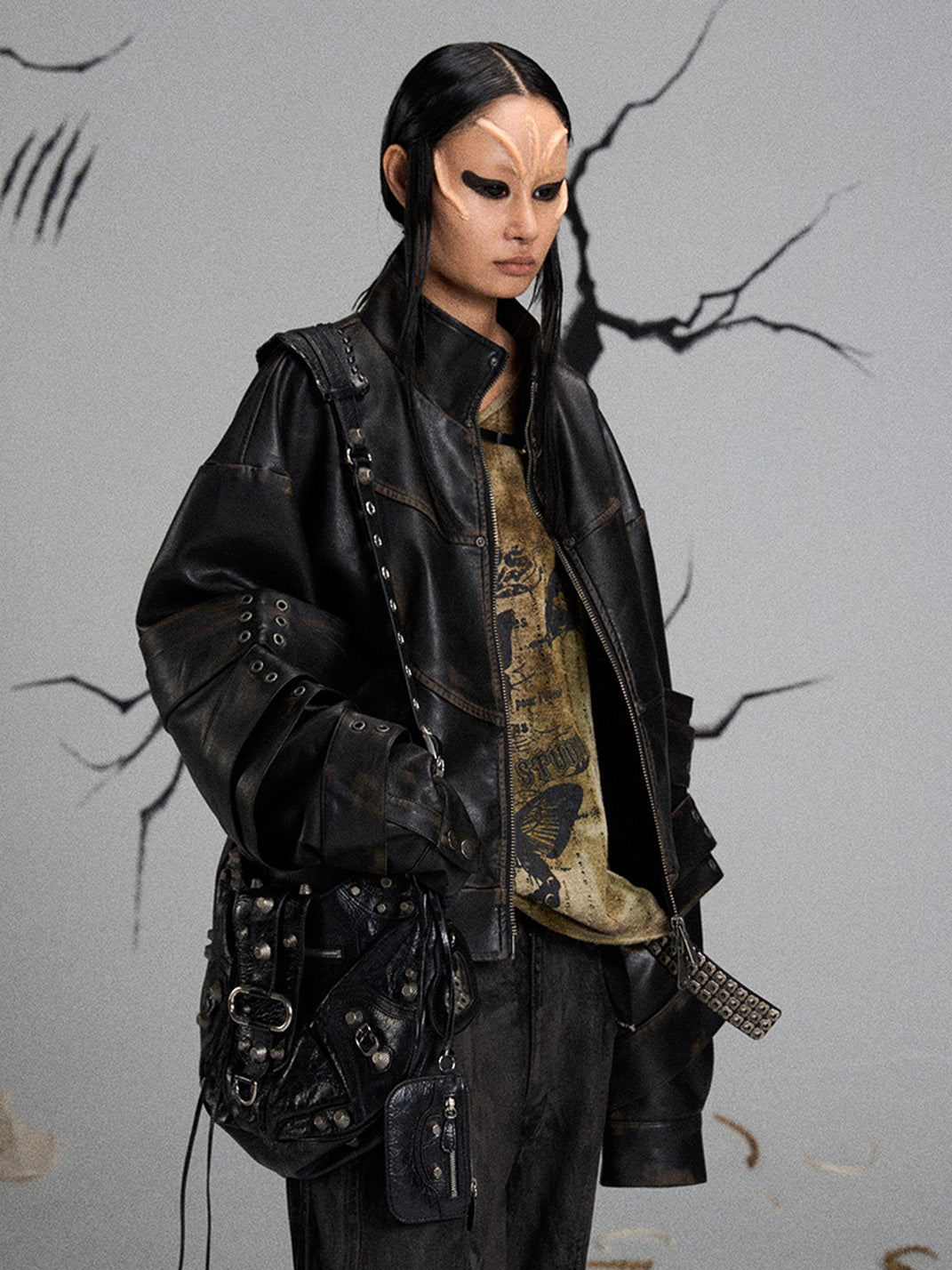 FLYERRER introduces a blue leather jacket, reminiscent of a blood-soaked knight emerging from a muddy battlefield. The unusual stacking of the sleeves and the hardware decorations present a deconstructed armor design, while the multi-segmented body and the distressed leather finish further recreate the form of armor and the muddy battlefield environment.