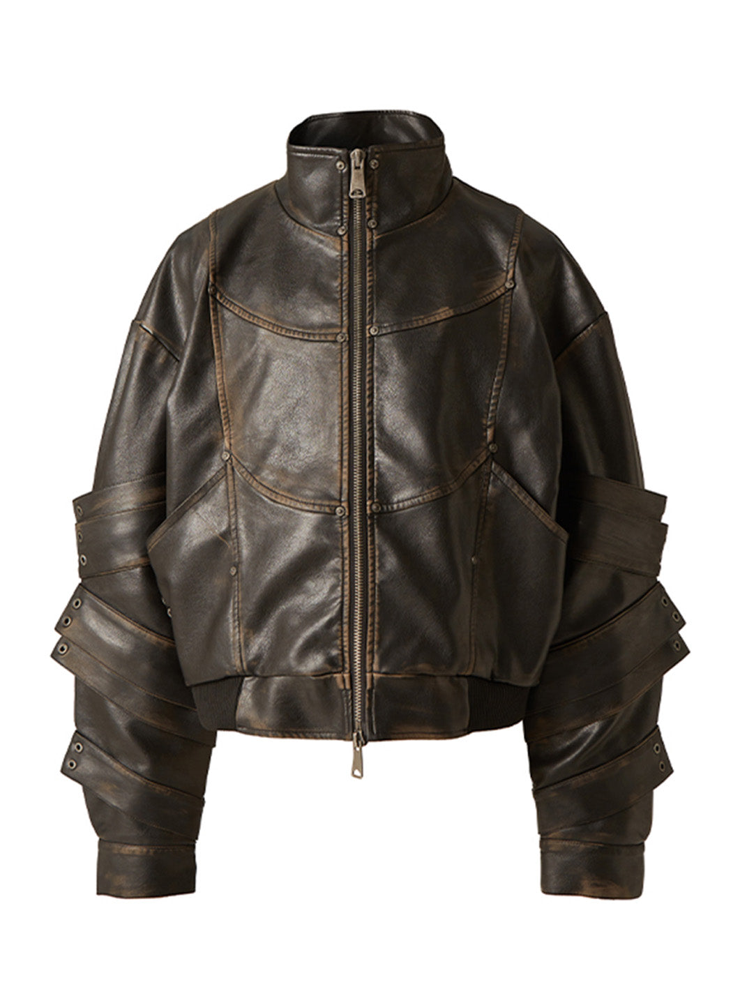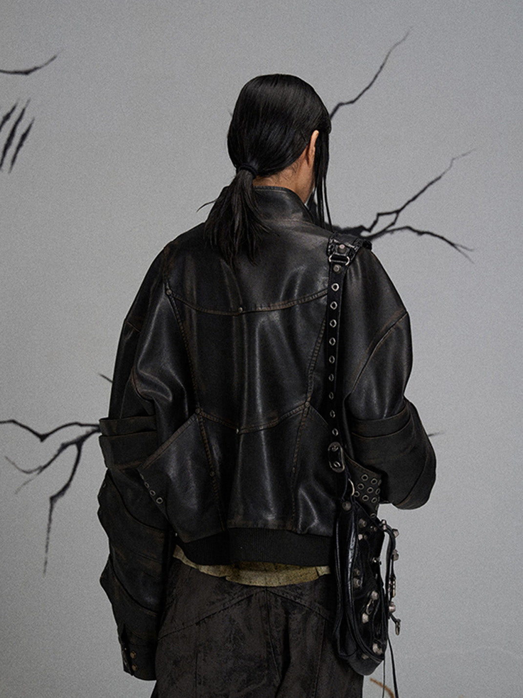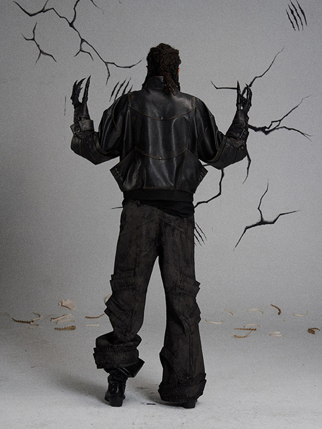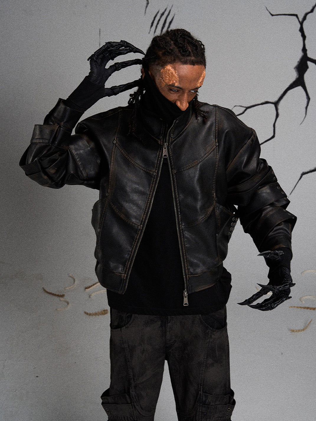 FLYERRER introduces a blue leather jacket, reminiscent of a blood-soaked knight emerging from a muddy battlefield. The unusual stacking of the sleeves and the hardware decorations present a deconstructed armor design, while the multi-segmented body and the distressed leather finish further recreate the form of armor and the muddy battlefield environment.