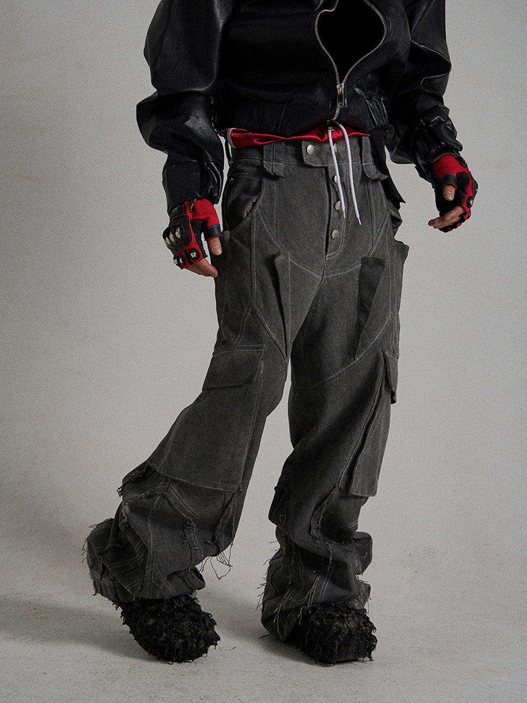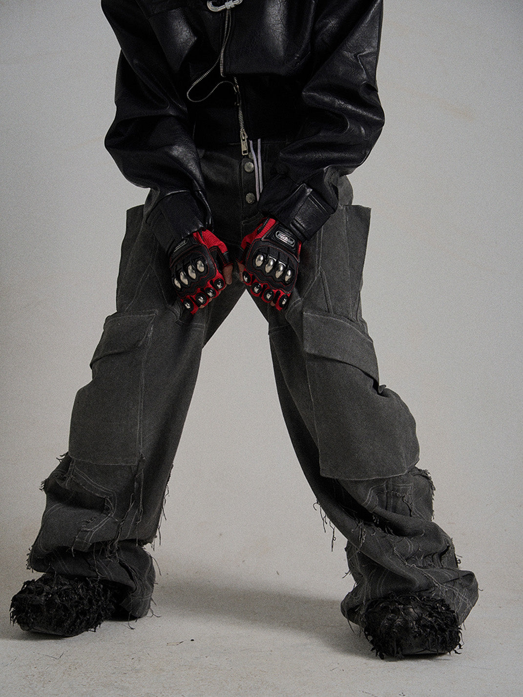 Flyerrer | Loose Fit Asymmetrical Patchwork Distressed Denim Pants コンテンツにスキップ