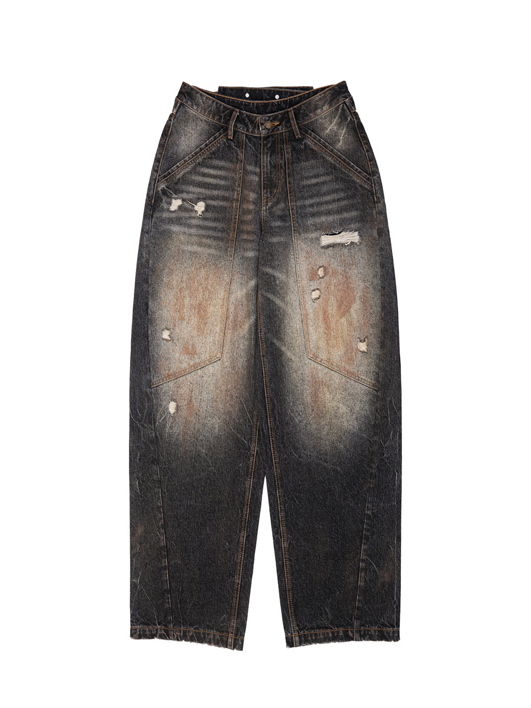 DOUBLEPUNCH | Distressed Mud-Dyed Low-Rise Curved Jeans