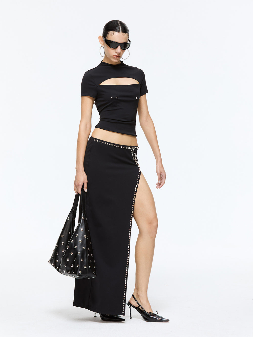 Latelylab | Low-Waisted Slit Studded Midi Skirt