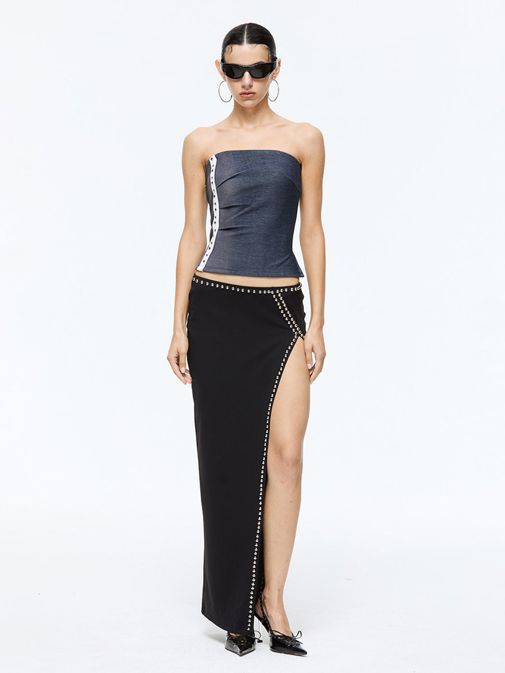 Latelylab | Low-Waisted Slit Studded Midi Skirt コンテンツにスキップ