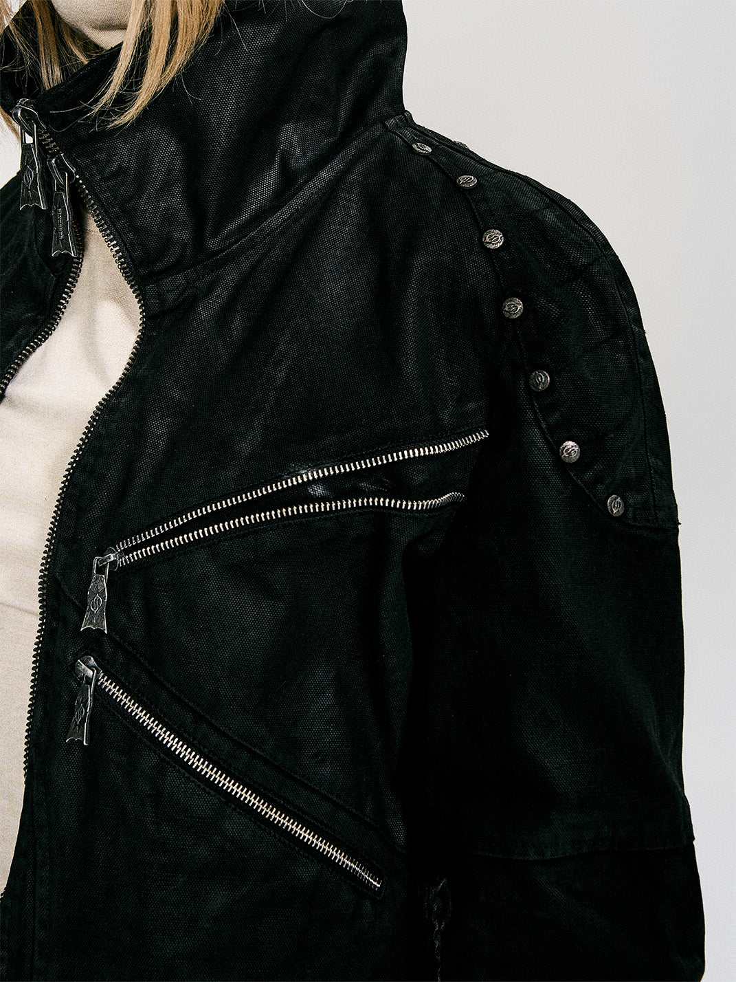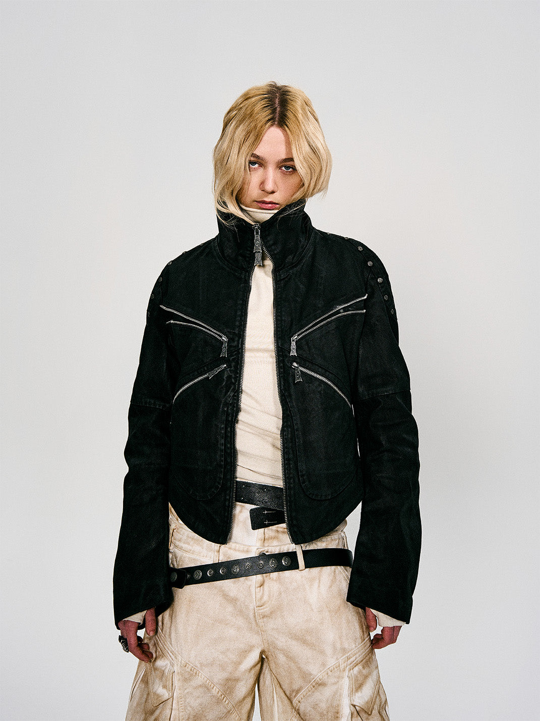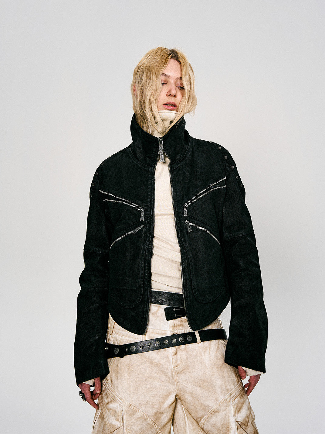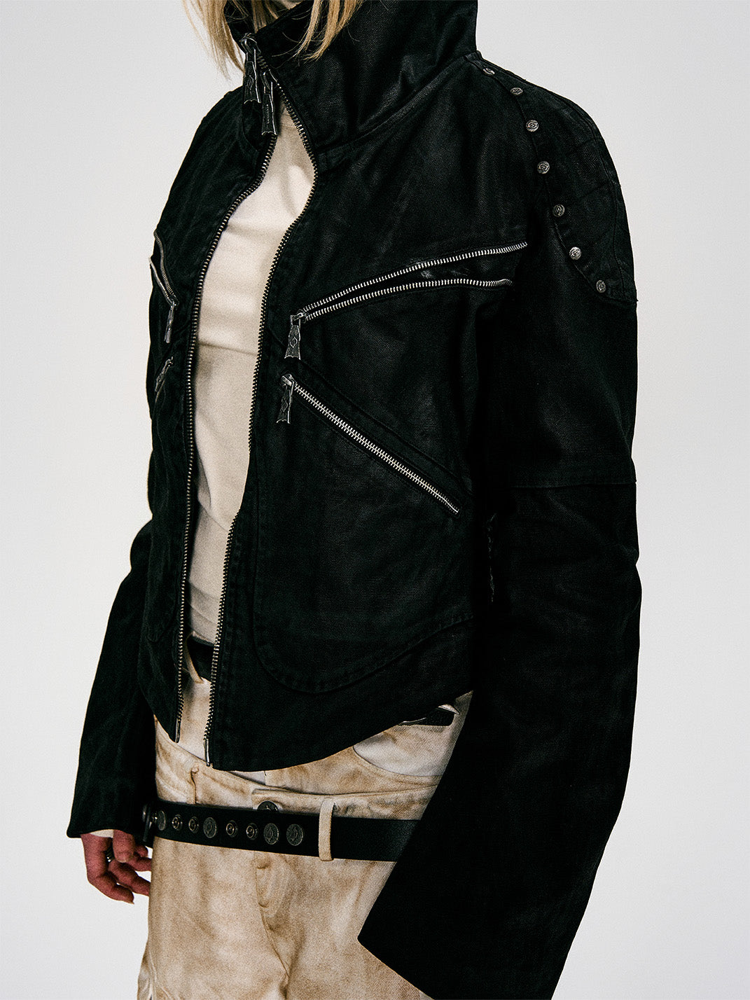FLYERRER's 25SS collection introduces this season's pieces with a completely new design language. The canvas fabric, combined with a waxed finish, adds a stronger textural texture to this armor jacket. The high-neck, fitted waist, and curved sleeves create a more visually striking silhouette. The X-shaped zipper on the chest is also a first for this collection, and the stitching and studs on the shoulders enhance the armor-like feel of the garment.