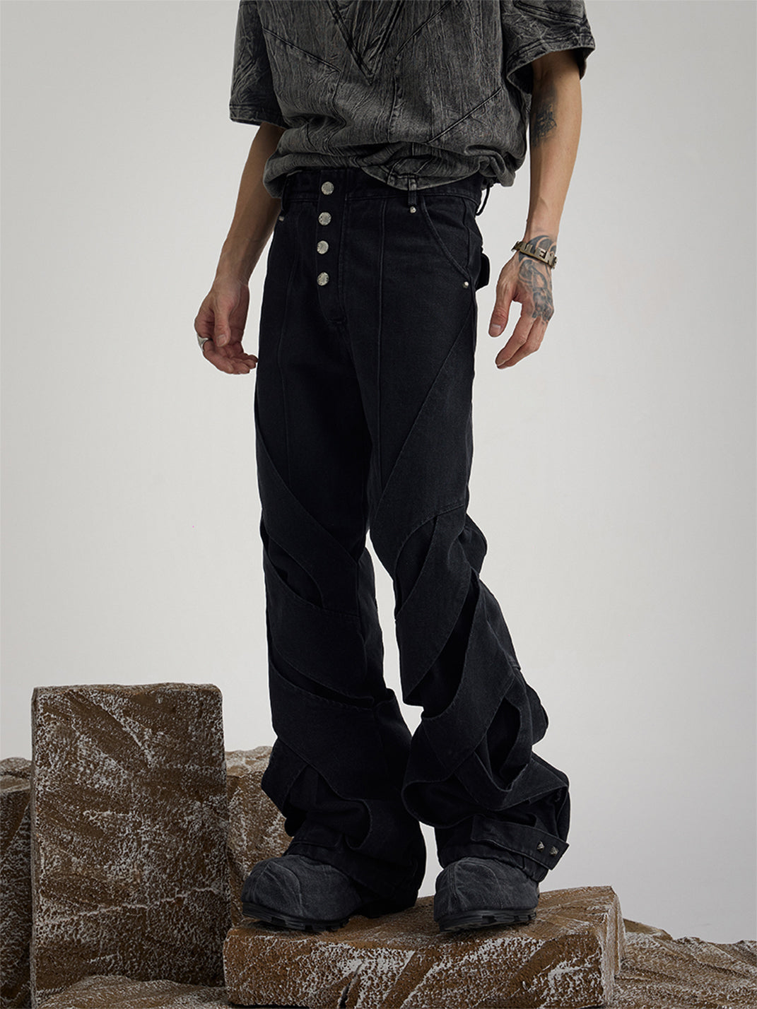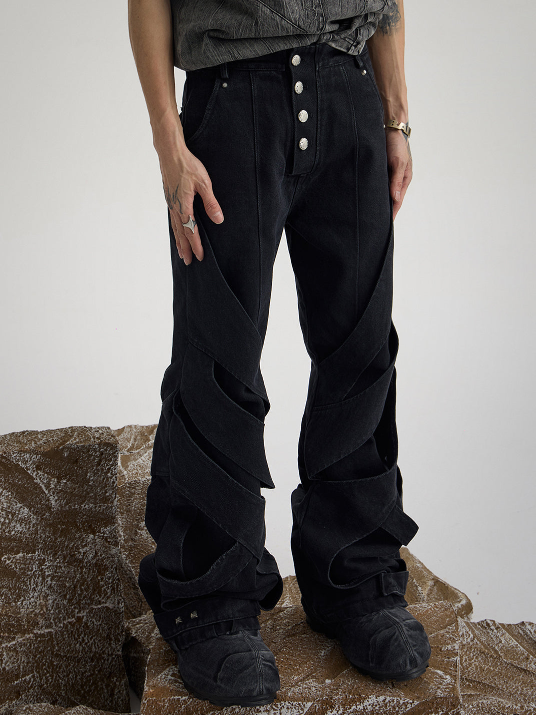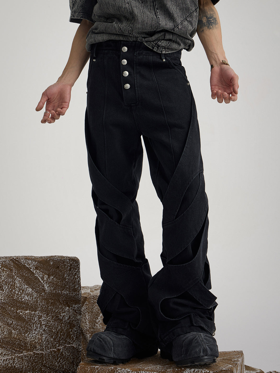 Inspired by the feeling of being "bound hand and foot," the dual sense of structure and the pants themselves further combines performance art and clothing, much like how people's offline lives are controlled by various factors, making it "difficult to move an inch."
