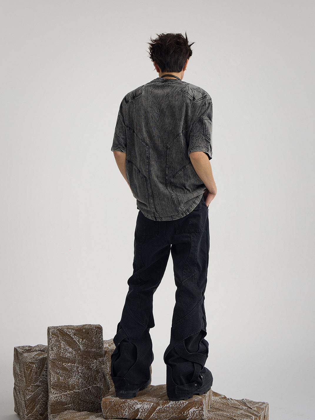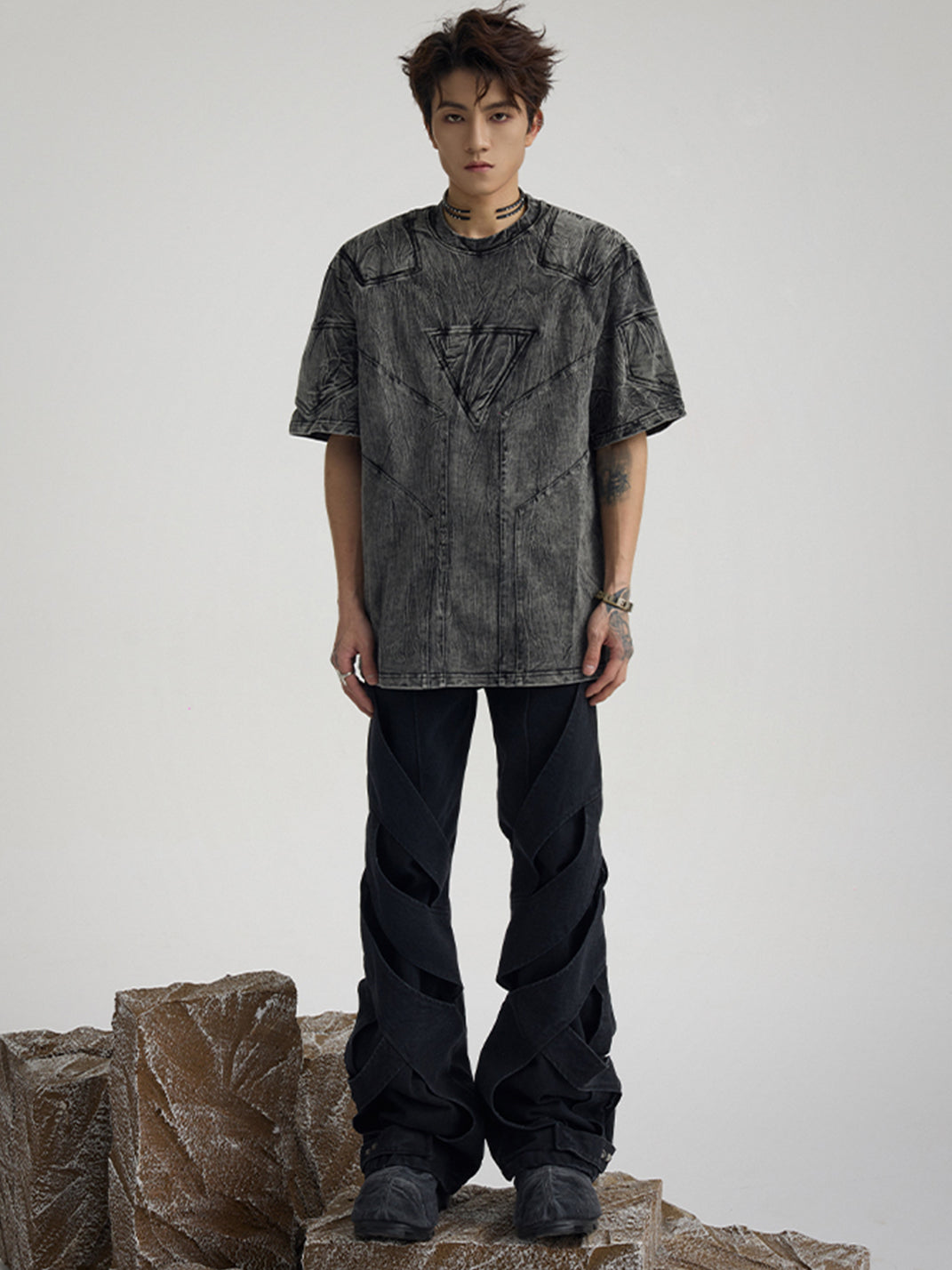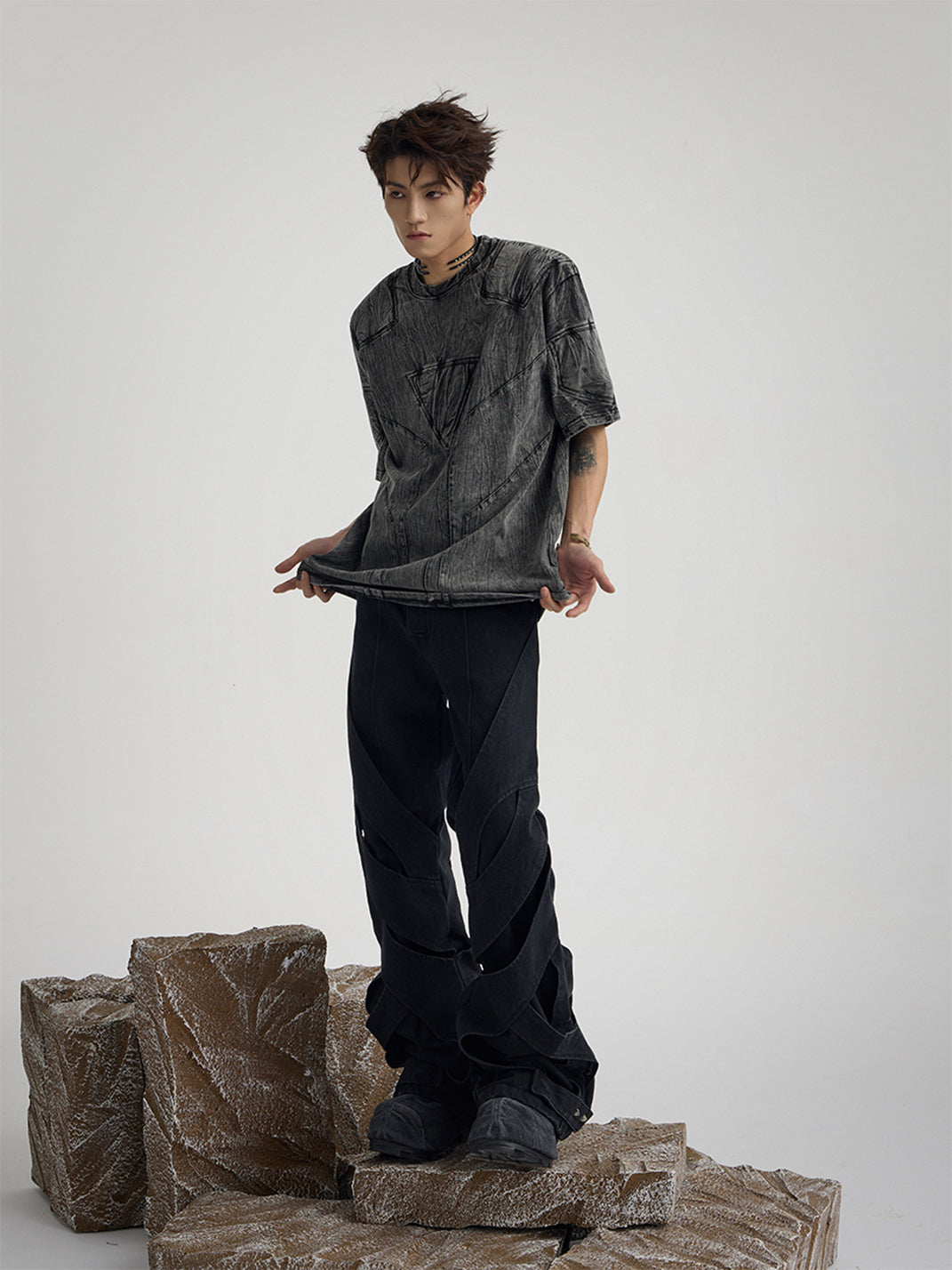 Inspired by the feeling of being "bound hand and foot," the dual sense of structure and the pants themselves further combines performance art and clothing, much like how people's offline lives are controlled by various factors, making it "difficult to move an inch."