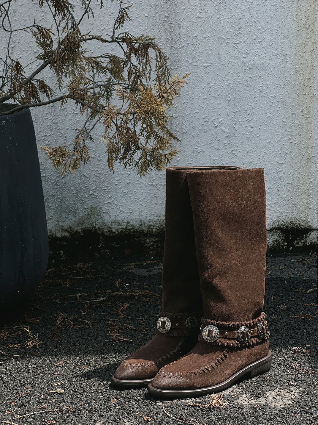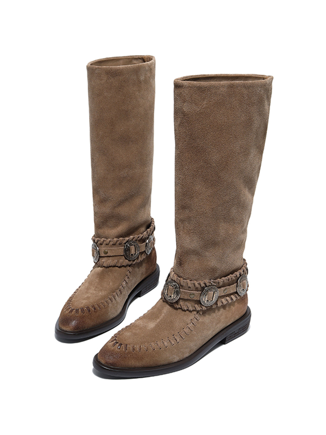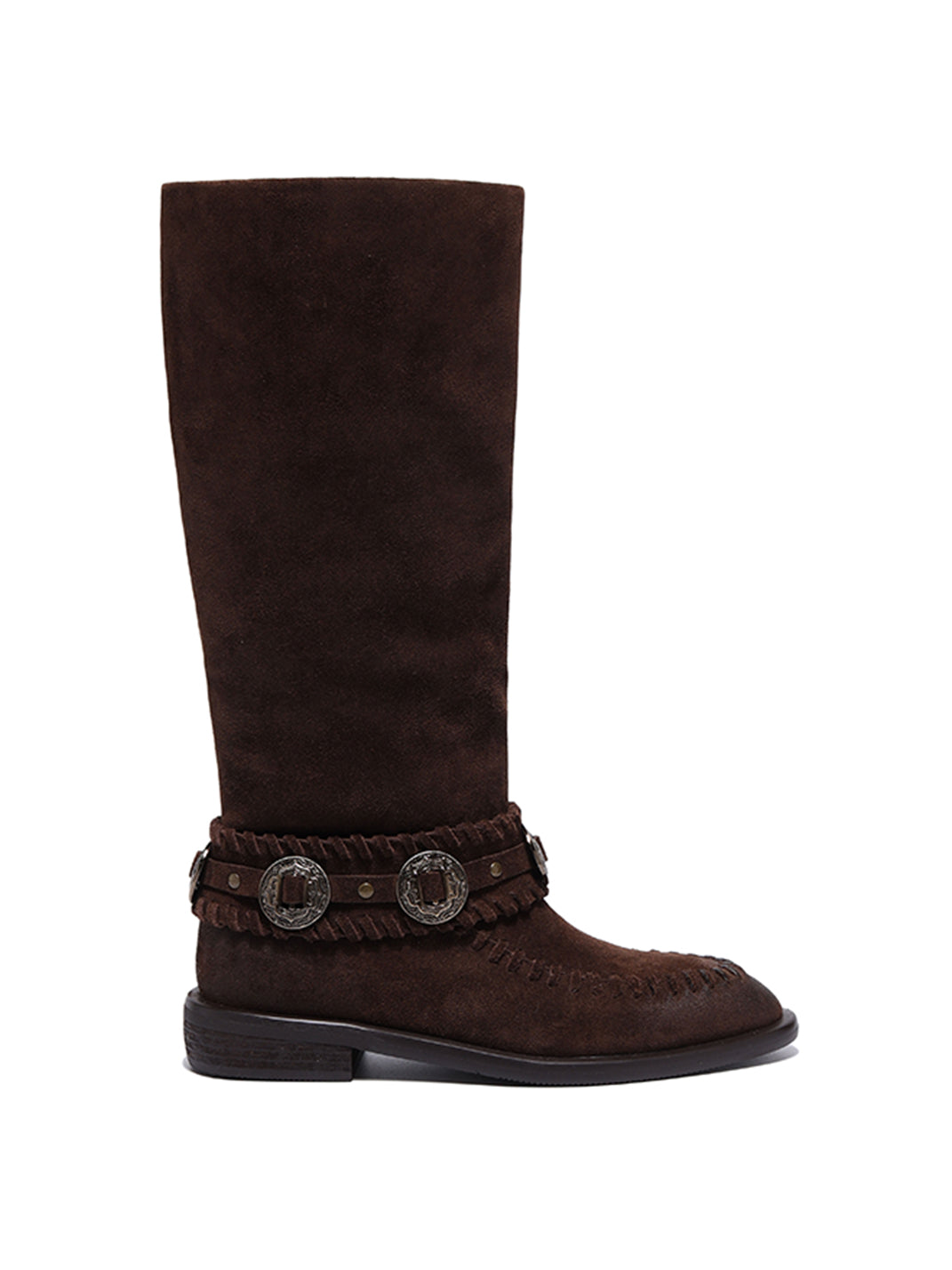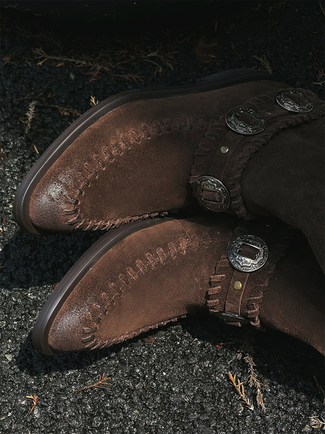 GSL | Retro Western High Shaft Suede Boots with Metal Buckles