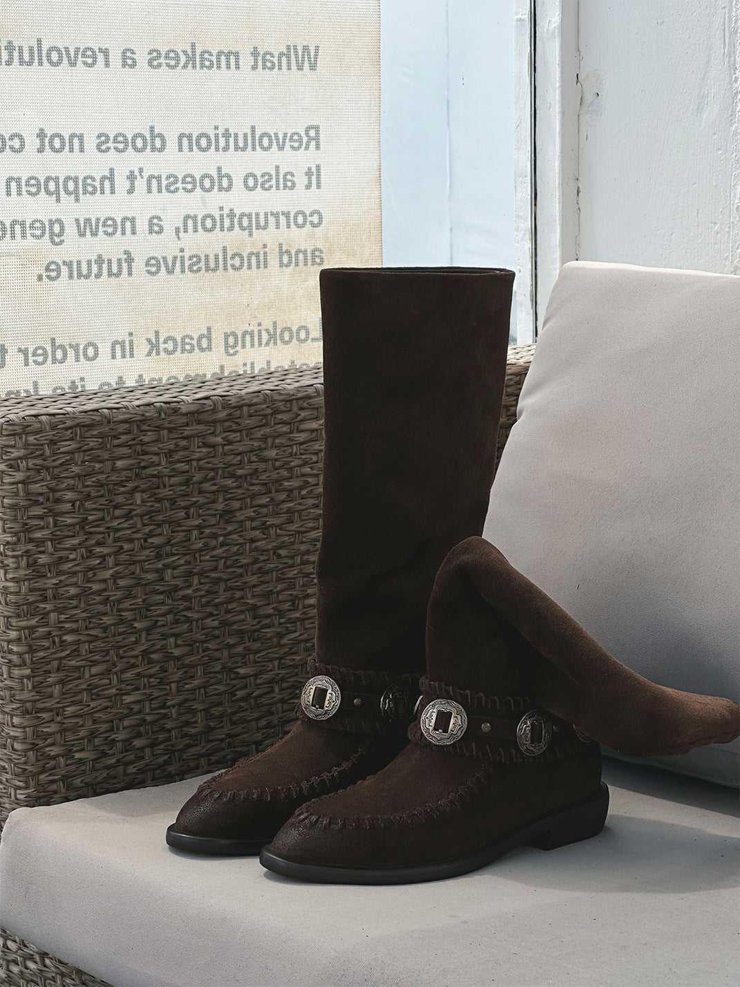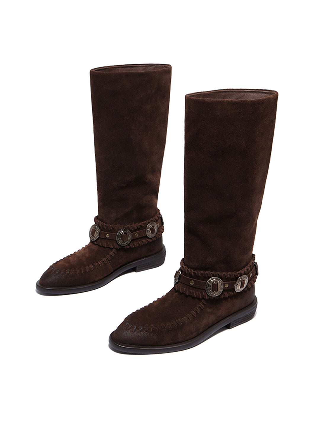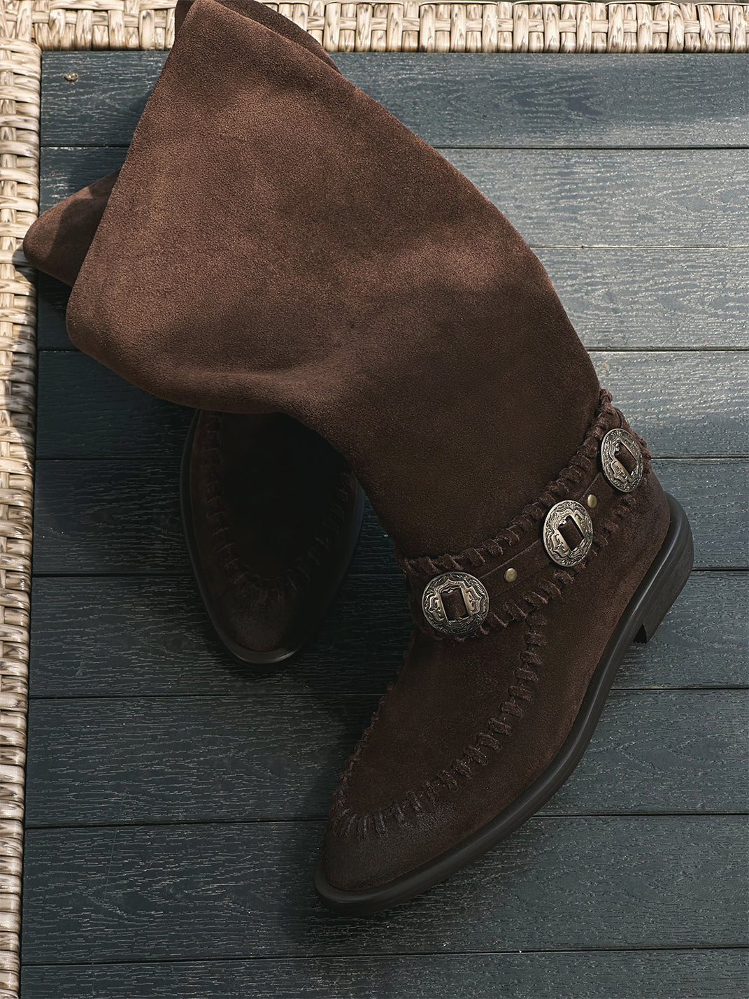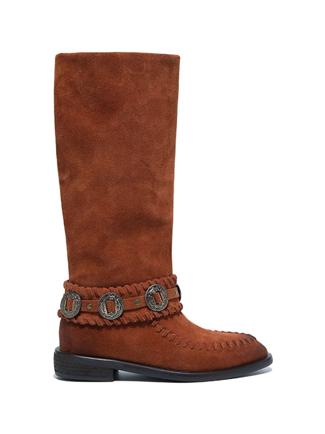 GSL | Retro Western High Shaft Suede Boots with Metal Buckles