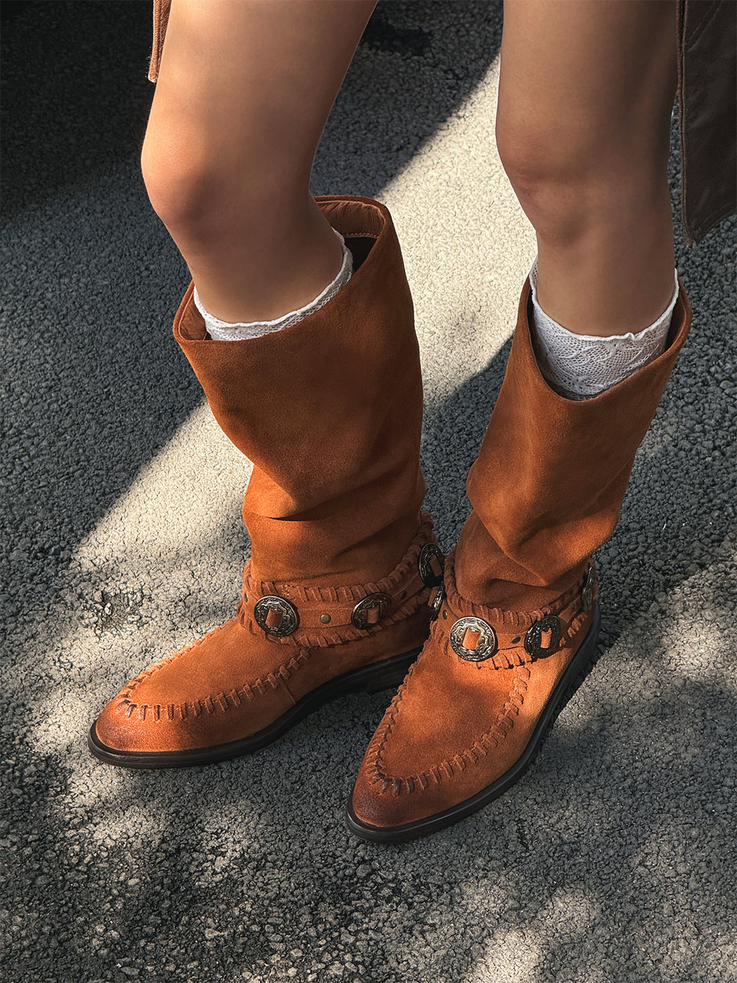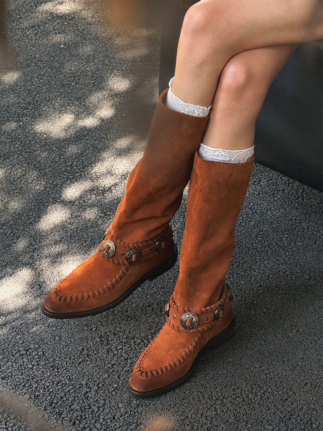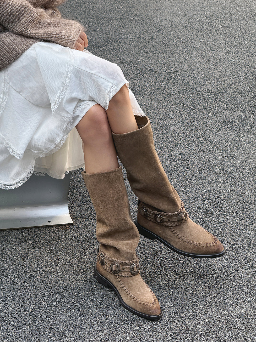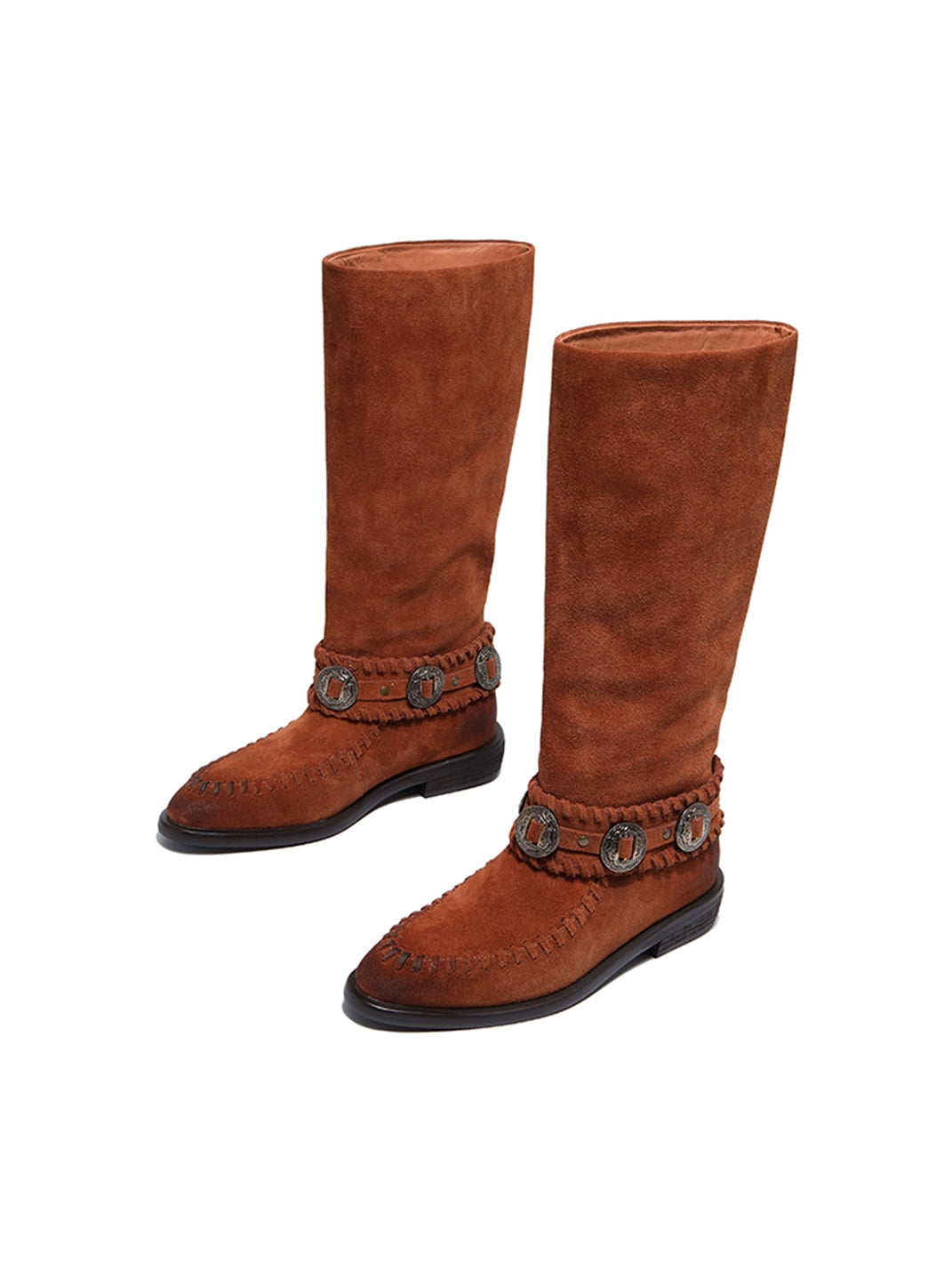 GSL | Retro Western High Shaft Suede Boots with Metal Buckles