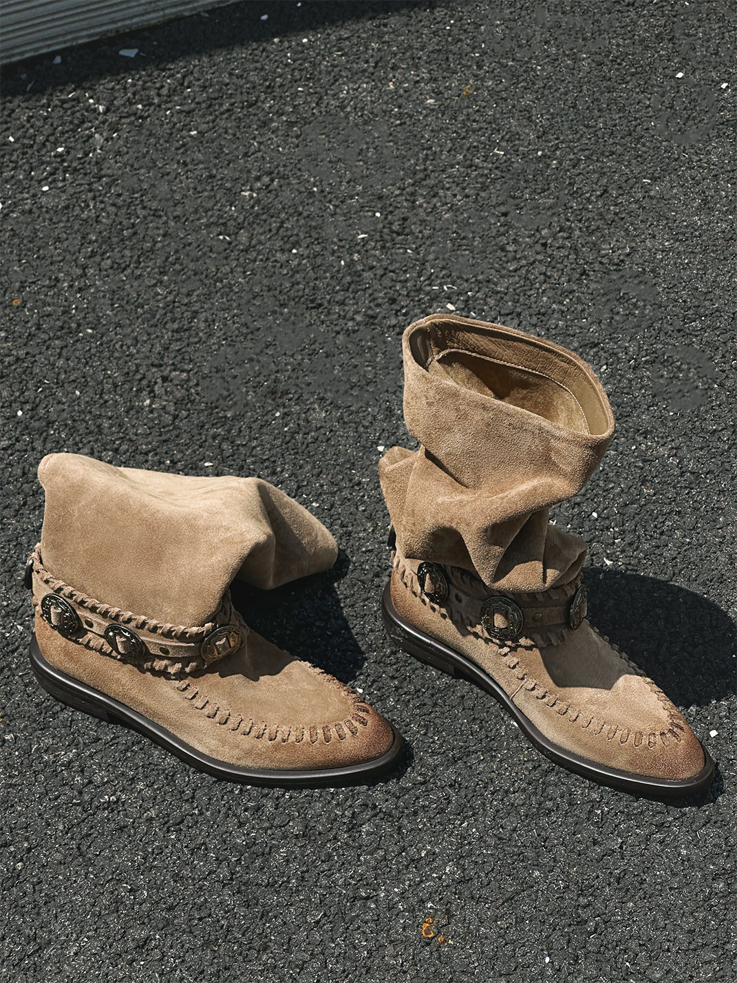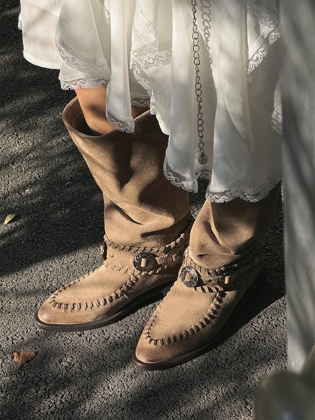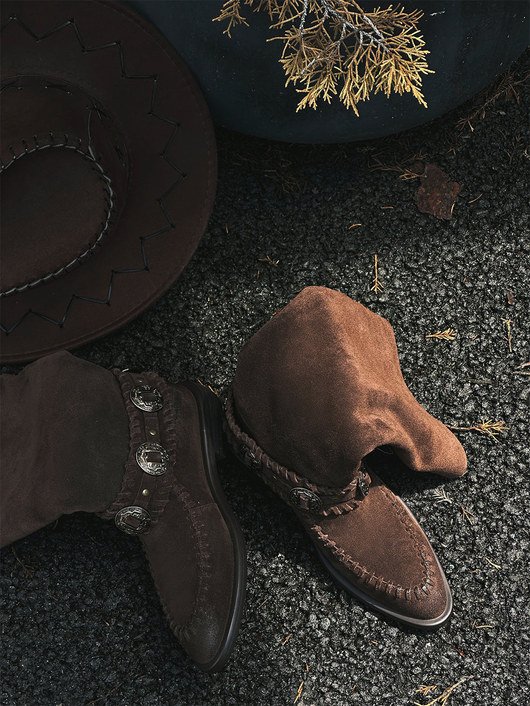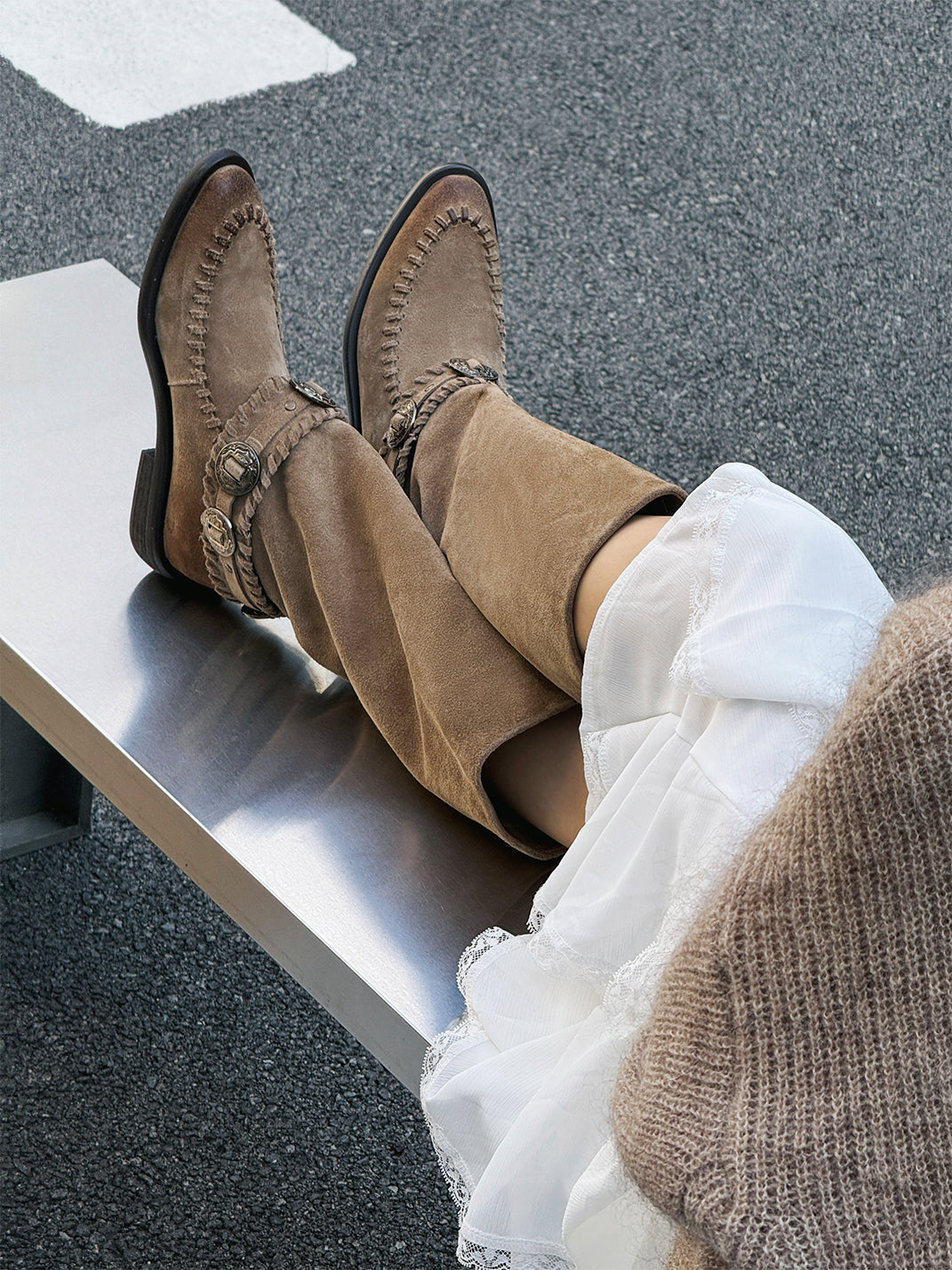 GSL | Retro Western High Shaft Suede Boots with Metal Buckles