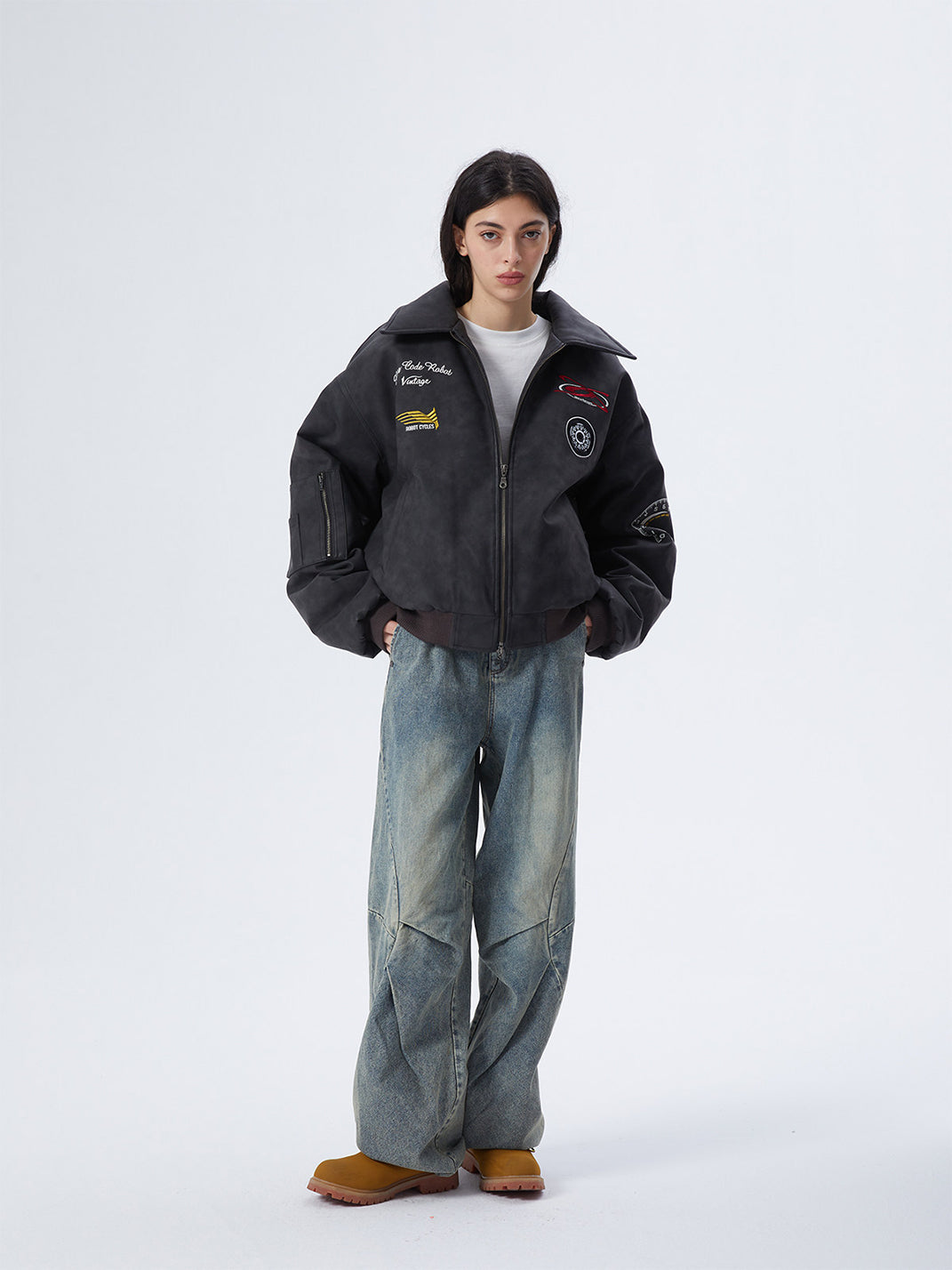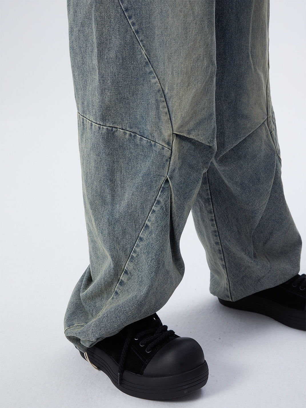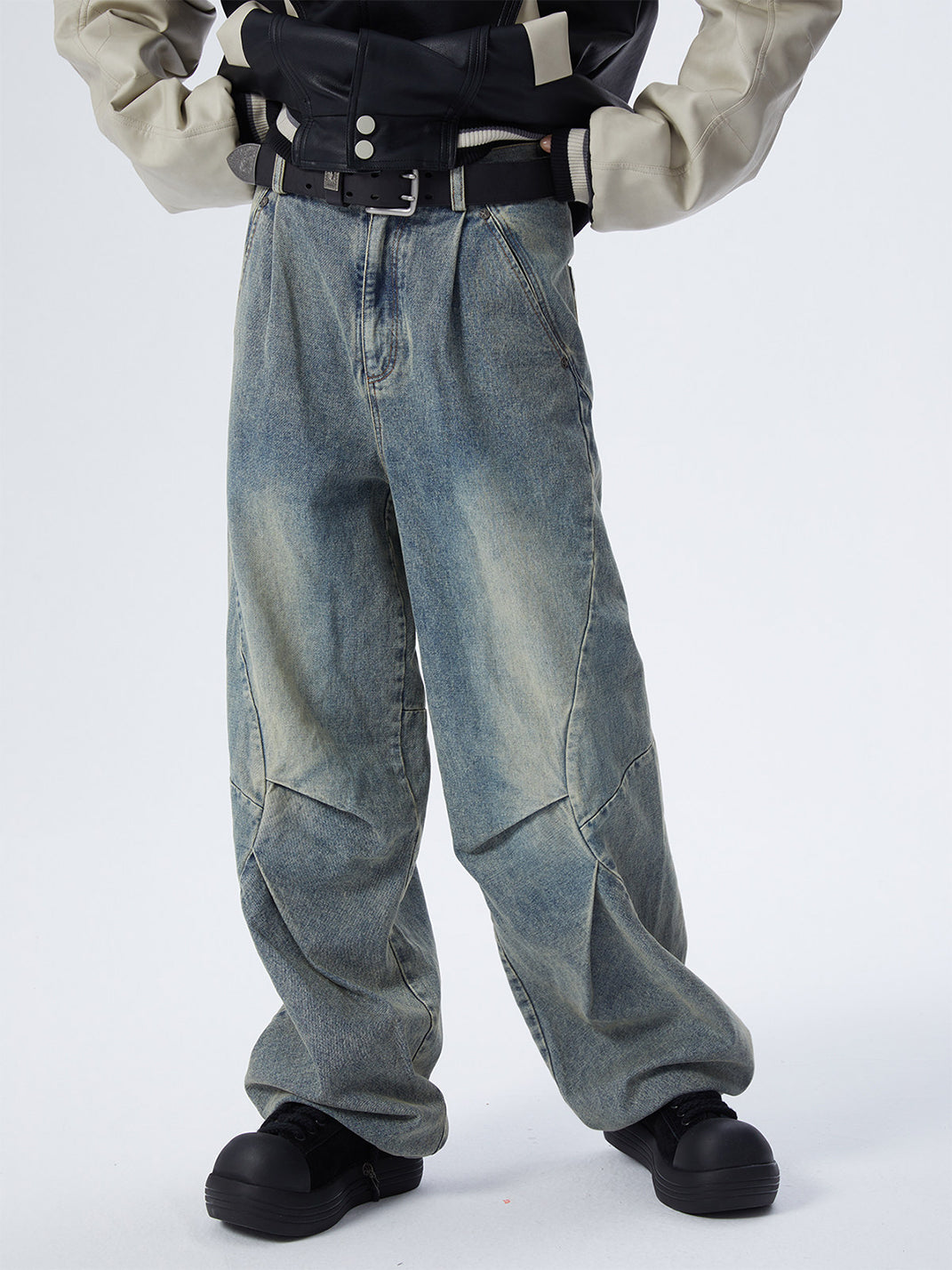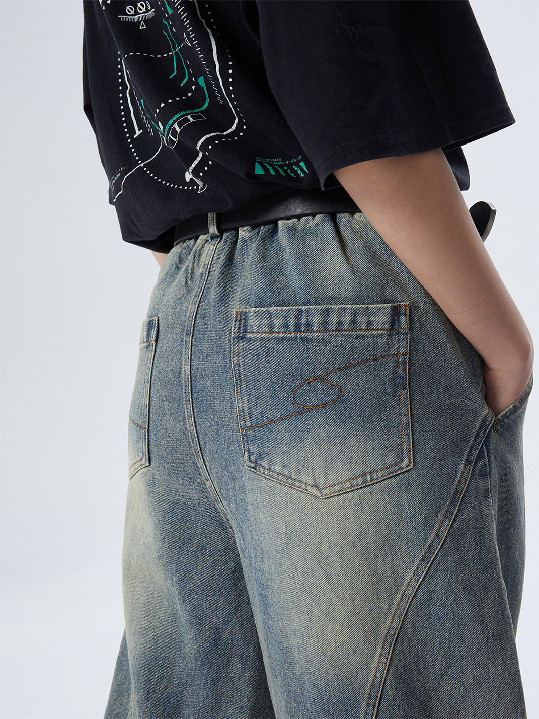 Denim washed and distressed finish, loose straight leg, elastic waistband suitable for most body types, special cut and pleated design.