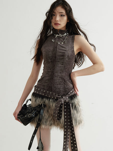 Jnylon Studios | Studded Fur Turtleneck Vest Dress