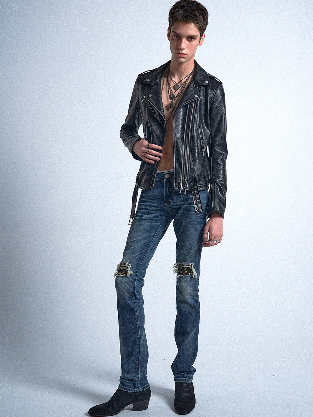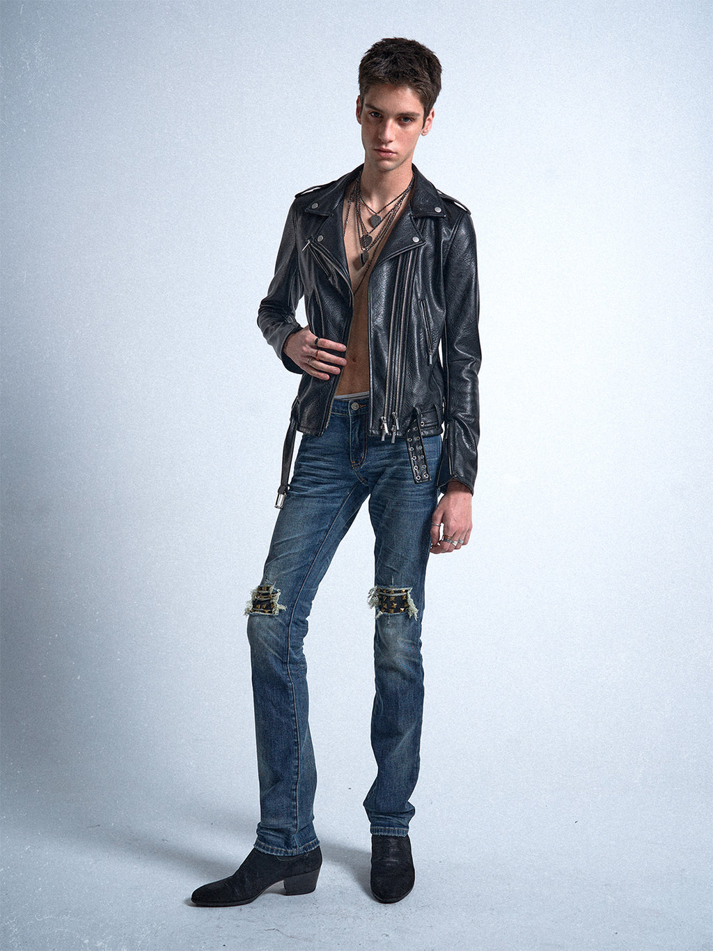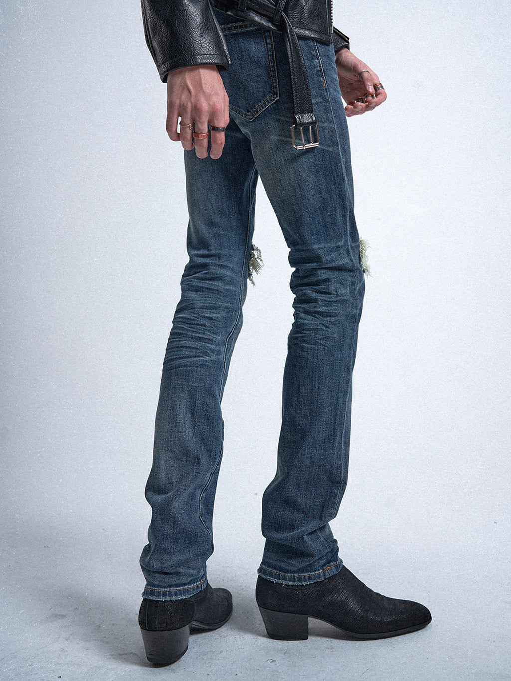 noEmosen | Distressed Patchwork Denim Jeans With Rivets On Both Knees コンテンツにスキップ