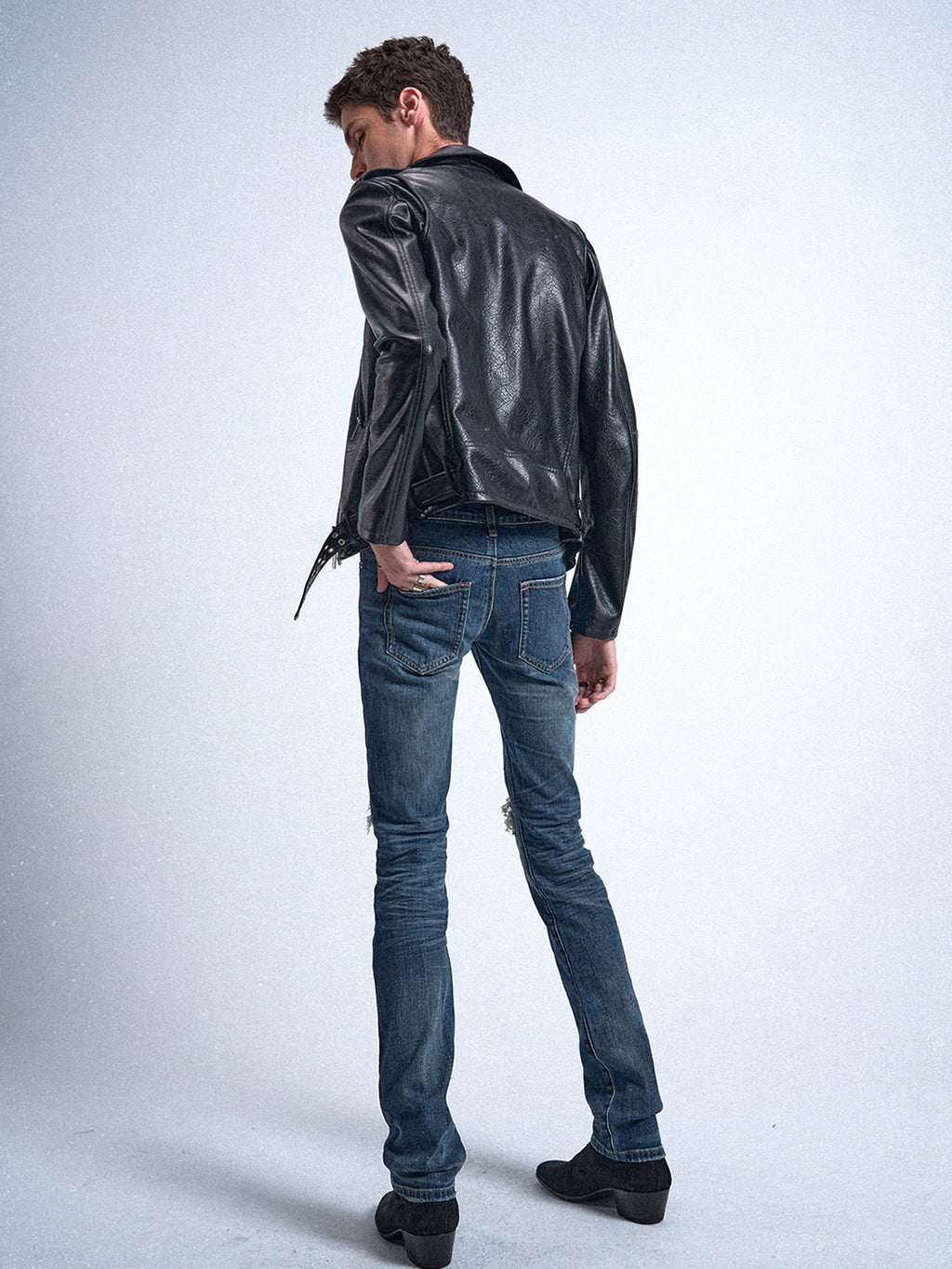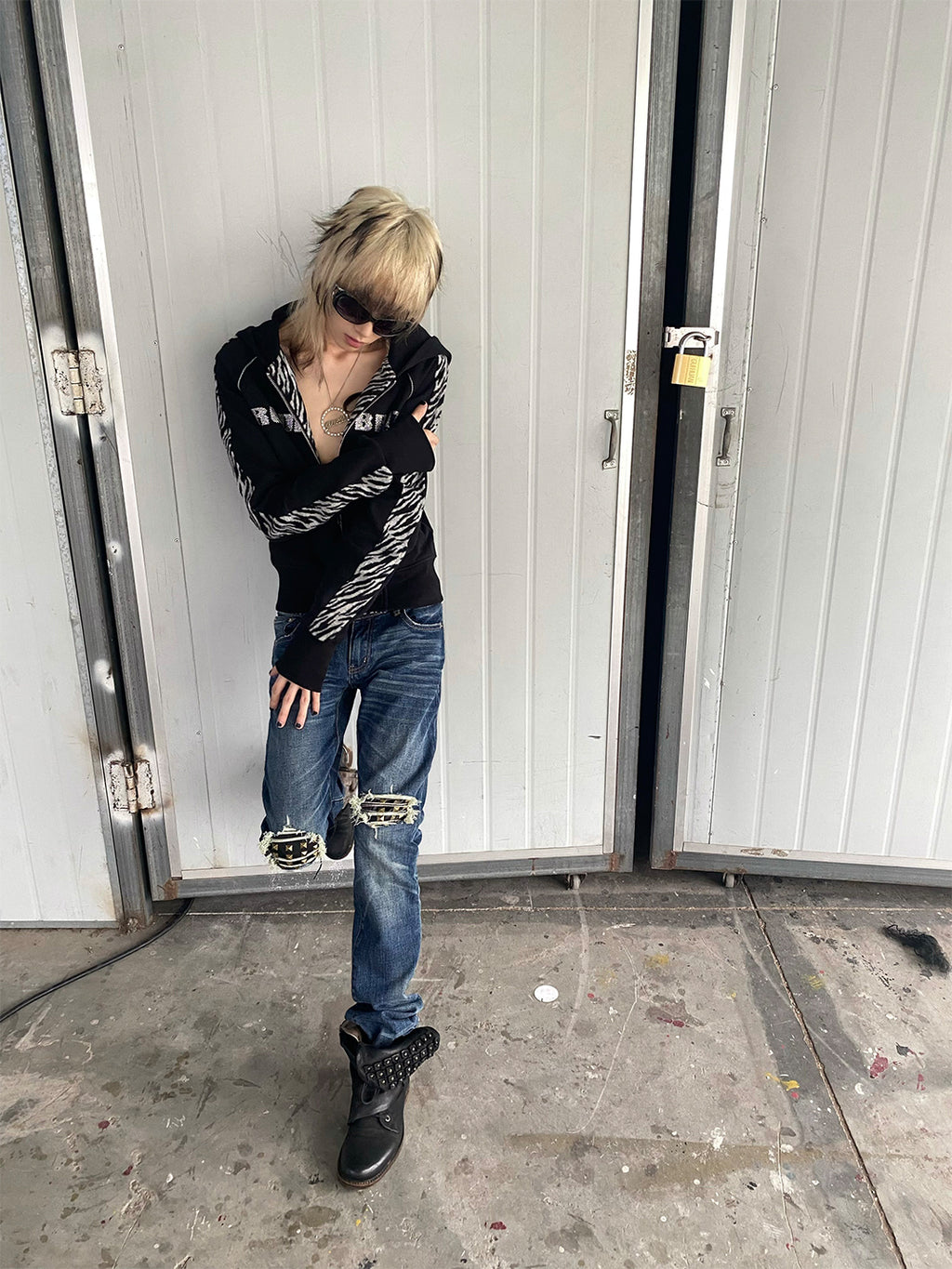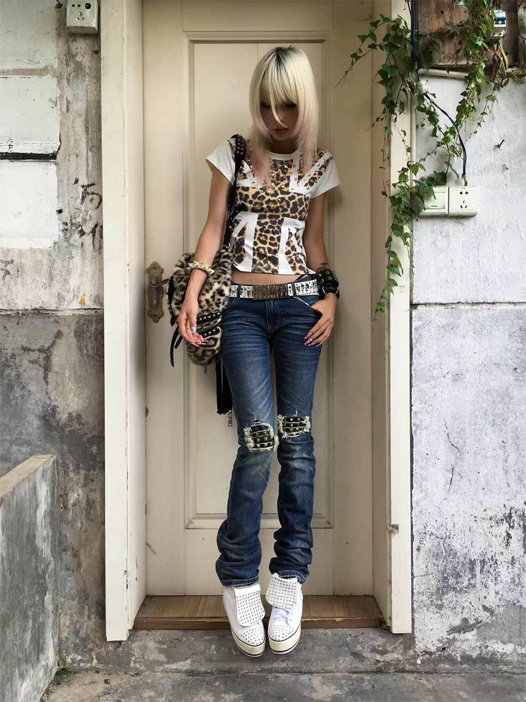 noEmosen | Distressed Patchwork Denim Jeans With Rivets On Both Knees コンテンツにスキップ