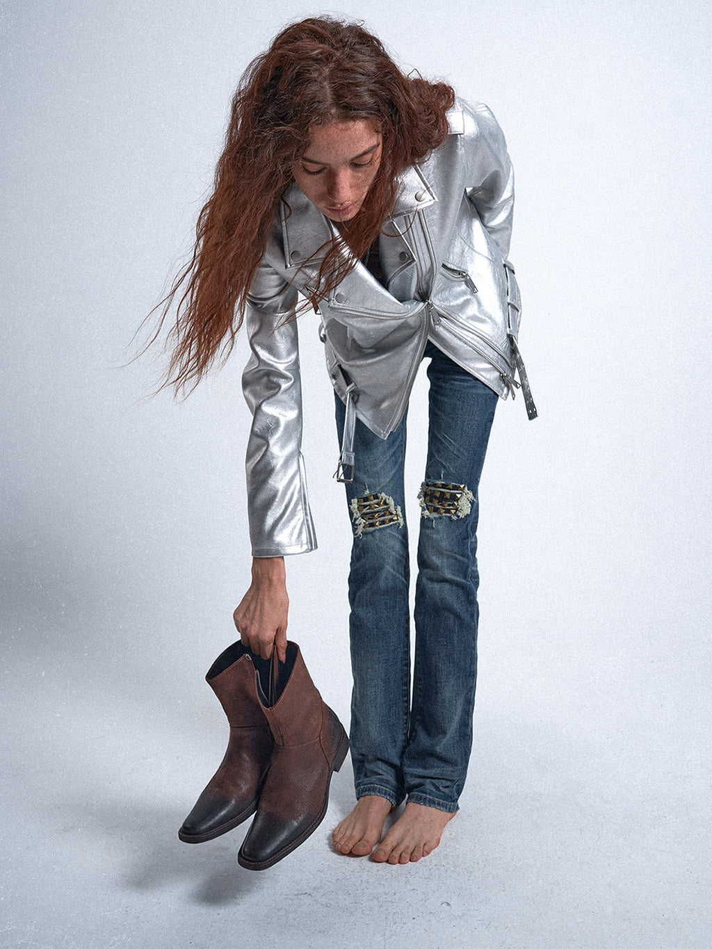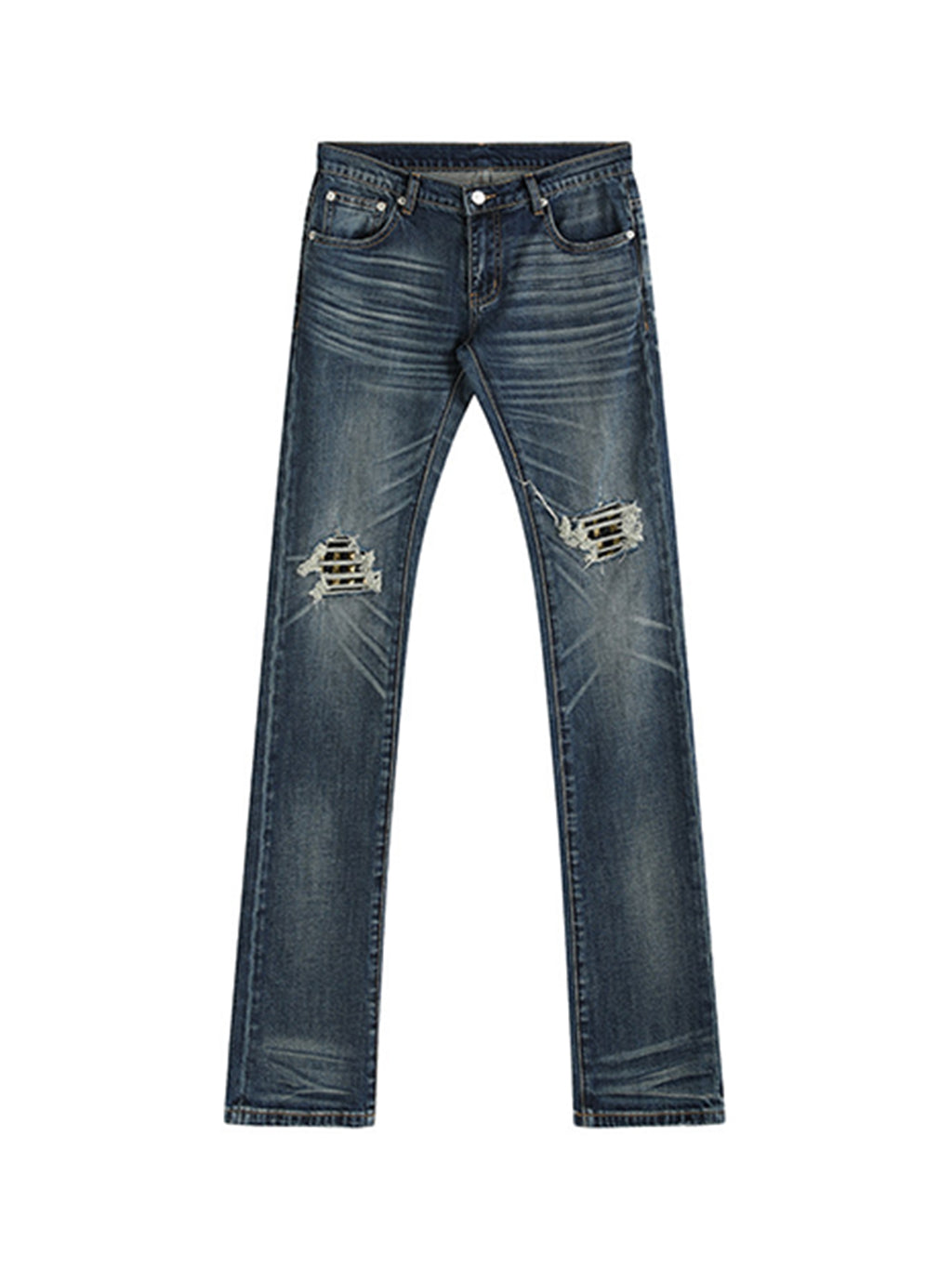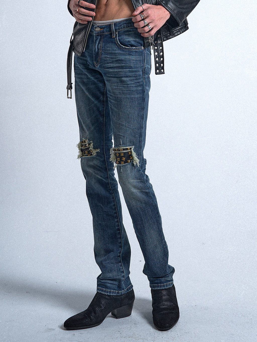 noEmosen | Distressed Patchwork Denim Jeans With Rivets On Both Knees