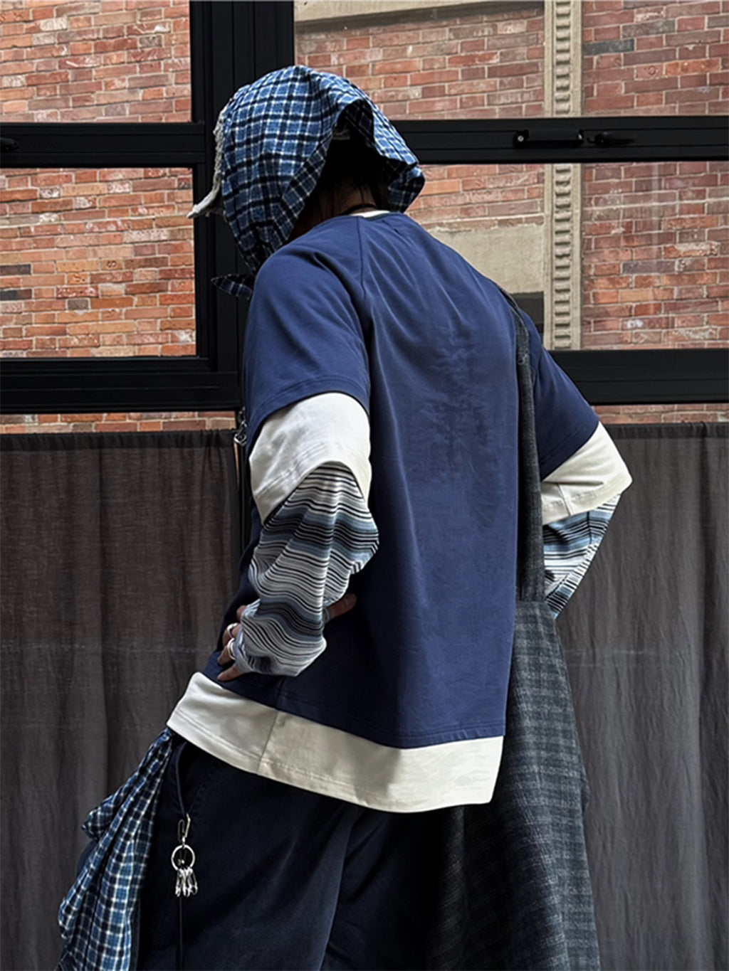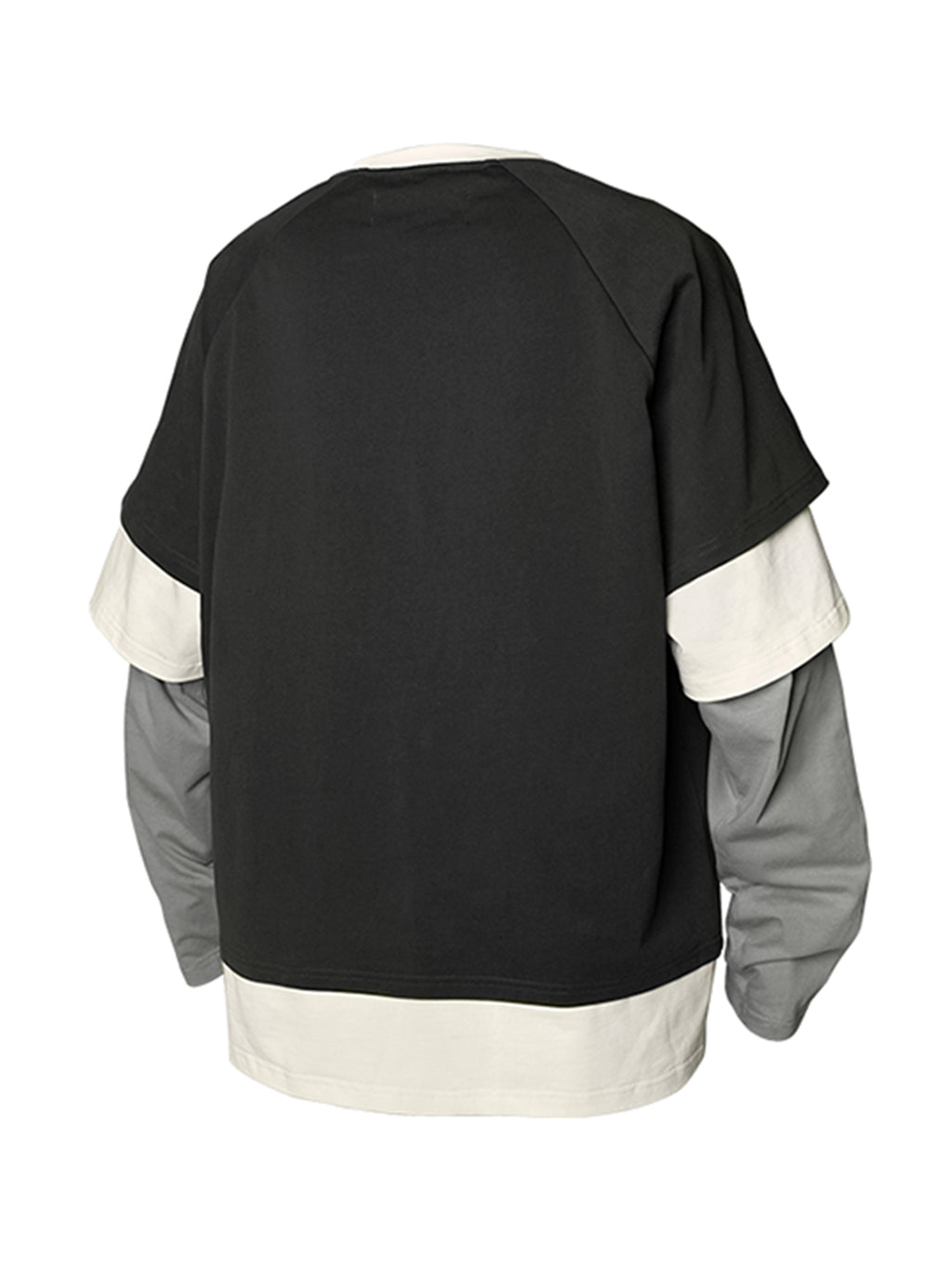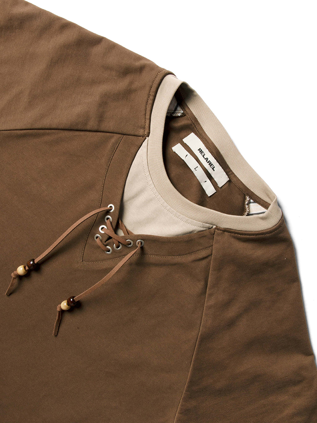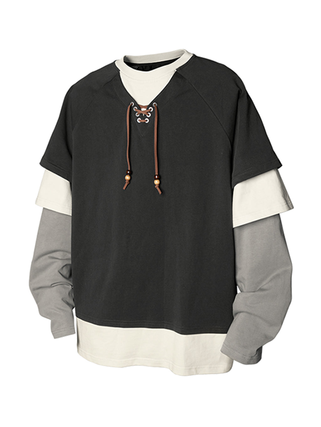 The Layered Lace-Up Sweatshirt merges sport-inspired detailing with a subversive DIY aesthetic. Built from premium 100% cotton fabric, the piece features a double-layered construction with contrasting sleeve and hem panels, creating the illusion of multiple garments. A lace-up V-neckline with grommets and bead-tipped cords brings in a rugged, tactile edge. The oversized silhouette further emphasizes the piece’s bold proportions and experimental streetwear identity.