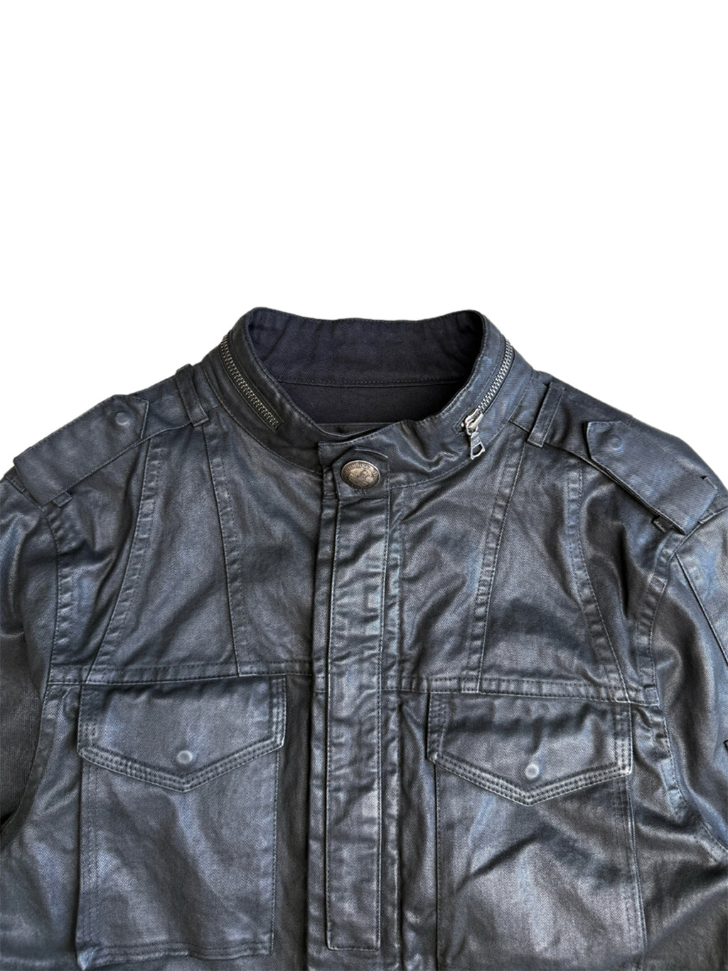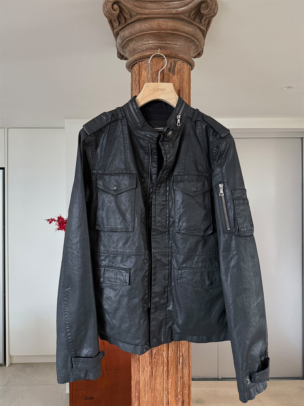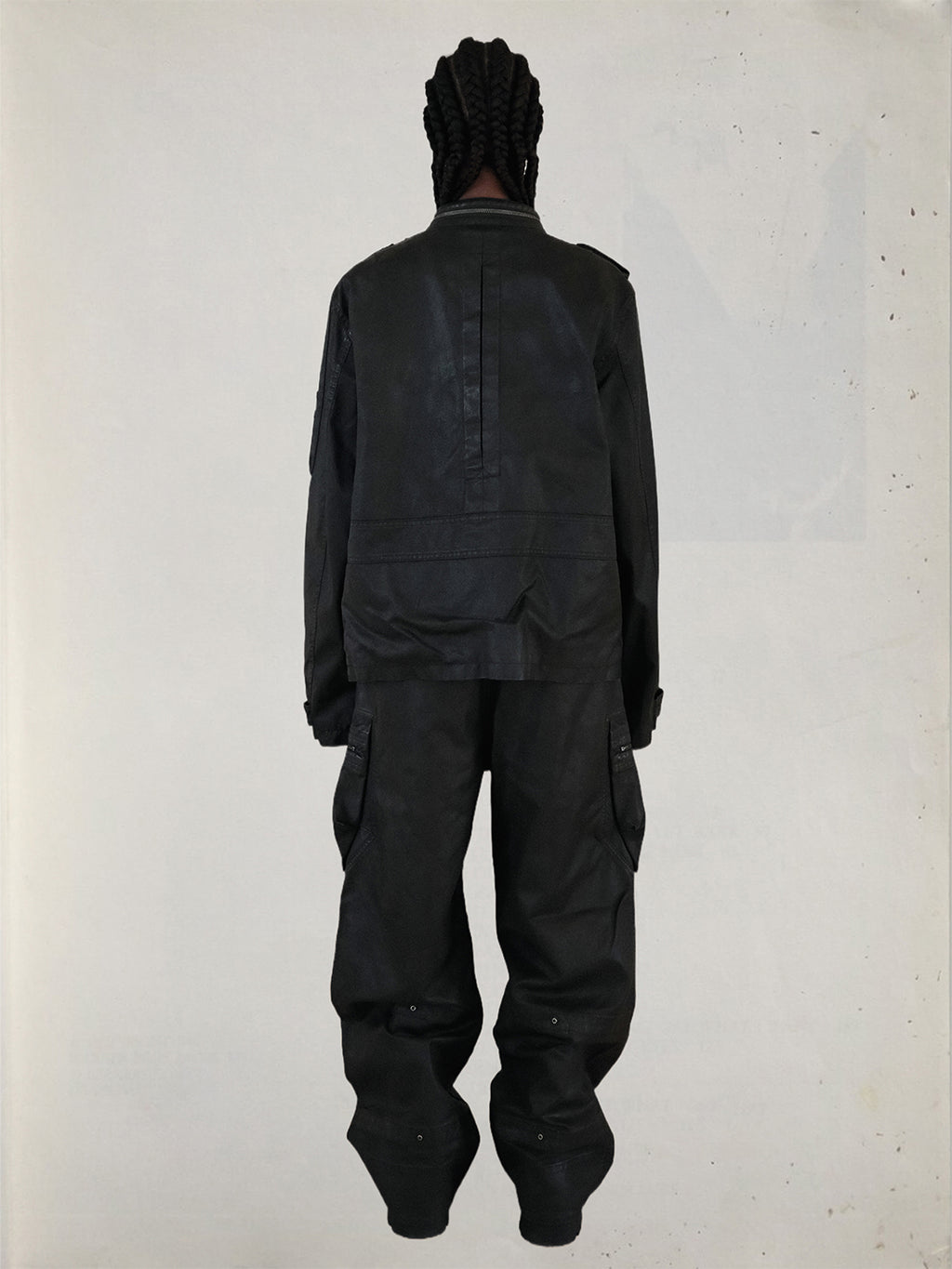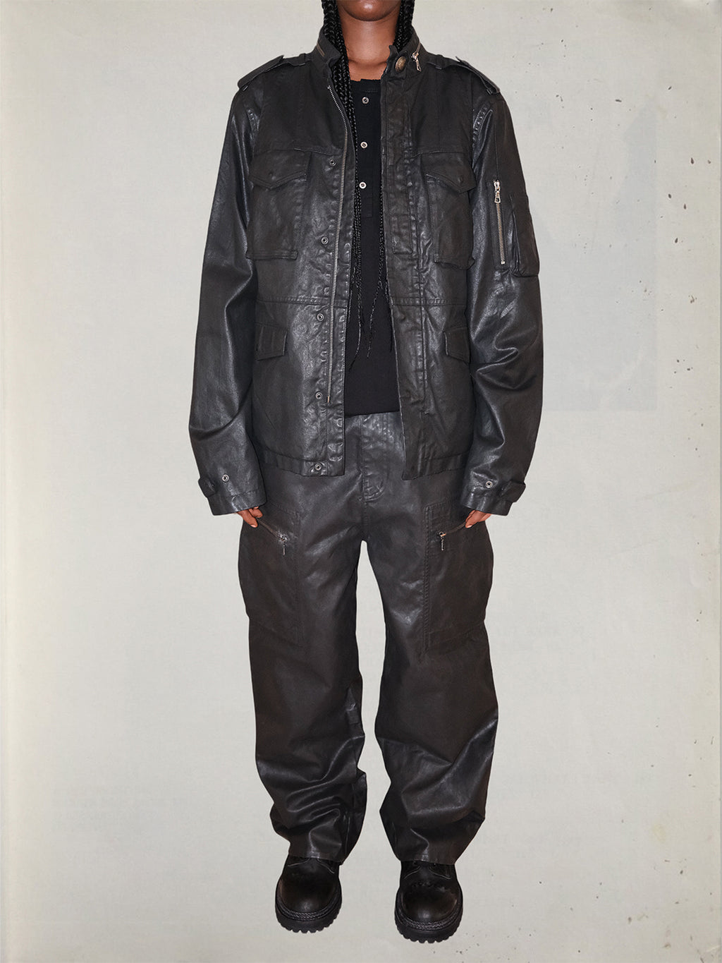 This 320g high-density cotton twill workwear fabric features a redesigned M65 Army jacket, transforming the original oversized silhouette into a fitted, sharp cut. Enhanced visual appeal is achieved through added lines and segmentation. The left sleeve incorporates a Ma1 flight jacket pocket with structural detailing. The collar is a short, biker-style design with a waxed finish, emphasizing the structure. A herringbone lining further accentuates the garment. The garment includes UNK's signature coin clasp, YKK distressed zippers, and YKK snap fasteners.