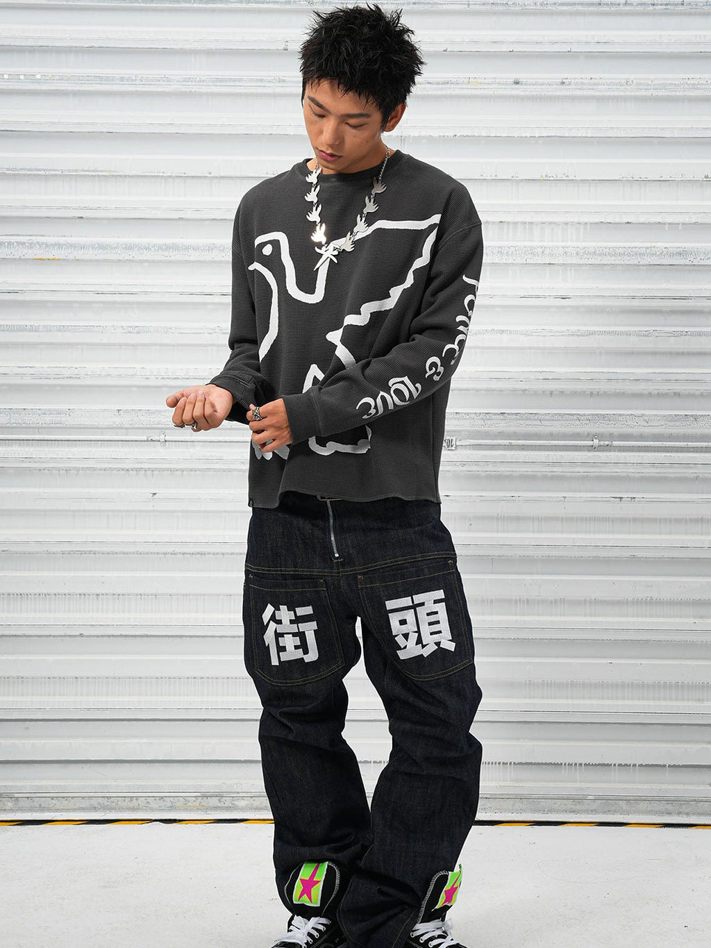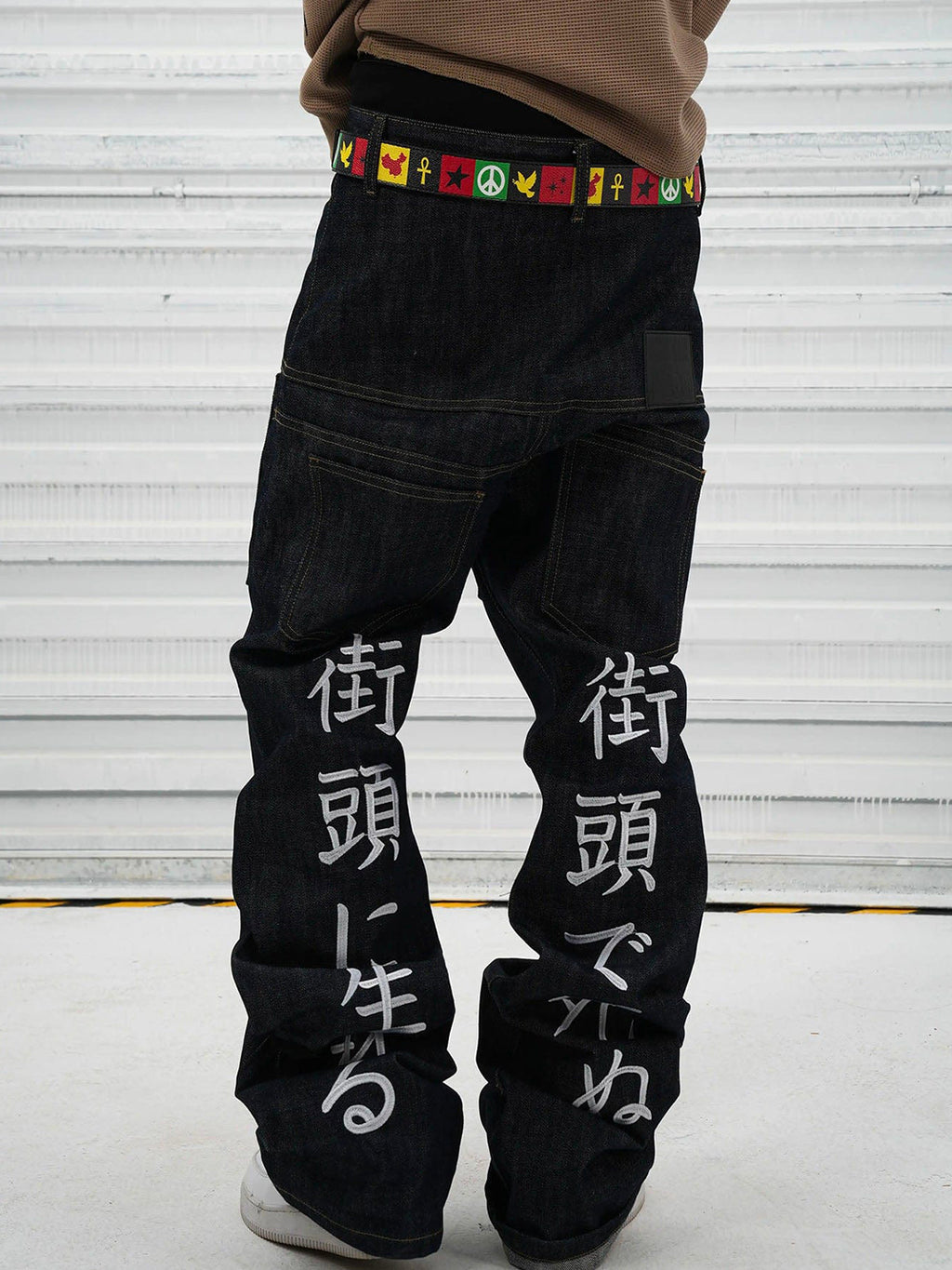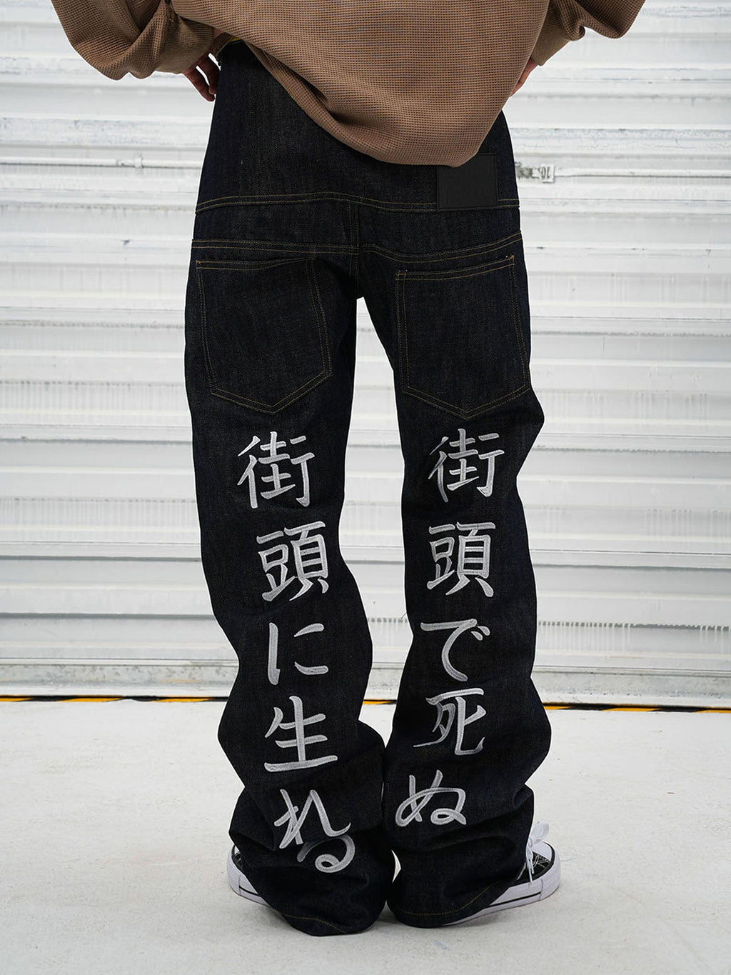 VINKID | Street Kanji Graphic Panel Raw Jeans コンテンツにスキップ
