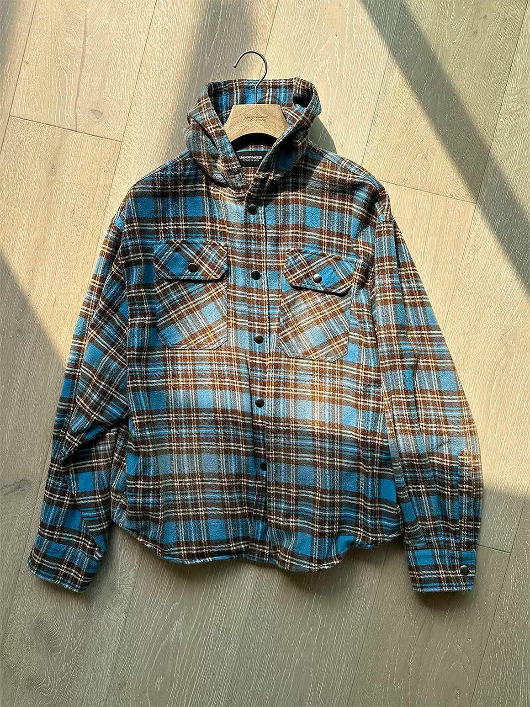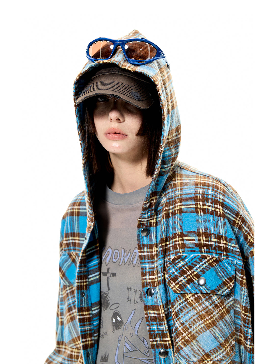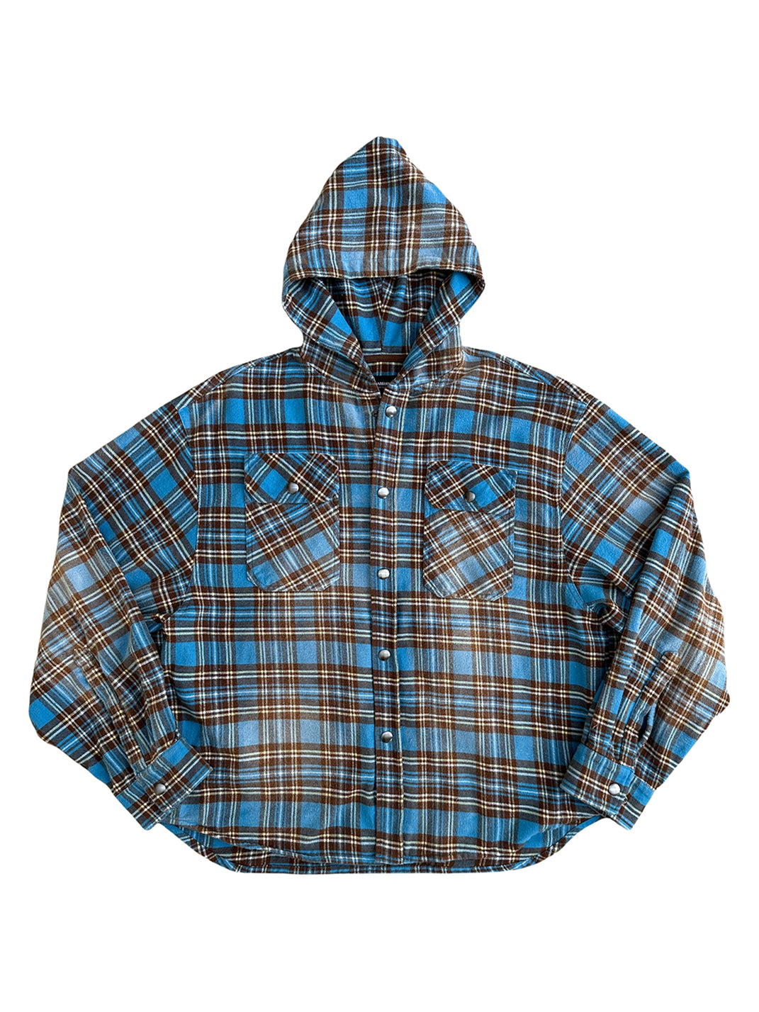 Crafted from 100% cotton flannel plaid, this piece features a gender-neutral oversized fit with a washed and faded finish, complete with brushed texture and vintage-inspired distressing. The hooded design highlights precise plaid matching, while flap chest pockets and side seam welt pockets enhance both utility and style. A curved hemline adds subtle movement to the silhouette, secured with premium YKK snap buttons for durability and refinement.