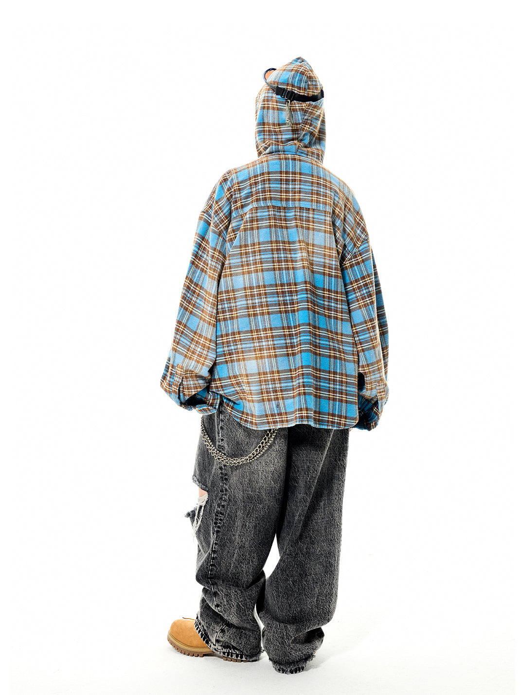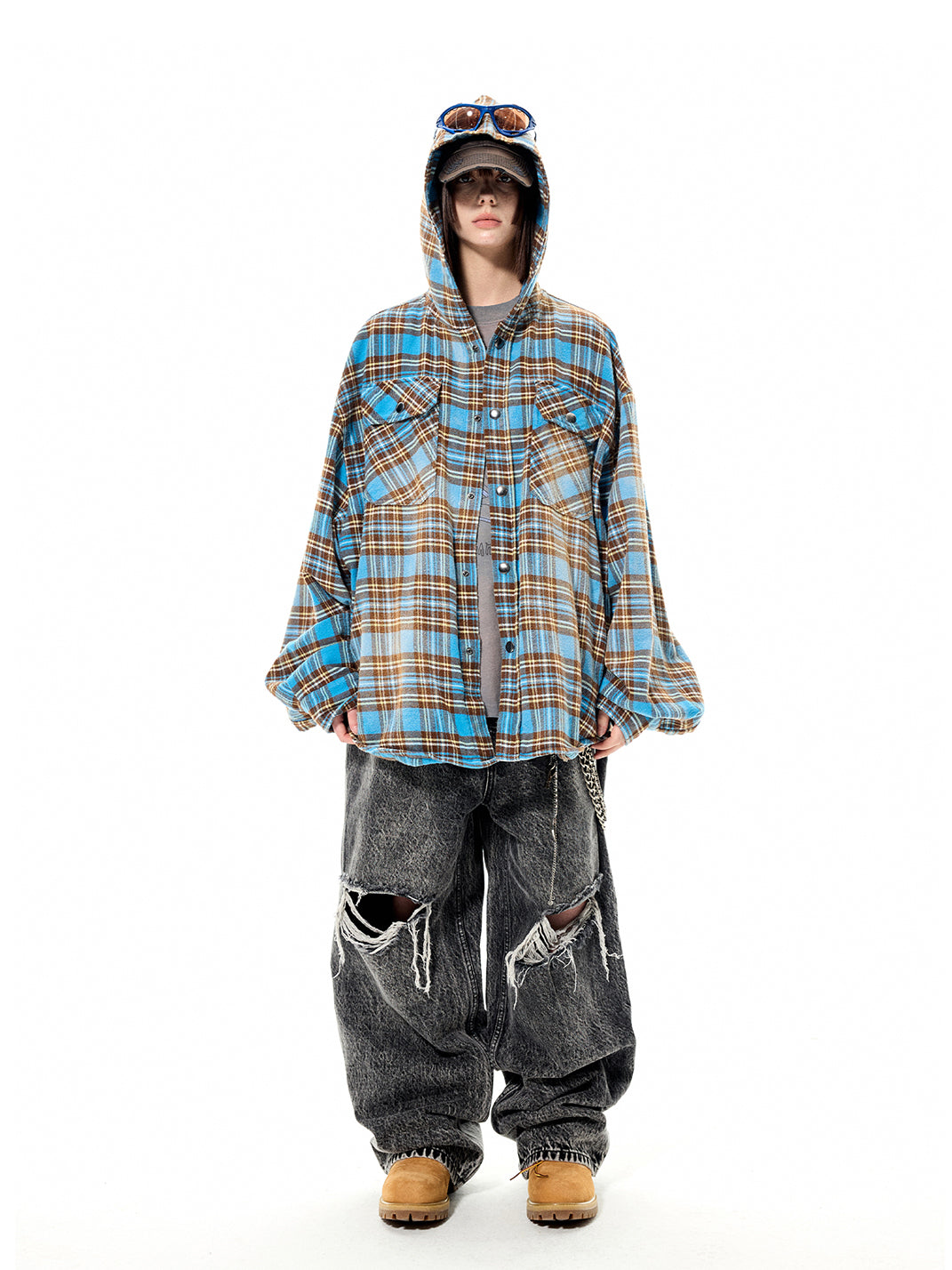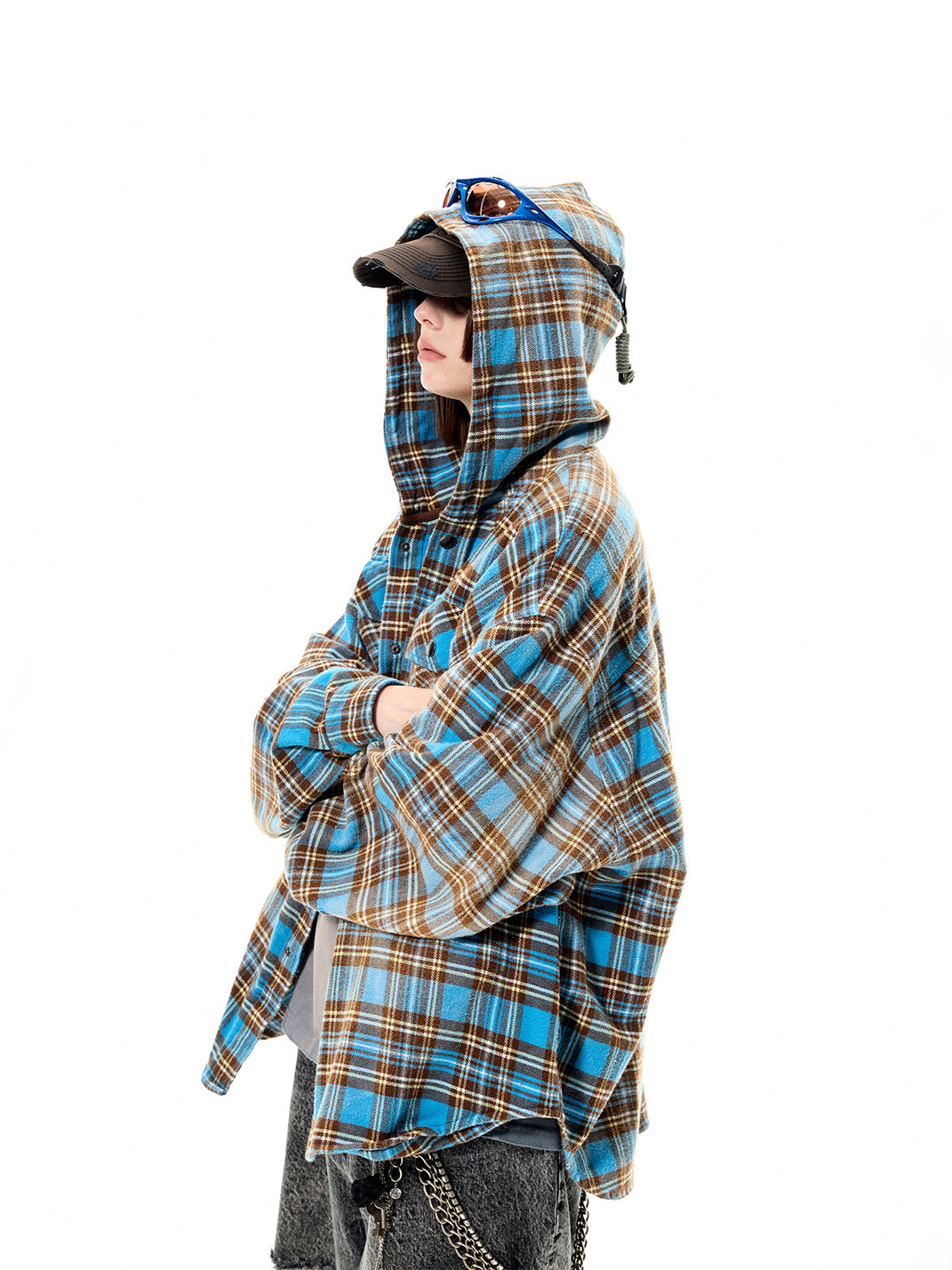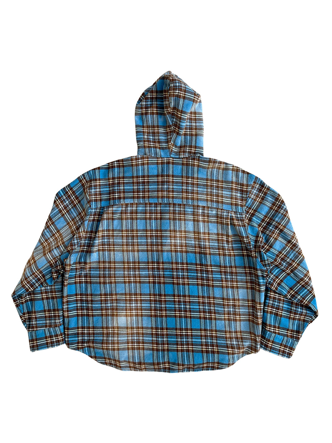 Crafted from 100% cotton flannel plaid, this piece features a gender-neutral oversized fit with a washed and faded finish, complete with brushed texture and vintage-inspired distressing. The hooded design highlights precise plaid matching, while flap chest pockets and side seam welt pockets enhance both utility and style. A curved hemline adds subtle movement to the silhouette, secured with premium YKK snap buttons for durability and refinement.
