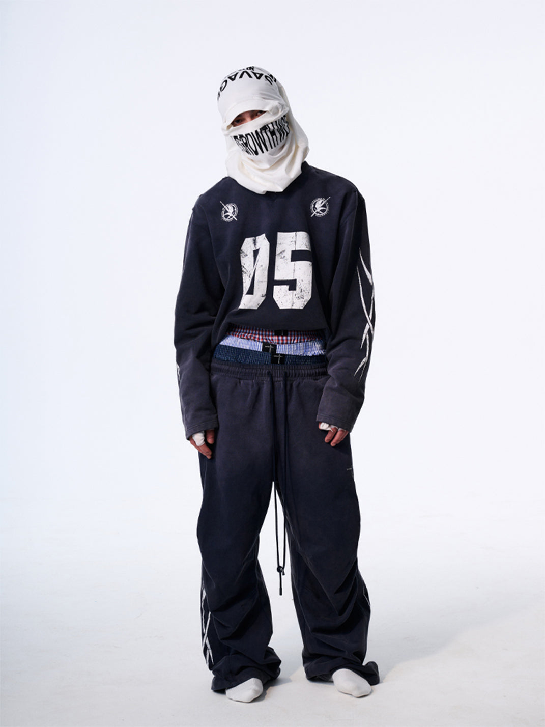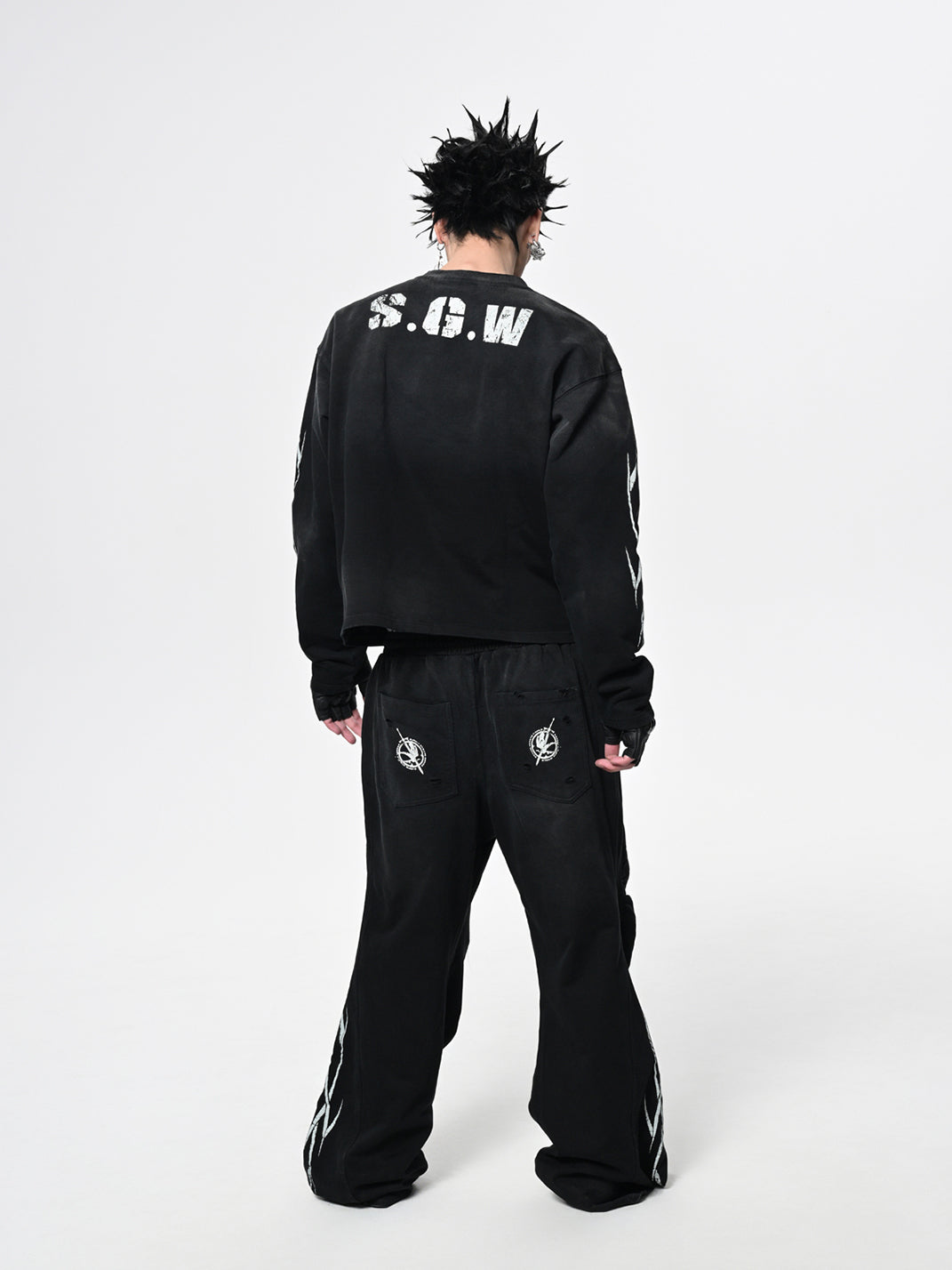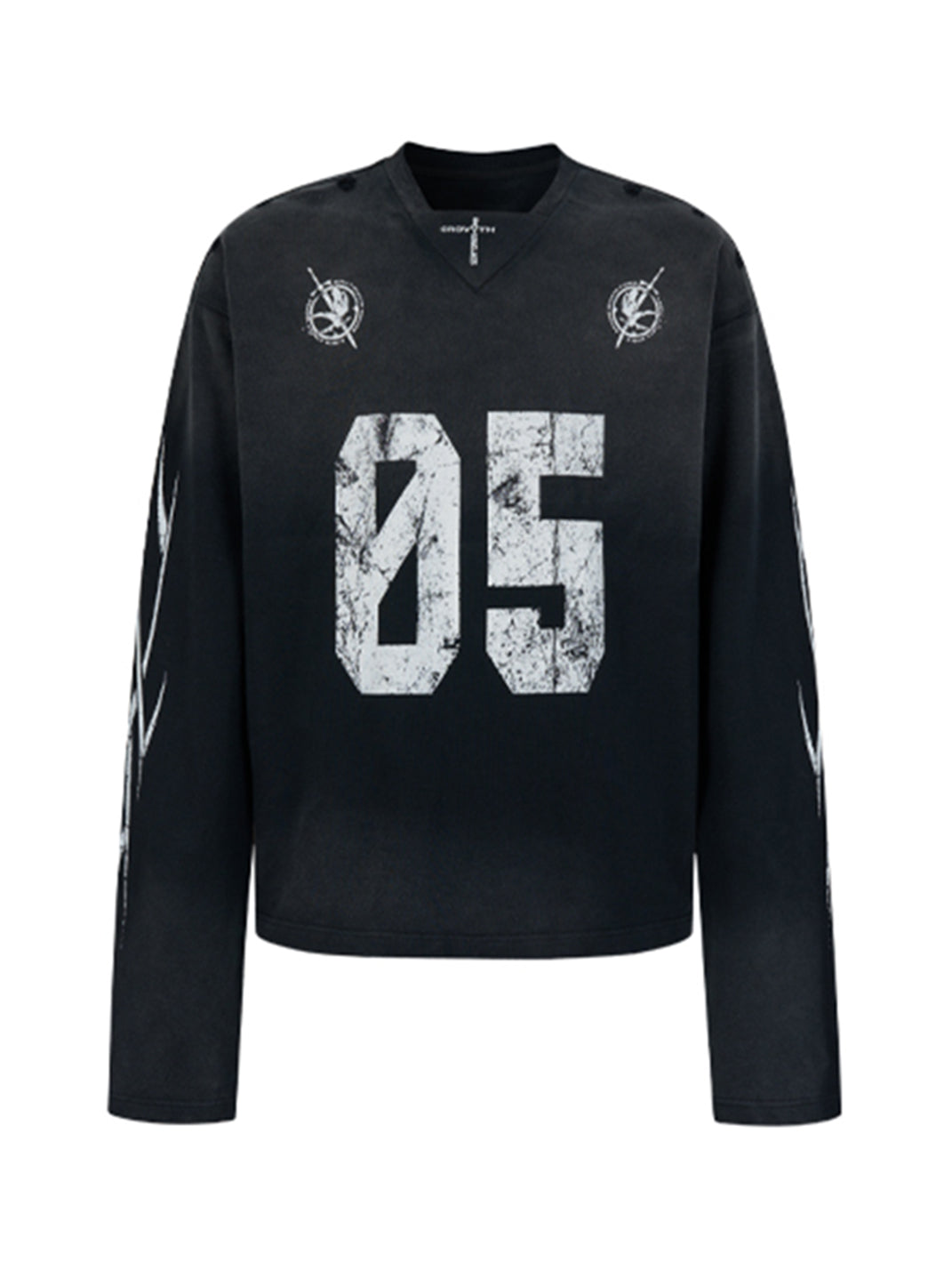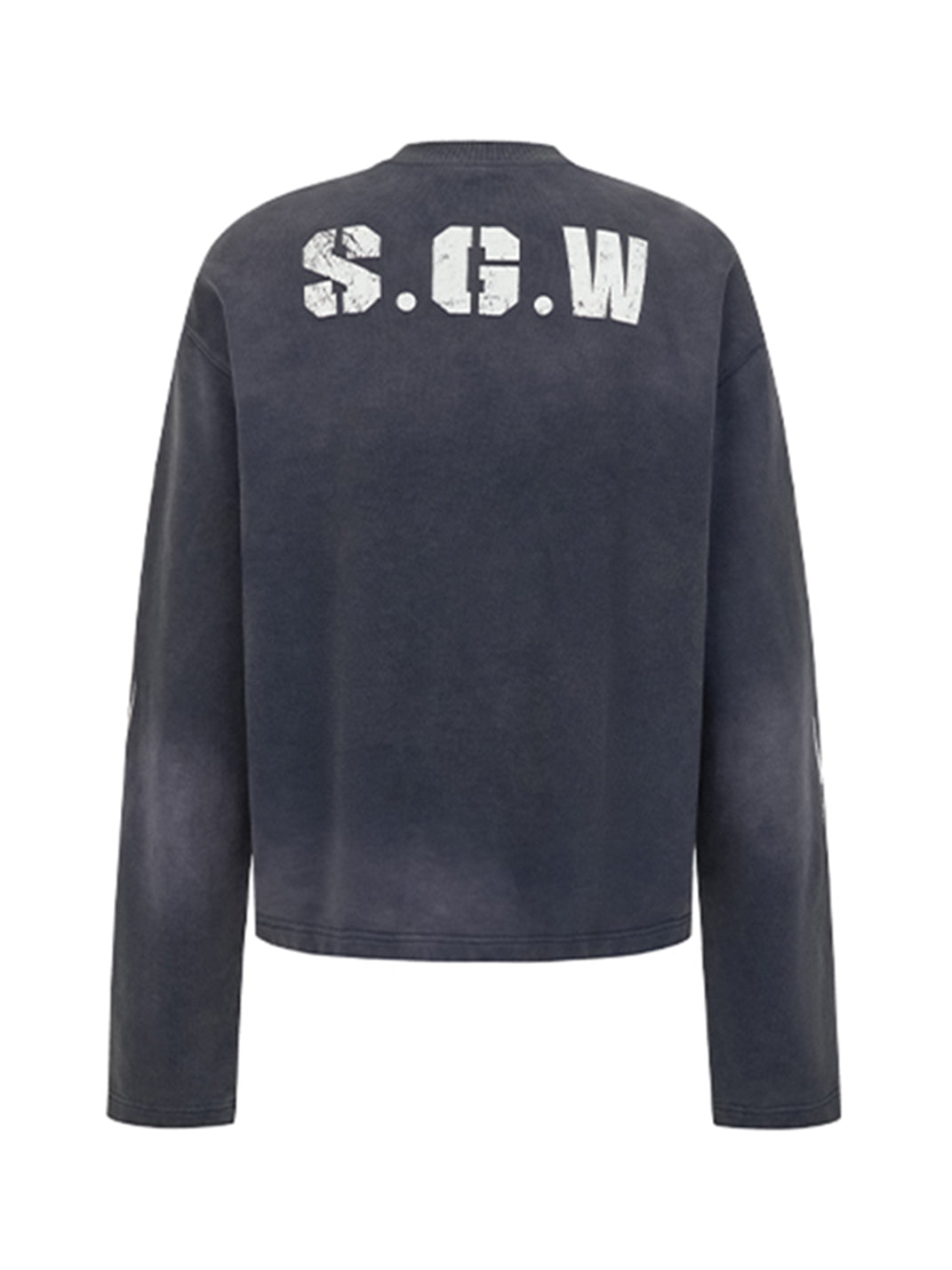 The No.5 Distressed Long-Sleeve Tee merges athletic energy with streetwear cool, creating a bold statement piece. Its washed and sun-faded effect delivers a worn-in, vintage aesthetic, while the oversized fit adds a relaxed, contemporary silhouette. The front prominently features a striking "05" graphic, with additional S.G.W. detailing printed on the back shoulder. Completing the design, curved blade-inspired graphics adorn the sleeves, emphasizing movement and edgy style. Crafted from premium 100% cotton fabric, this tee is an elevated essential for street-savvy wardrobes.