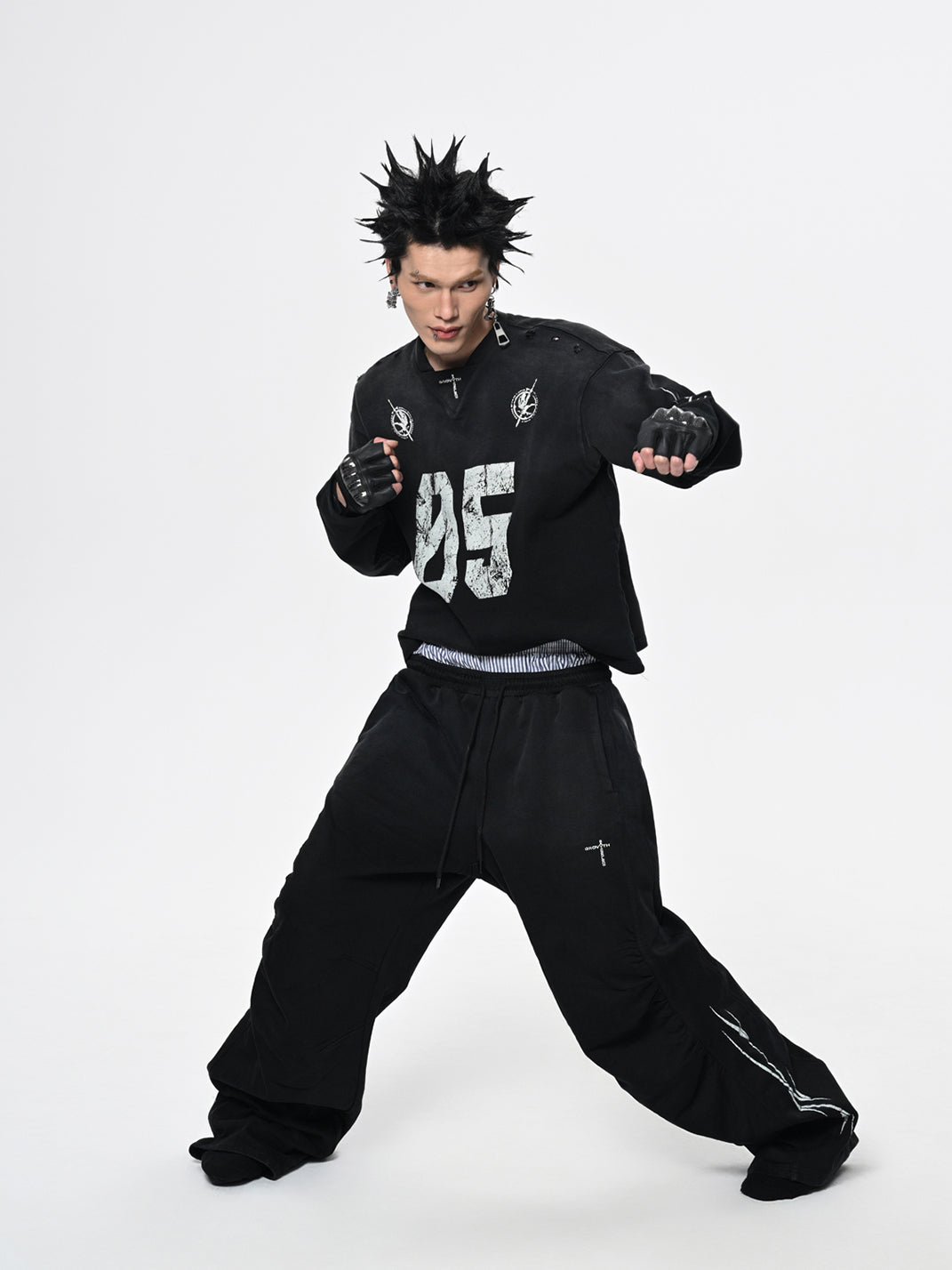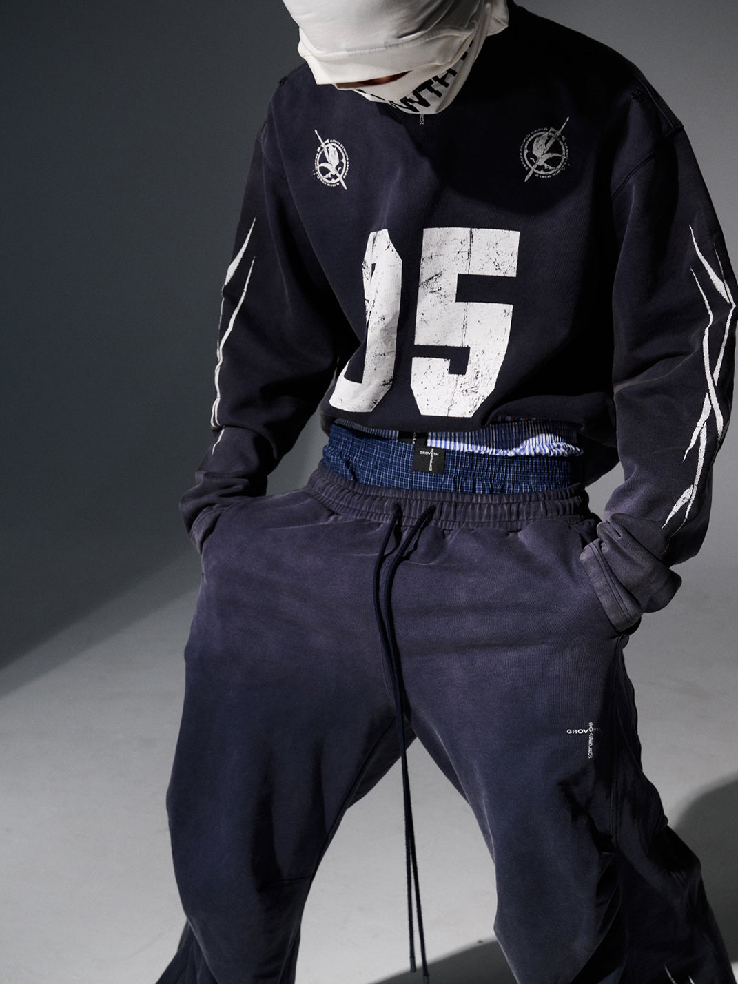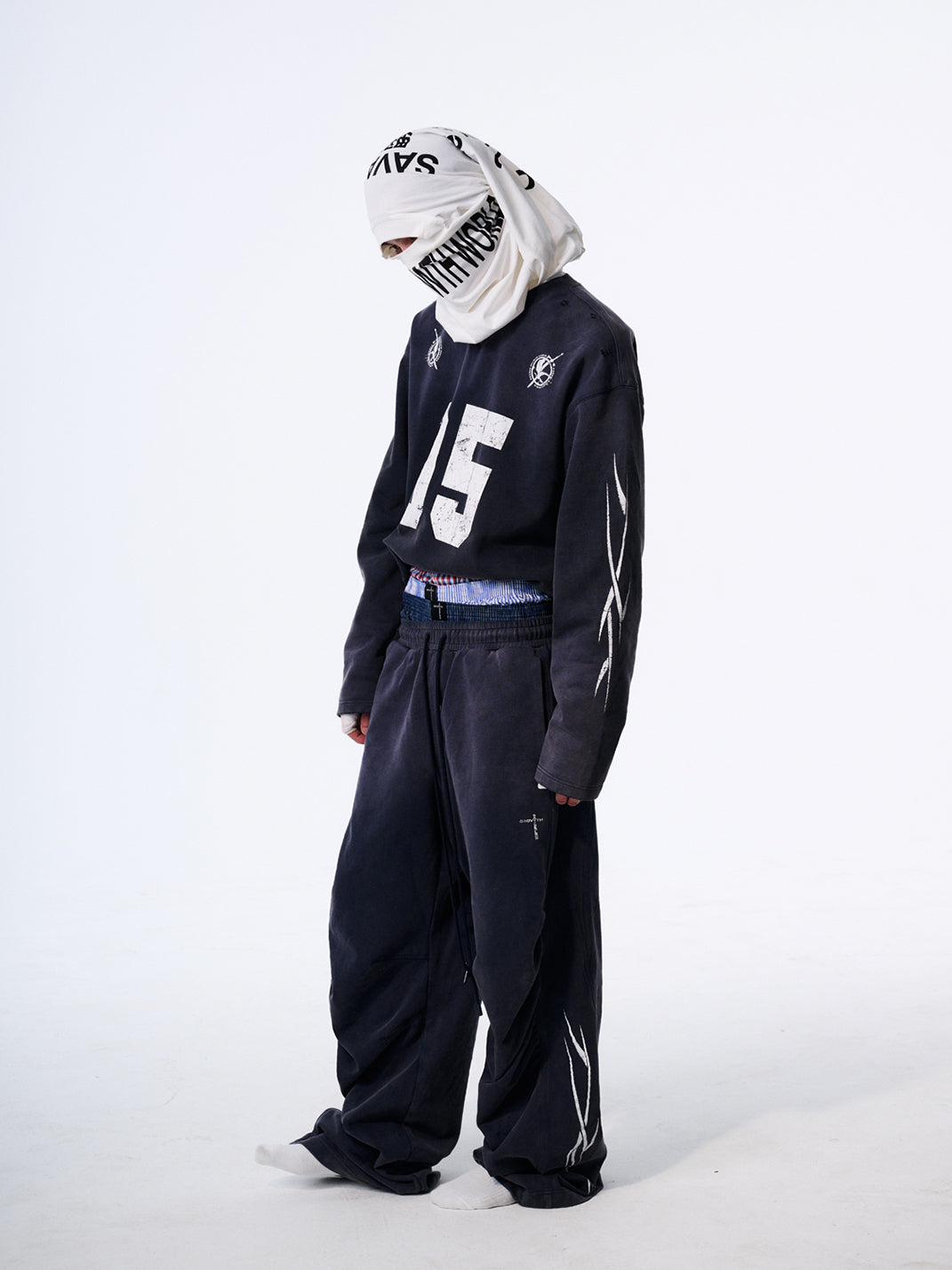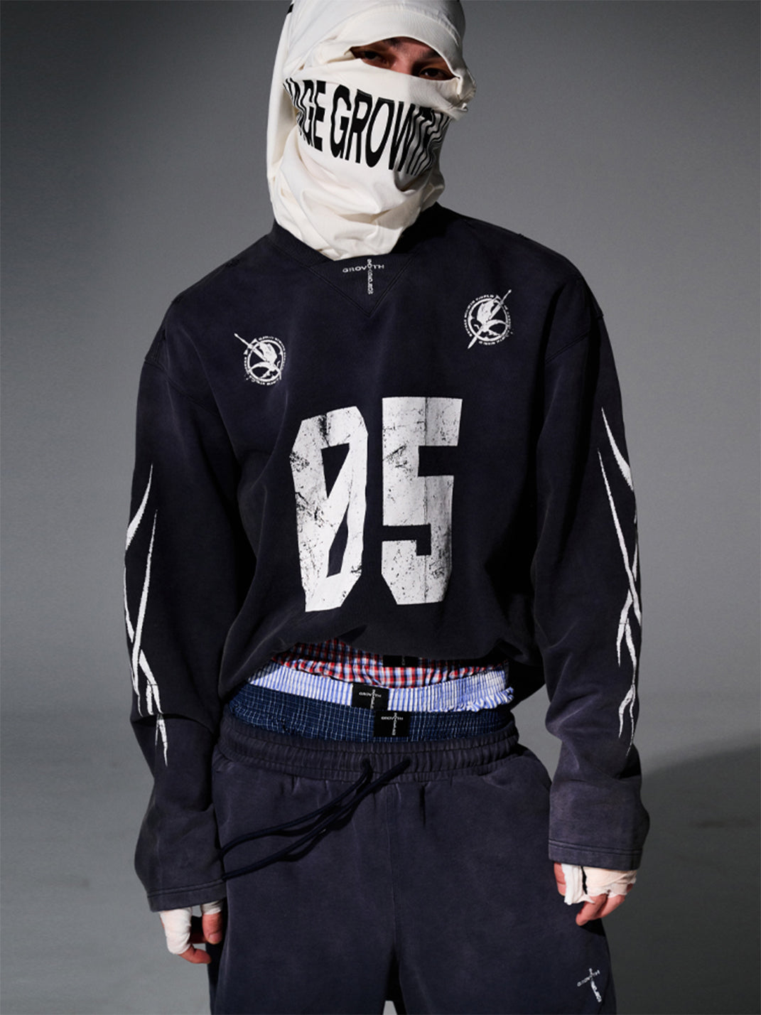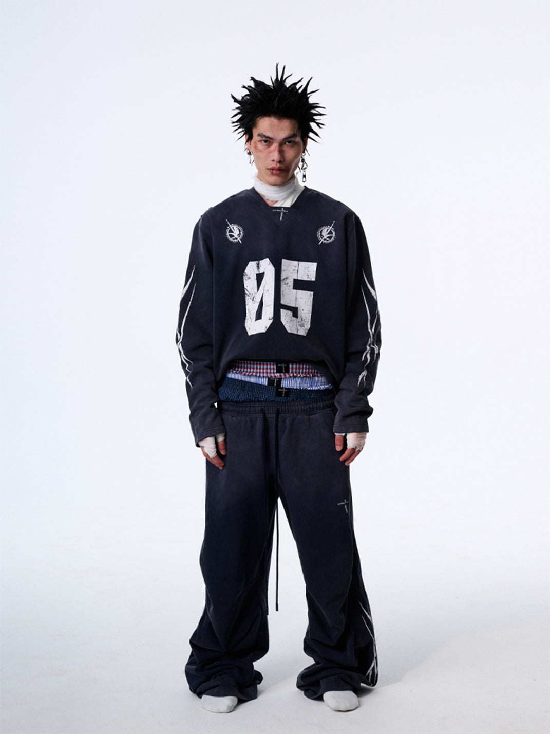 The No.5 Distressed Long-Sleeve Tee merges athletic energy with streetwear cool, creating a bold statement piece. Its washed and sun-faded effect delivers a worn-in, vintage aesthetic, while the oversized fit adds a relaxed, contemporary silhouette. The front prominently features a striking "05" graphic, with additional S.G.W. detailing printed on the back shoulder. Completing the design, curved blade-inspired graphics adorn the sleeves, emphasizing movement and edgy style. Crafted from premium 100% cotton fabric, this tee is an elevated essential for street-savvy wardrobes.