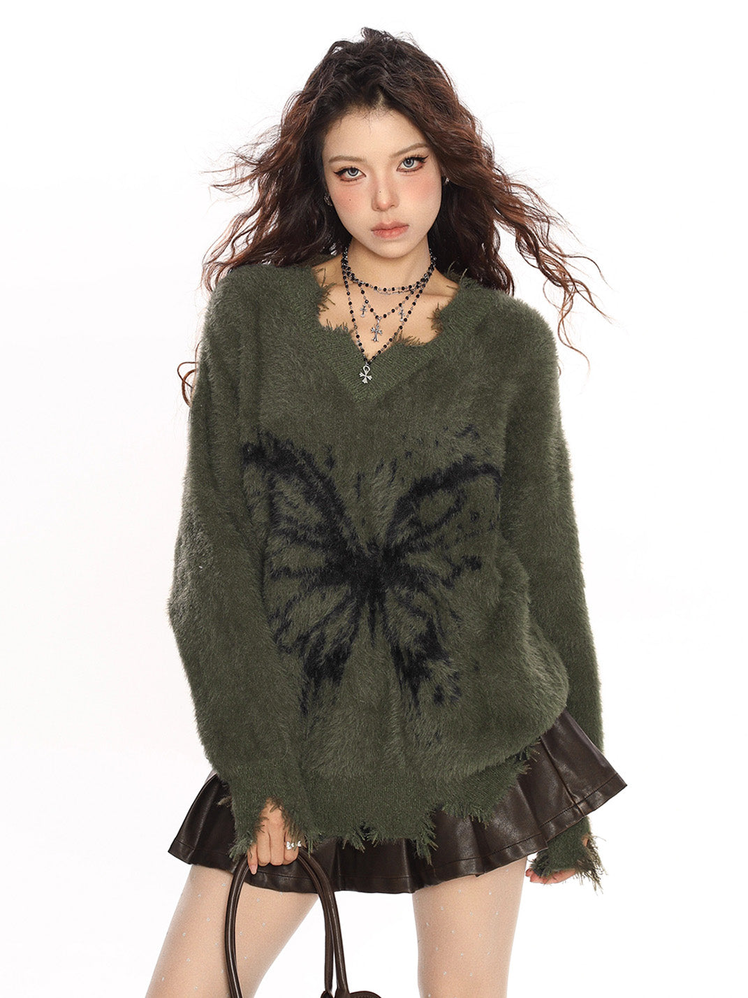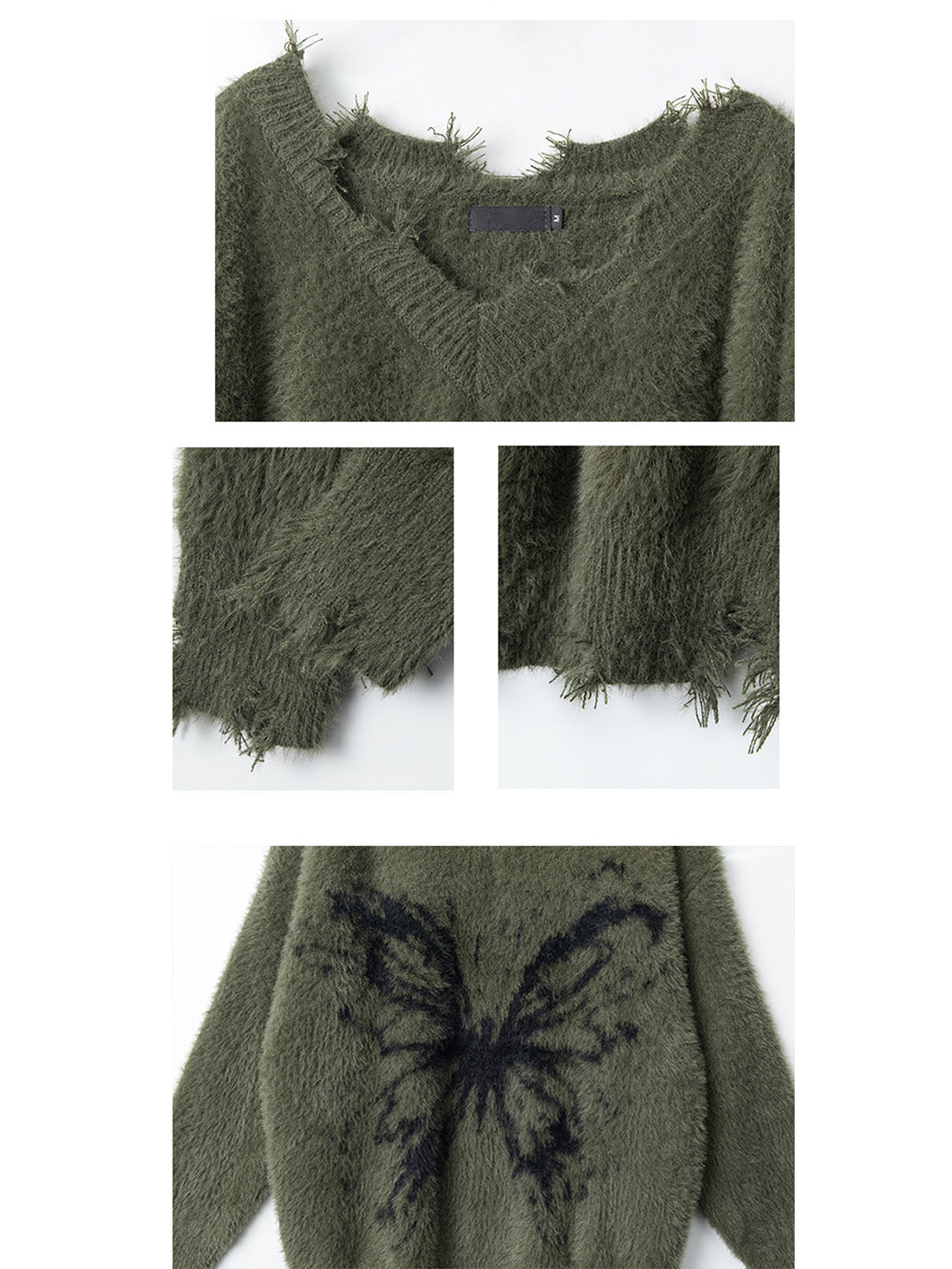 BIGGOLD | Distressed V-neck Butterfly Mohair Sweater