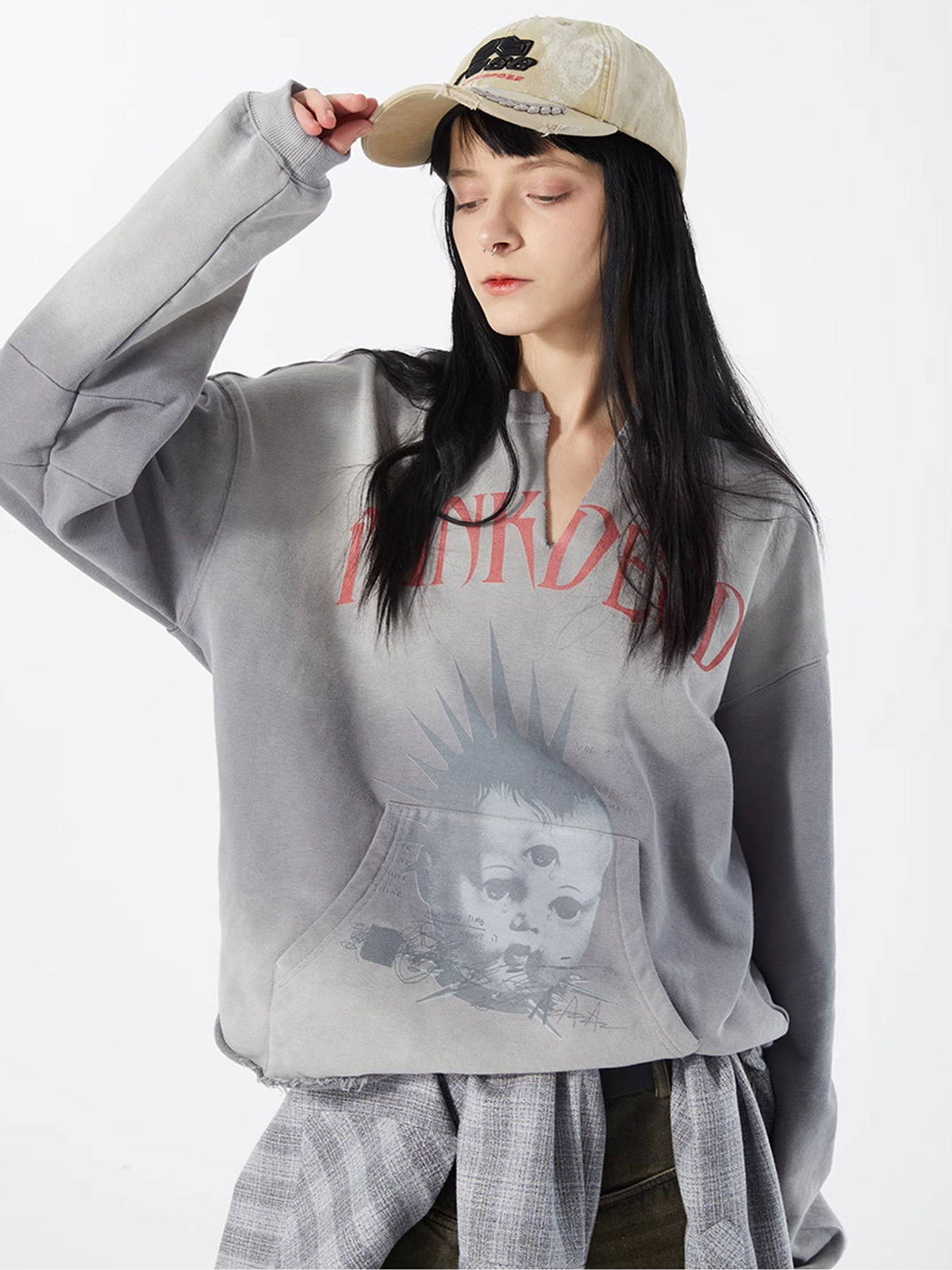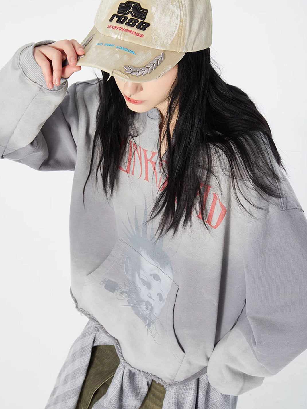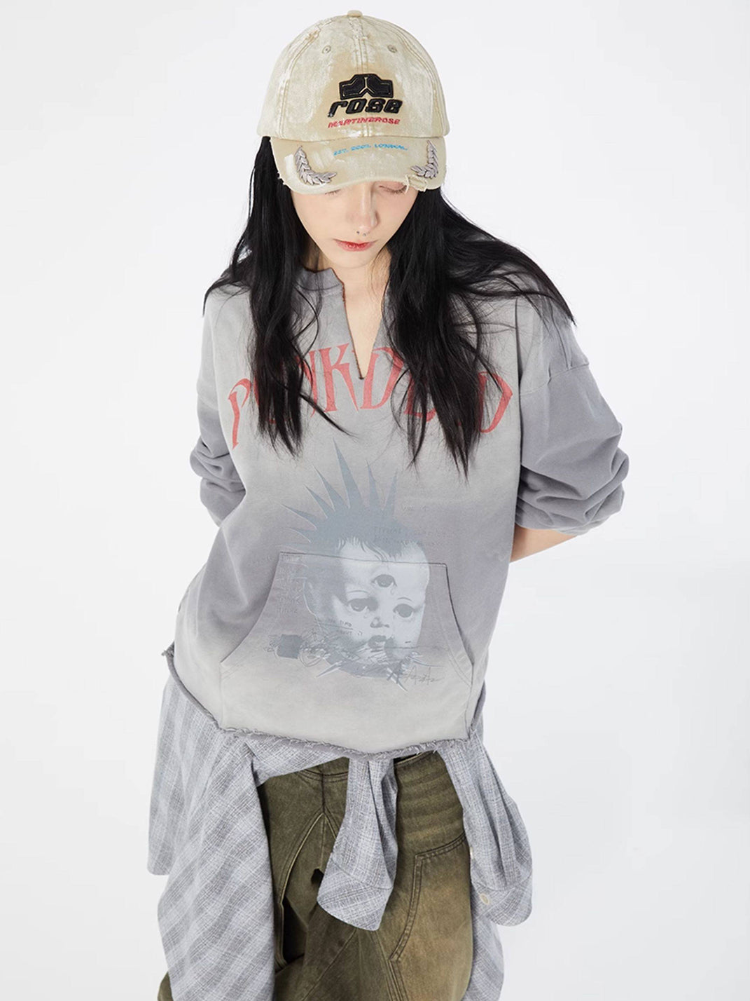 The water-washed, spray-painted monkey process creates a whitish effect in parts of the garment, while the frayed and rolled edges at the hem are part of the design. There are no quality issues, and it doesn't affect normal wear. The print features a quirky, punk-rebellious child's head.
