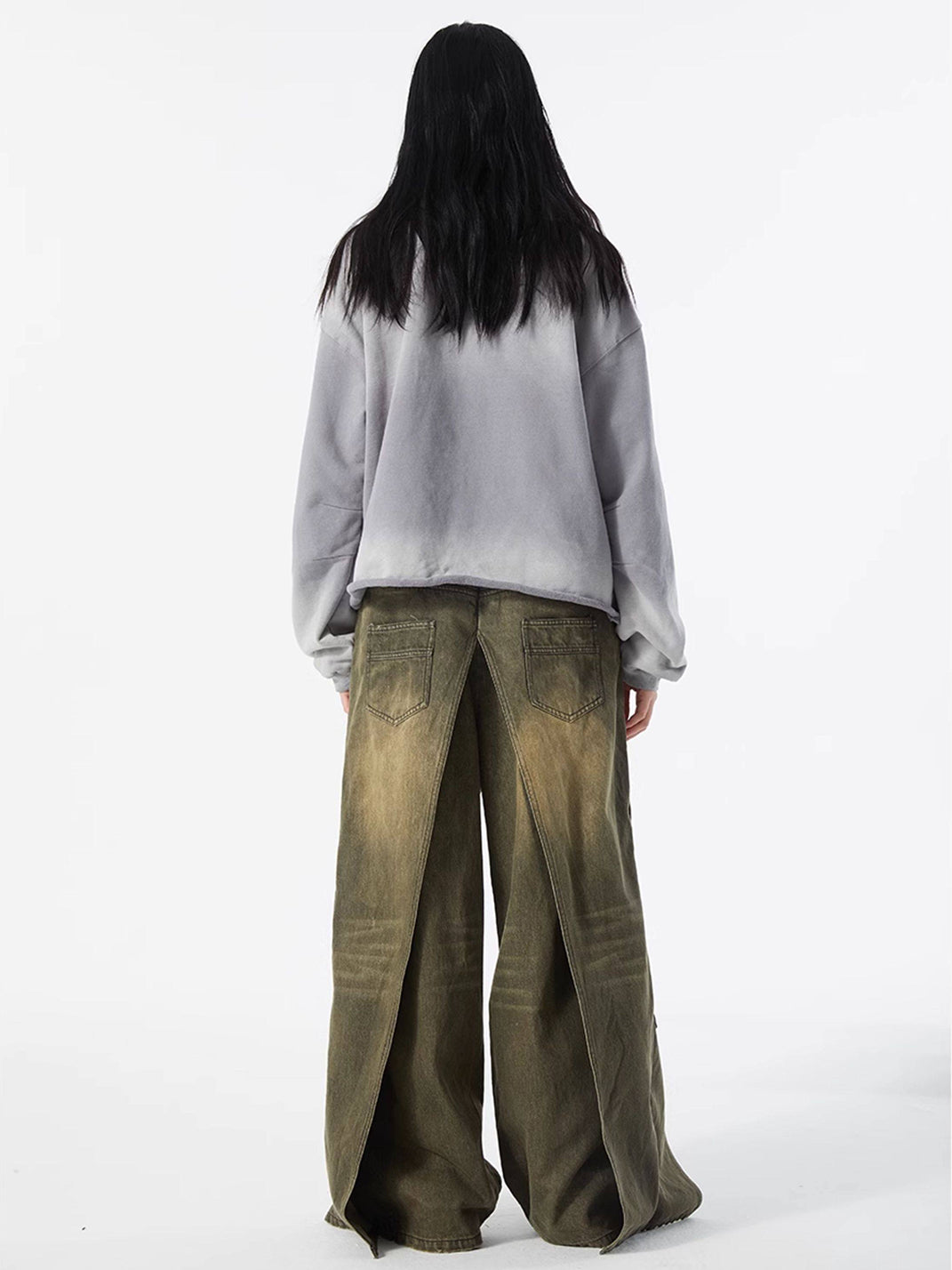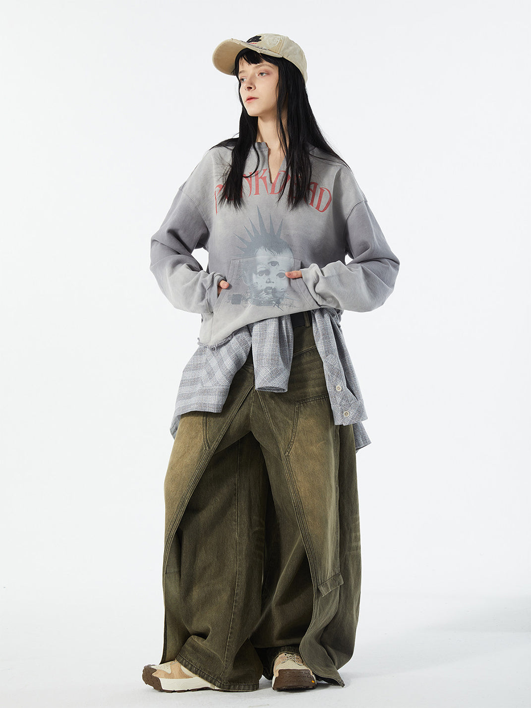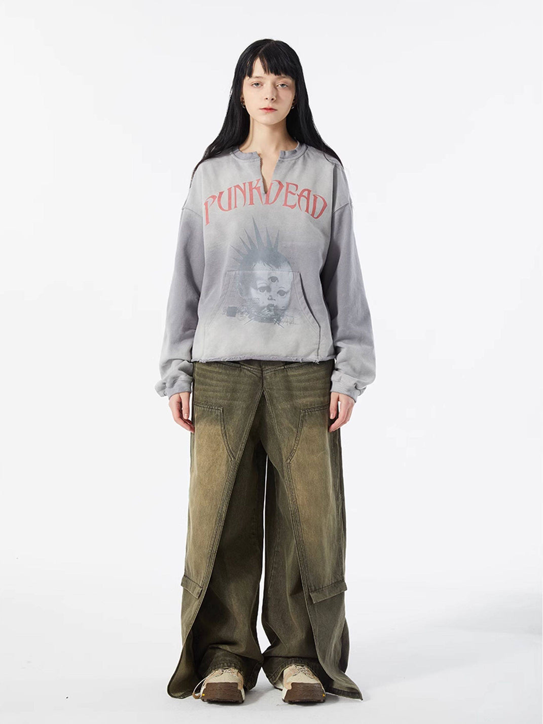 The water-washed, spray-painted monkey process creates a whitish effect in parts of the garment, while the frayed and rolled edges at the hem are part of the design. There are no quality issues, and it doesn't affect normal wear. The print features a quirky, punk-rebellious child's head.