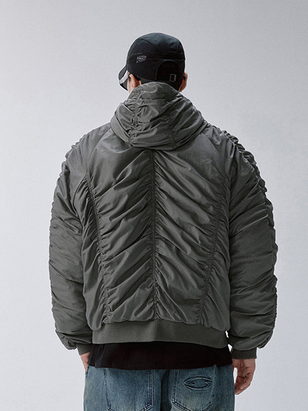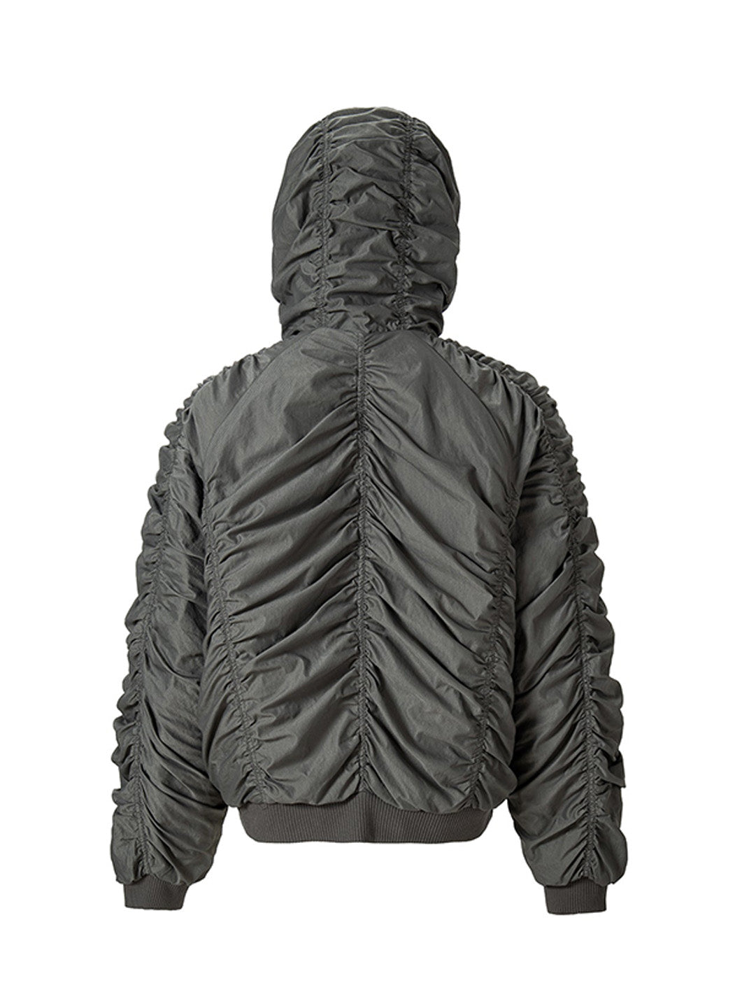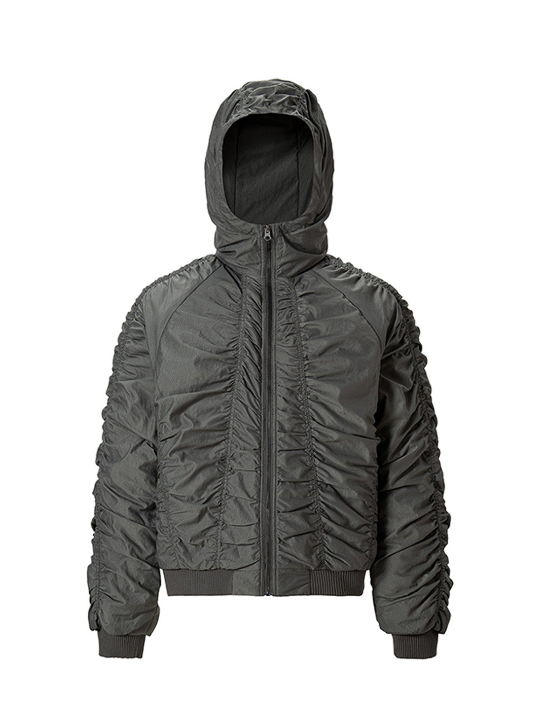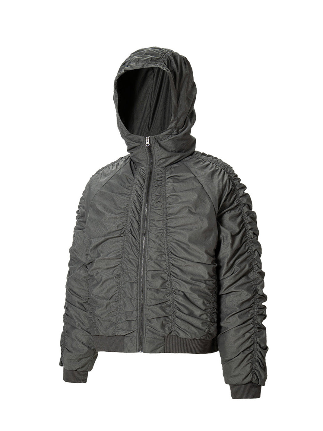 The Ruched Nylon Hooded Bomber redefines outerwear with its aggressive textural detailing and bold silhouette. Cut from a slightly glossy technical nylon, the jacket features deep ruched seams that run down the front, back, and sleeves—creating a sculptural, almost armored appearance. The hooded design and ribbed trims balance its experimental edge with classic bomber structure. Finished in a muted slate tone, this piece brings a futuristic twist to utilitarian styling.