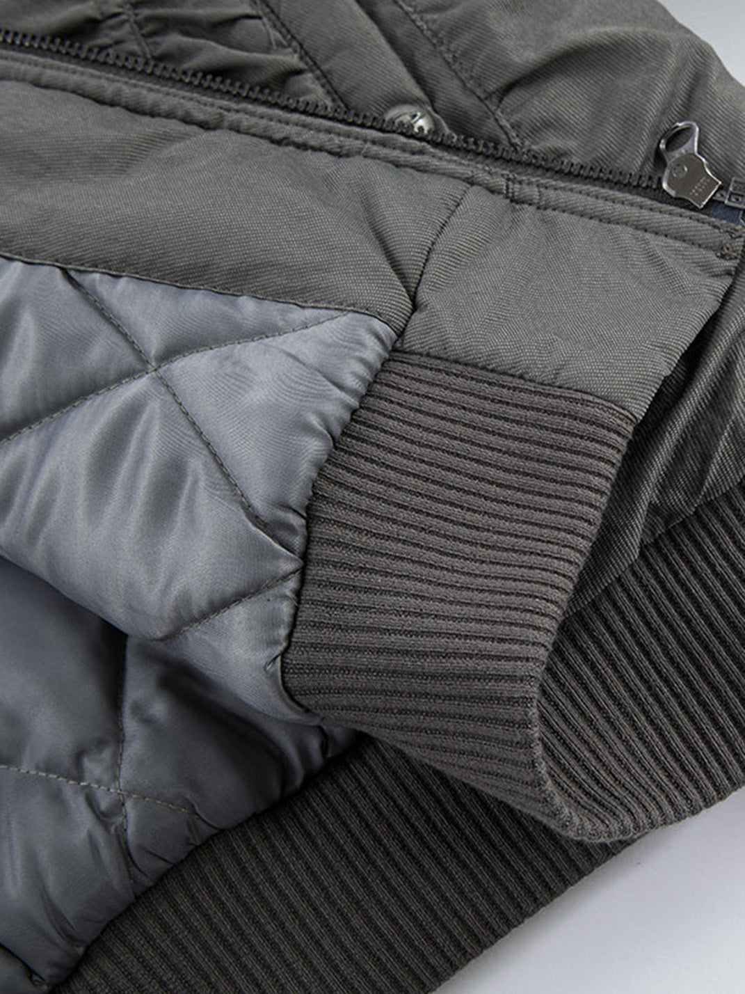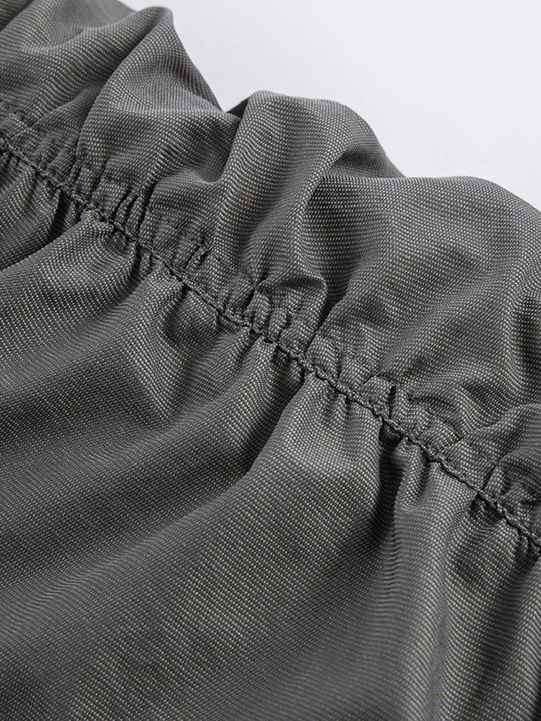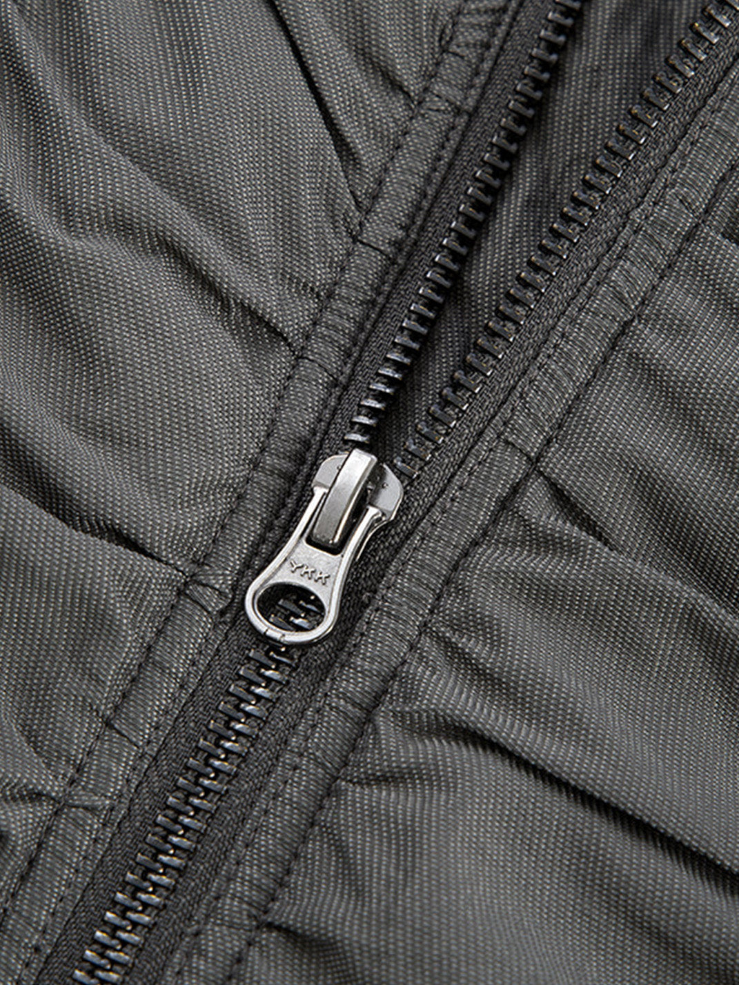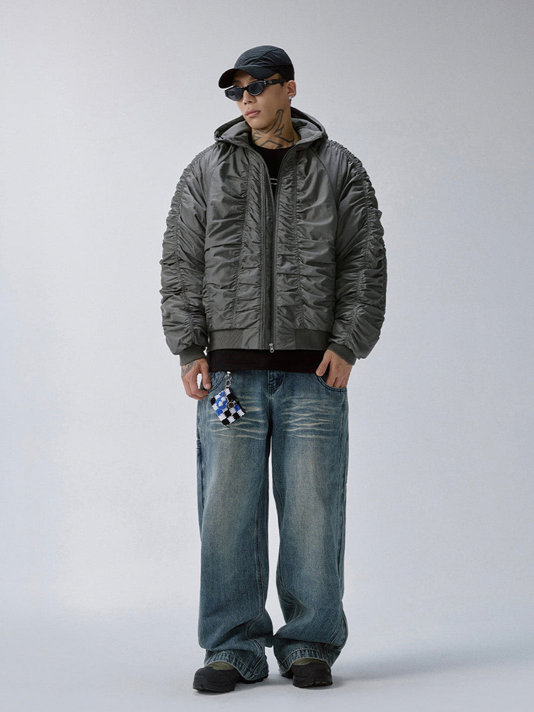 The Ruched Nylon Hooded Bomber redefines outerwear with its aggressive textural detailing and bold silhouette. Cut from a slightly glossy technical nylon, the jacket features deep ruched seams that run down the front, back, and sleeves—creating a sculptural, almost armored appearance. The hooded design and ribbed trims balance its experimental edge with classic bomber structure. Finished in a muted slate tone, this piece brings a futuristic twist to utilitarian styling.