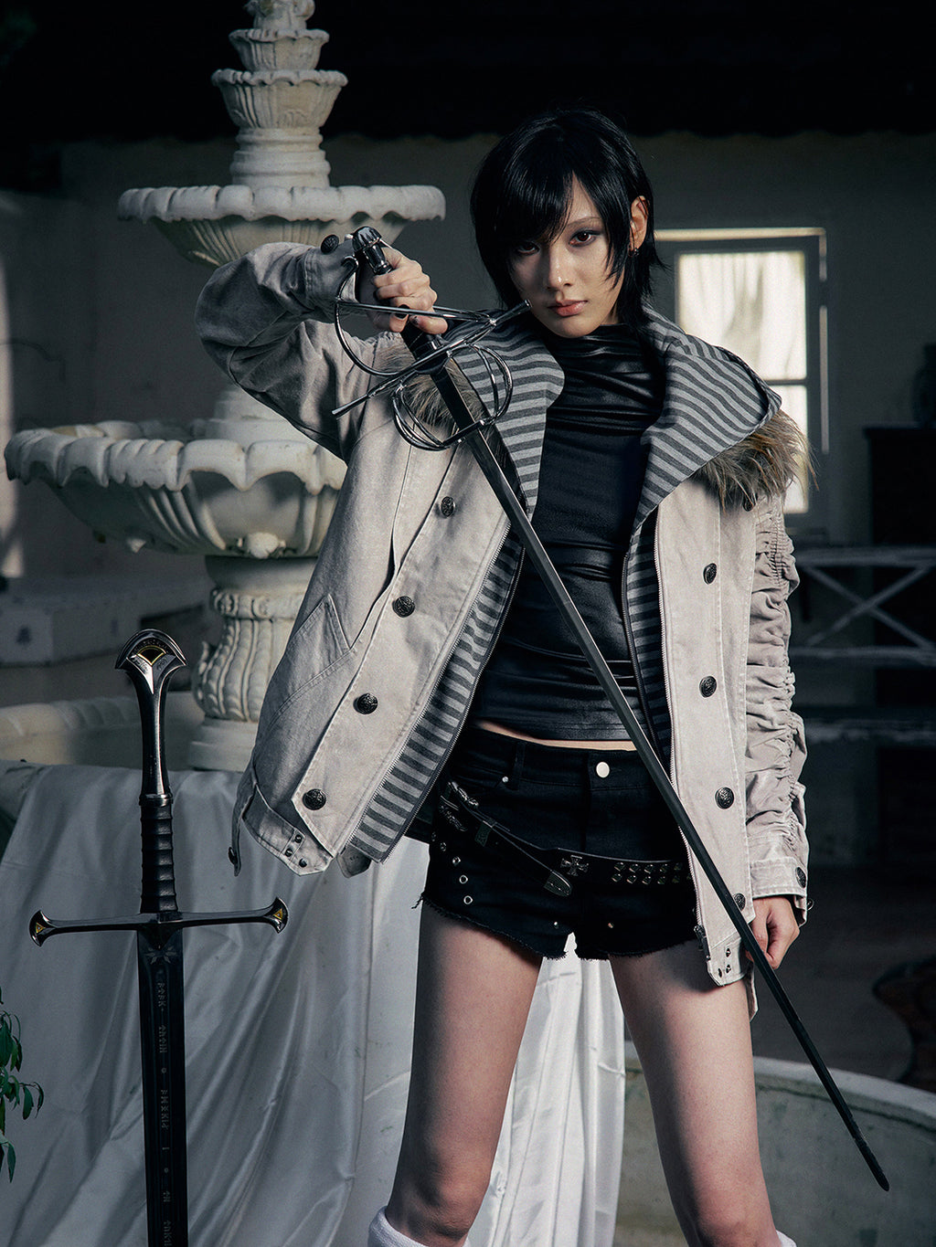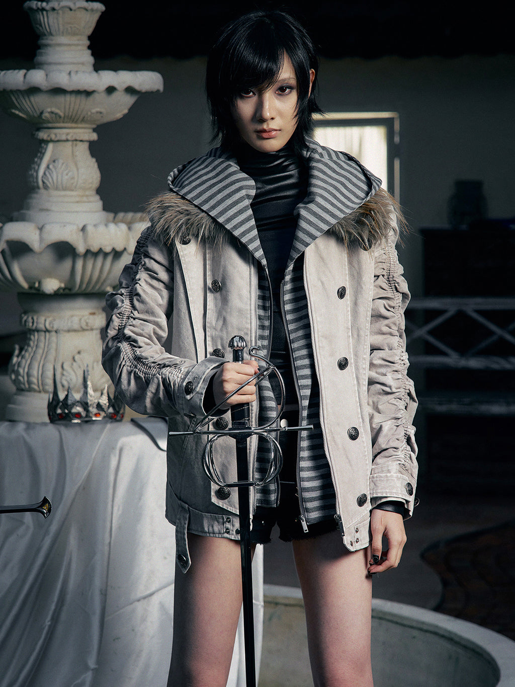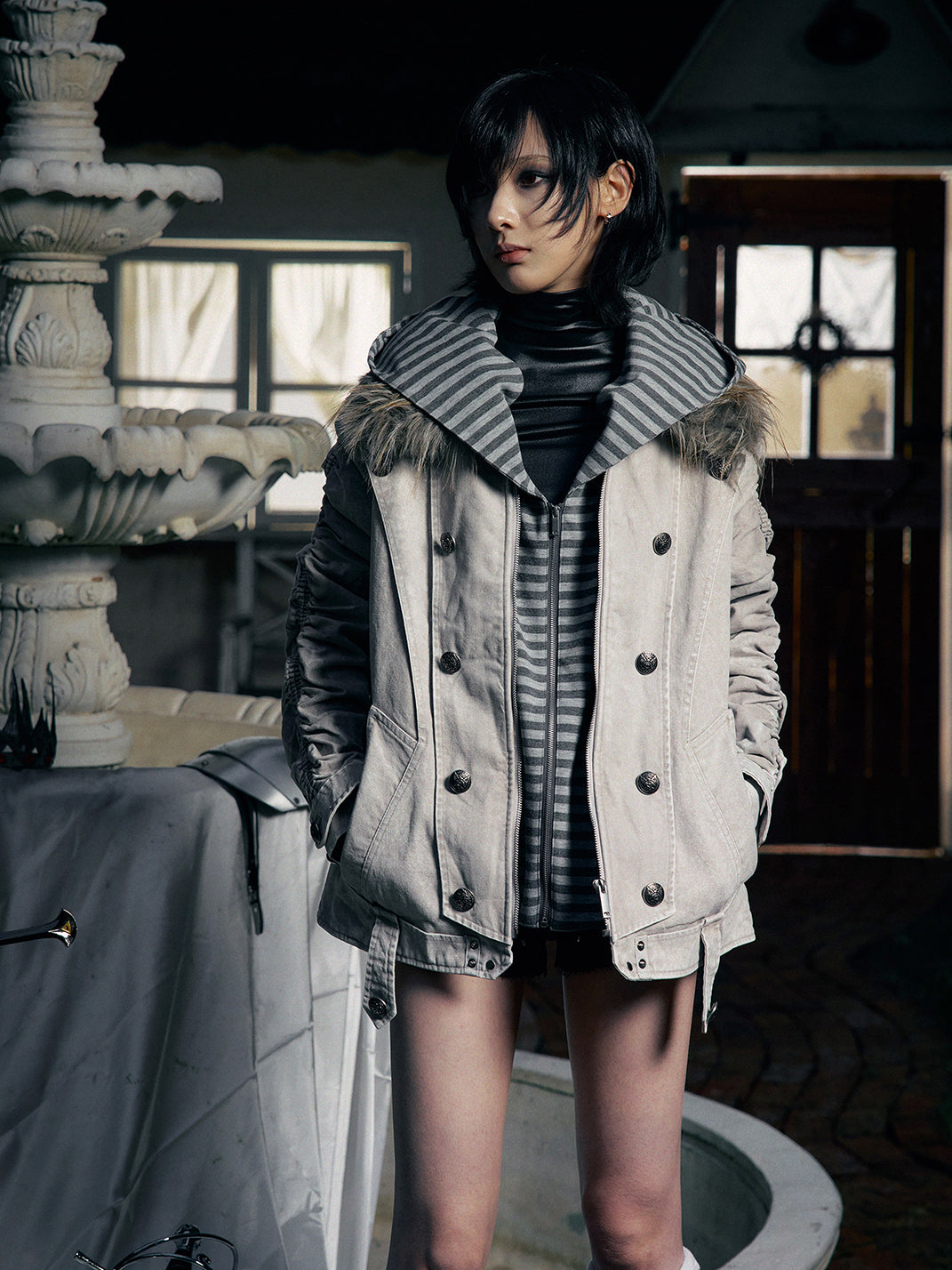 PAIKI | "Silent Shadow" Detachable Fur Collar Canvas Double-Breasted Jacket