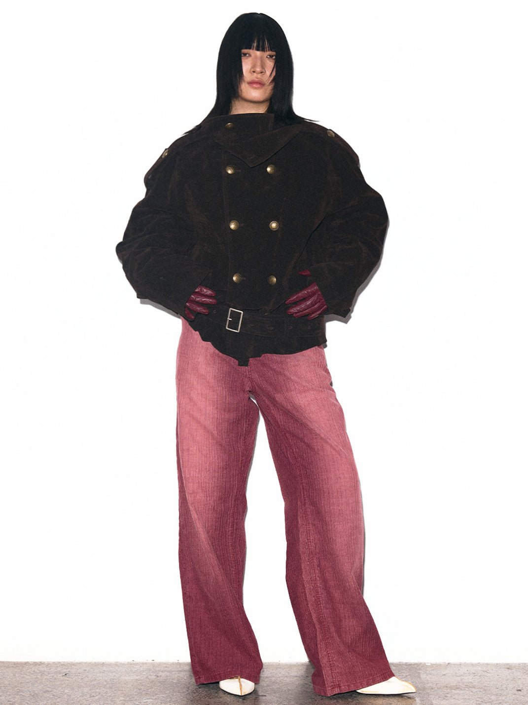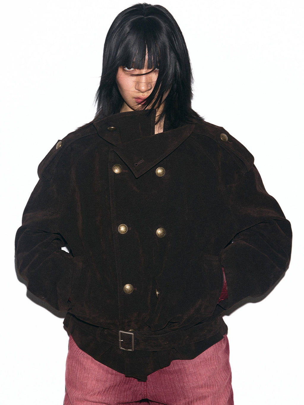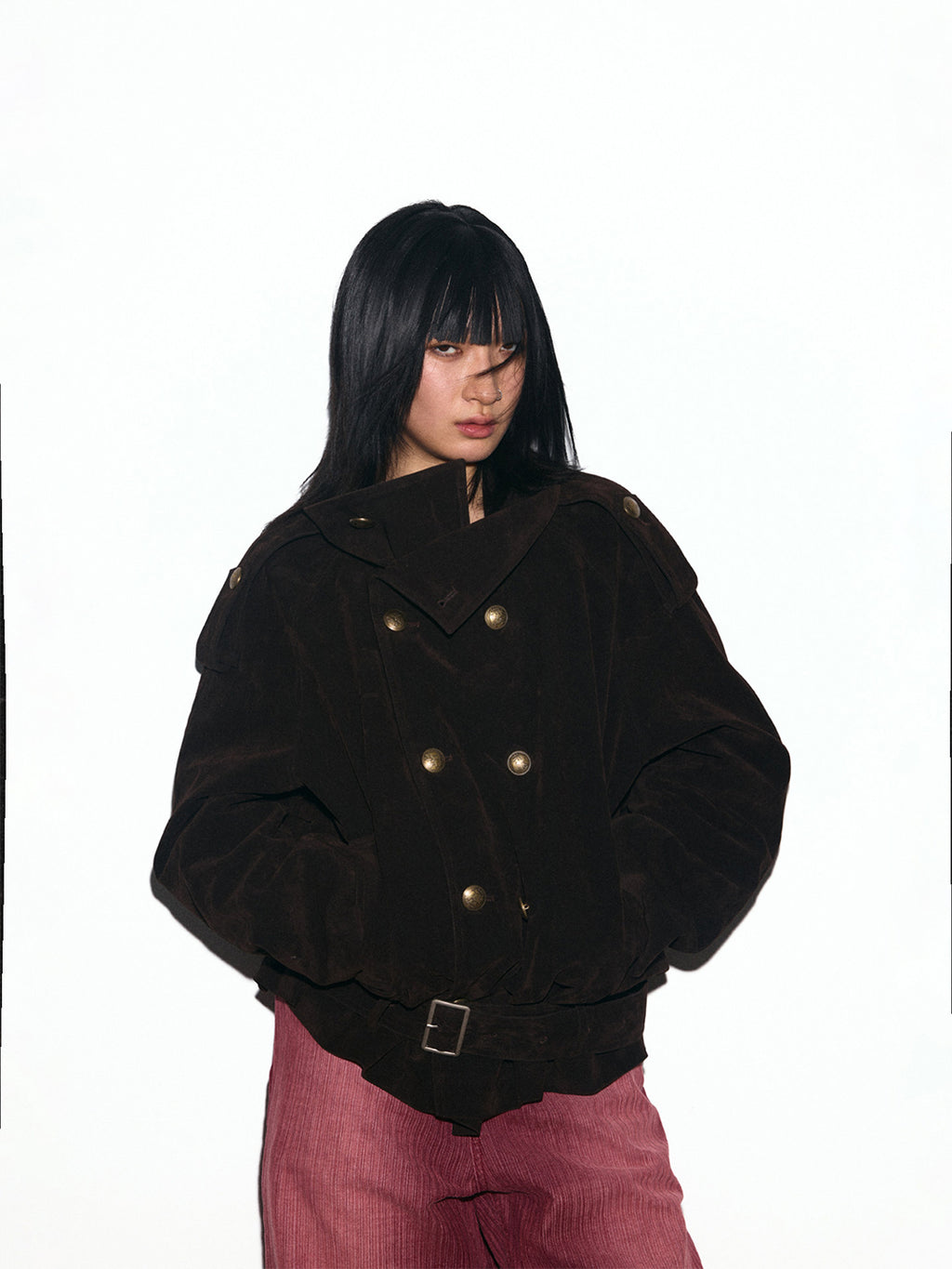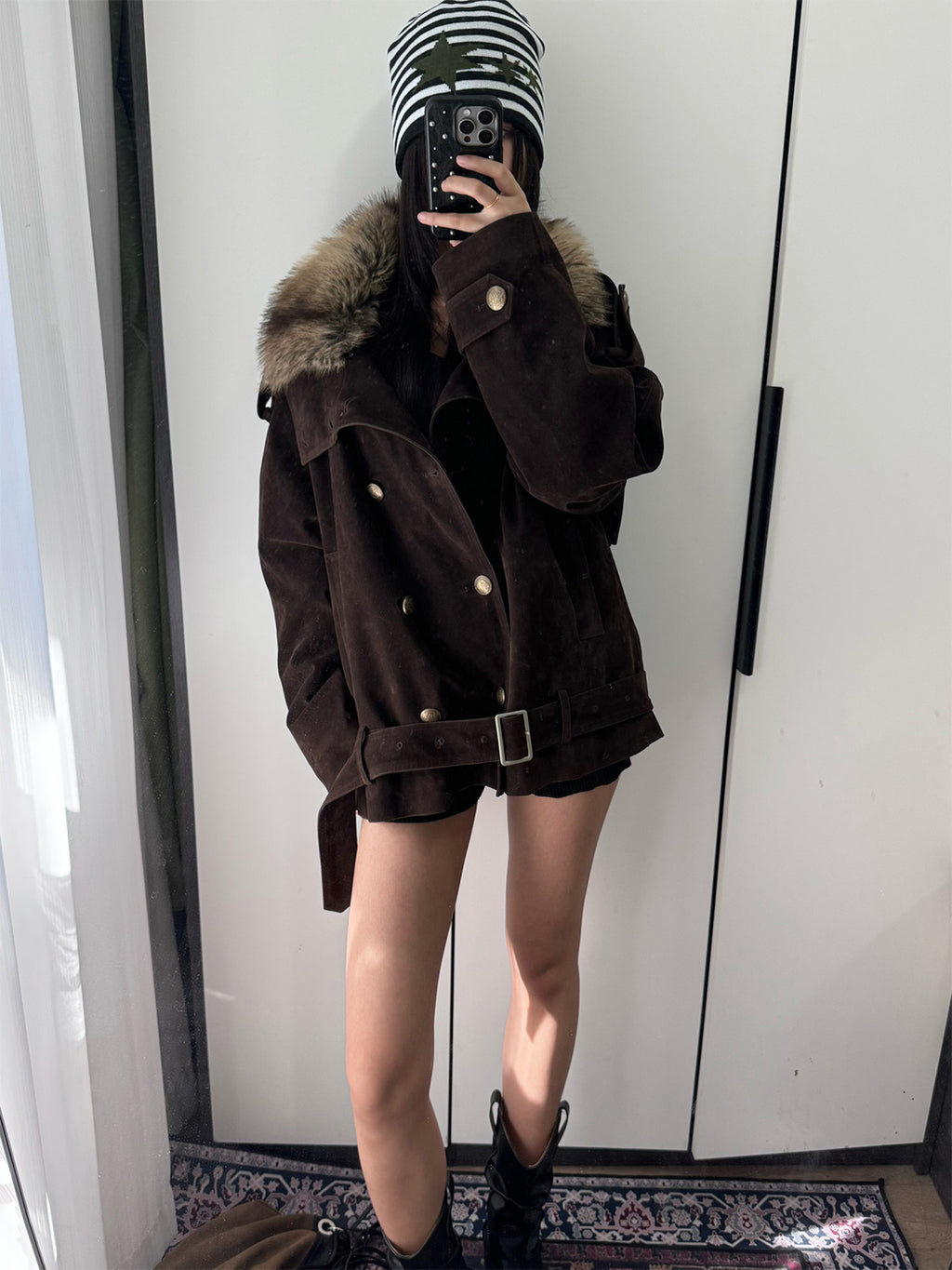 The fabric is a brown blended single-sided fleece, which differs from traditional suede. Single-sided fleece has a firmer feel, preventing it from slouching and losing its shape when worn. It has a slightly rougher feel and a high fabric density, providing excellent windproof performance. The design features a double-breasted, mid-length trench coat structure with an adjustable waistband to accentuate the waistline. Custom-made antique bronze-finished hand-stitched buttons add a touch of luxury. The inner lining is filled with 80 grams of quilted cotton, layered with an outer windproof layer, ensuring maximum warmth for autumn and winter.