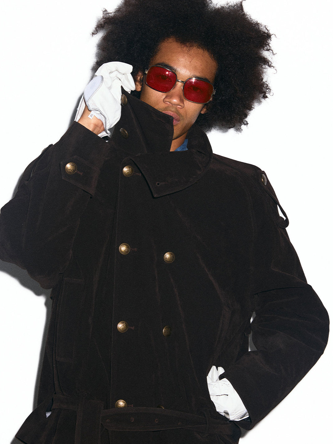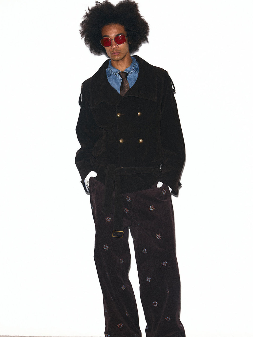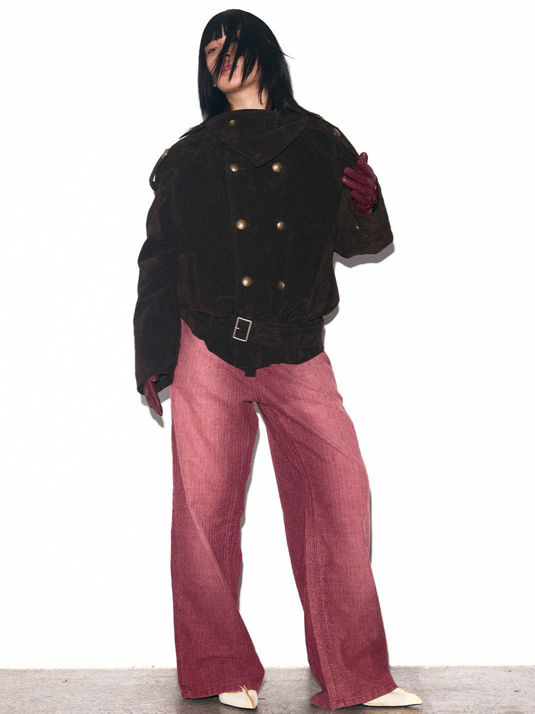 The fabric is a brown blended single-sided fleece, which differs from traditional suede. Single-sided fleece has a firmer feel, preventing it from slouching and losing its shape when worn. It has a slightly rougher feel and a high fabric density, providing excellent windproof performance. The design features a double-breasted, mid-length trench coat structure with an adjustable waistband to accentuate the waistline. Custom-made antique bronze-finished hand-stitched buttons add a touch of luxury. The inner lining is filled with 80 grams of quilted cotton, layered with an outer windproof layer, ensuring maximum warmth for autumn and winter.