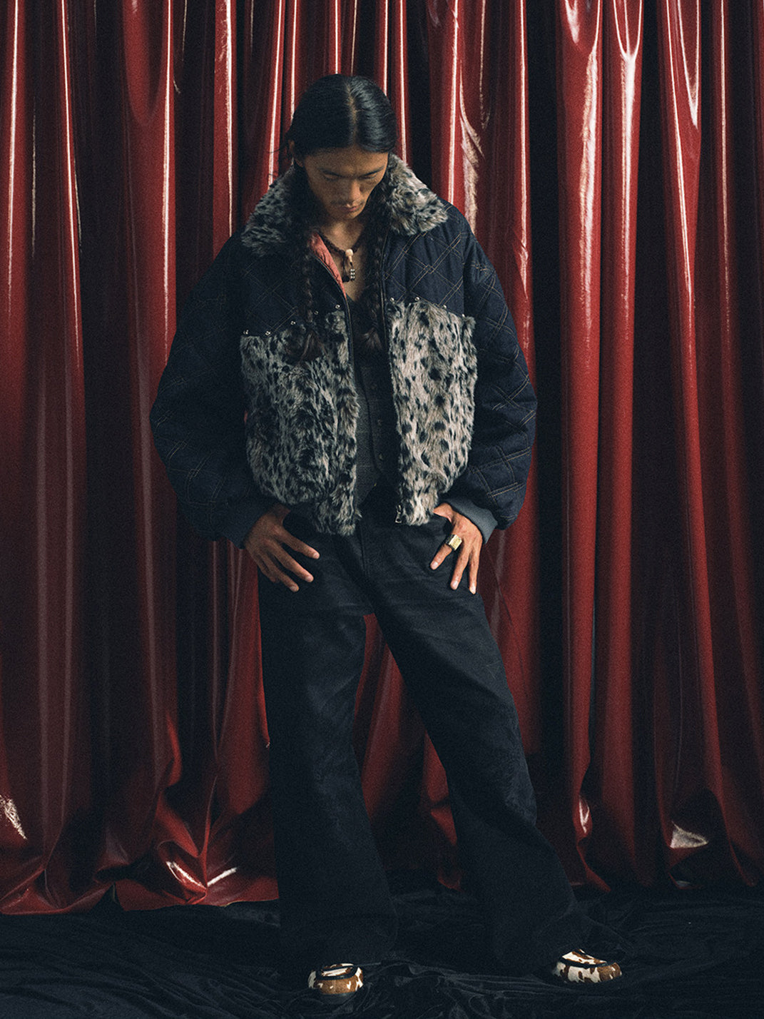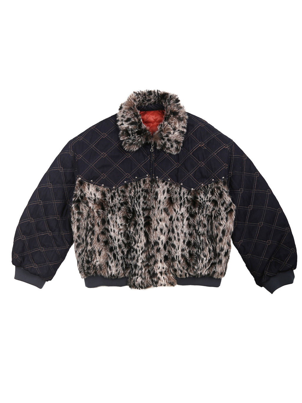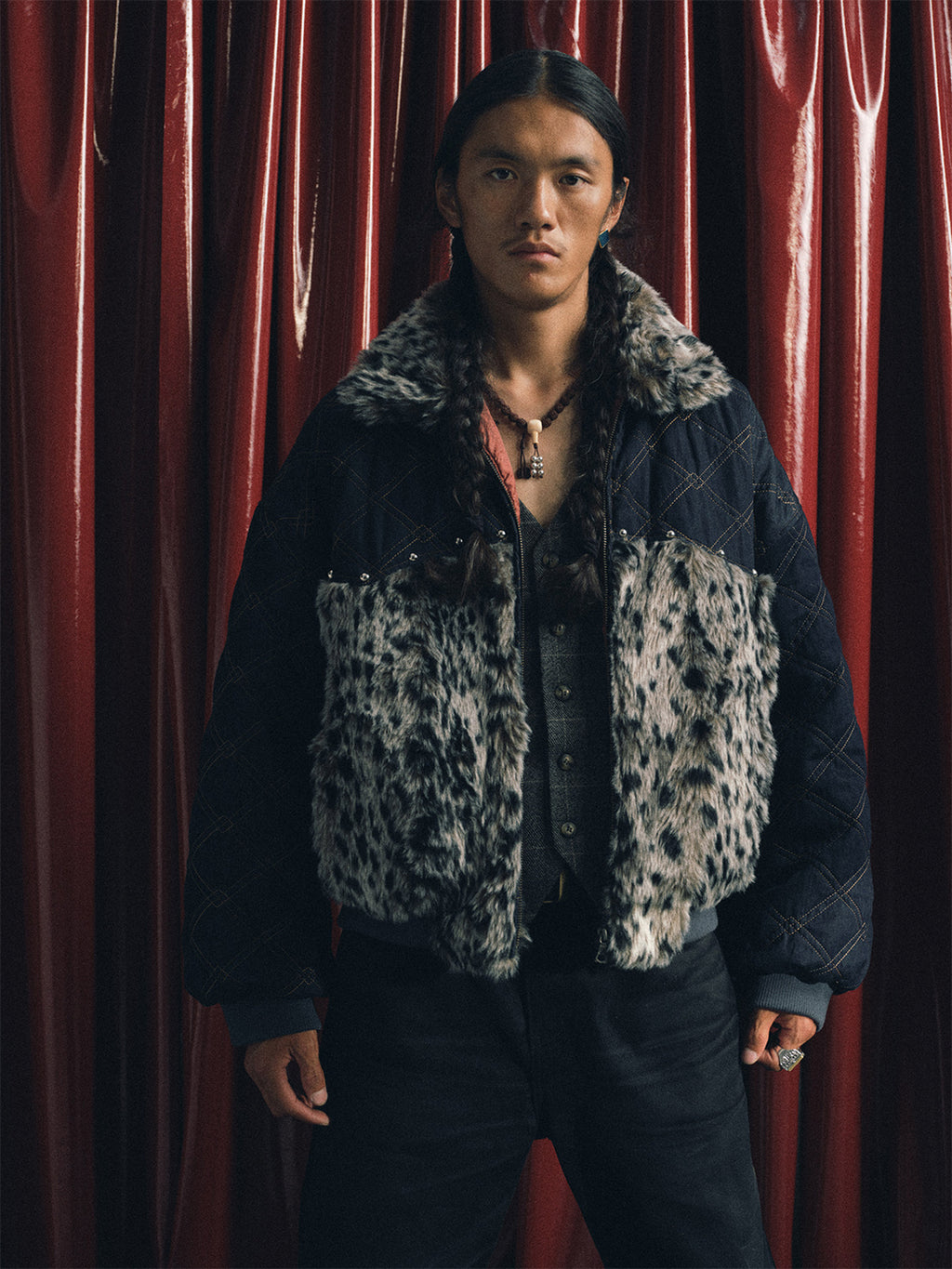 This down jacket combines 12 ounces of raw denim with 750 grams of snow leopard-colored fleece. The raw denim is quilted to give it a unique texture. The fleece-collar jacket style offers a natural, comfortable, and non-bulky fit. It's filled with 100 grams of energy-retaining thermal cotton, making it perfect for layering in early winter.