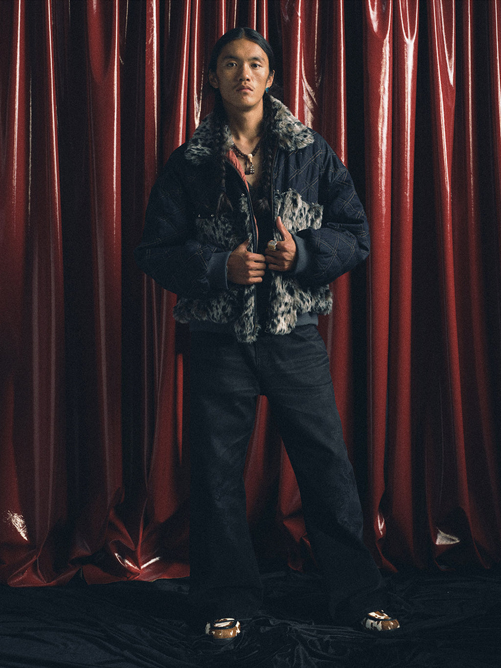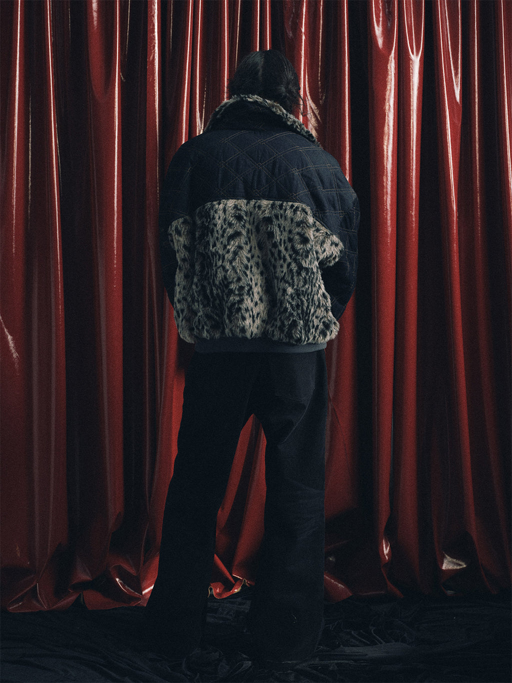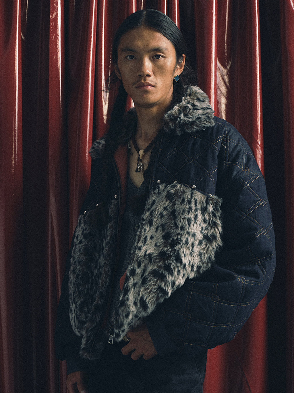 This down jacket combines 12 ounces of raw denim with 750 grams of snow leopard-colored fleece. The raw denim is quilted to give it a unique texture. The fleece-collar jacket style offers a natural, comfortable, and non-bulky fit. It's filled with 100 grams of energy-retaining thermal cotton, making it perfect for layering in early winter.