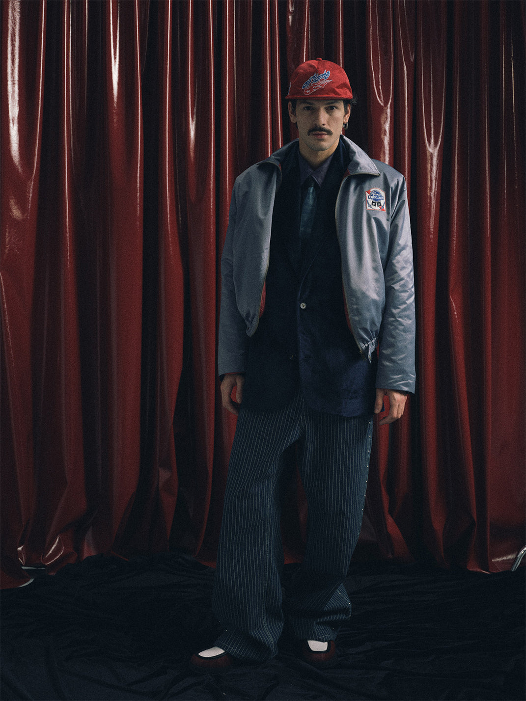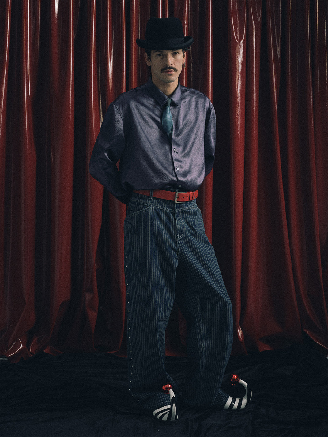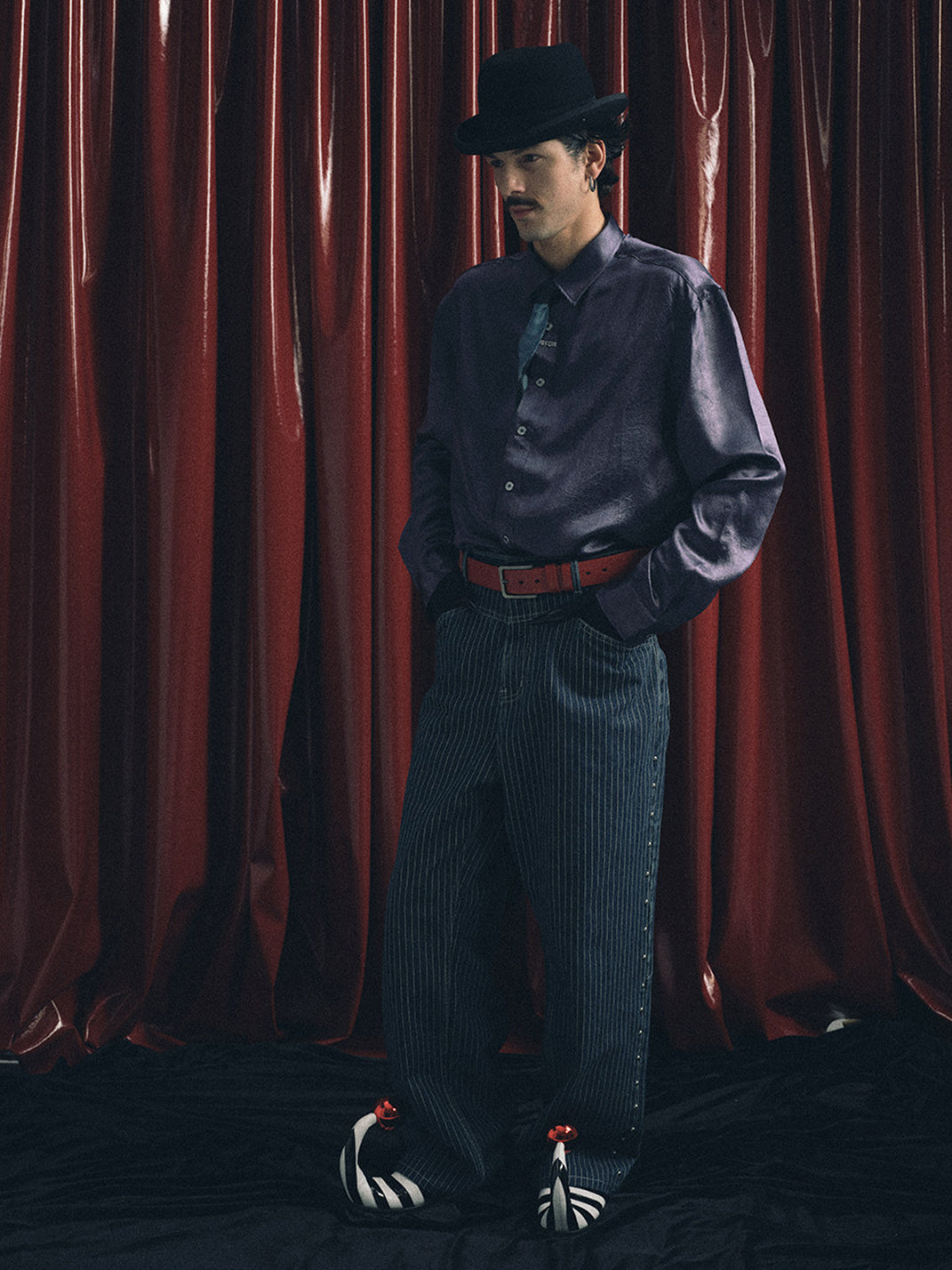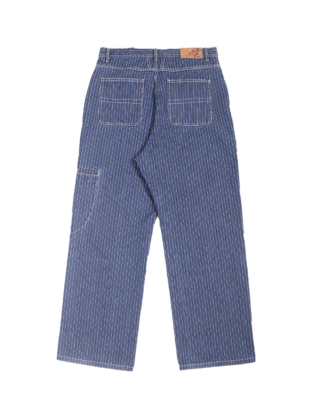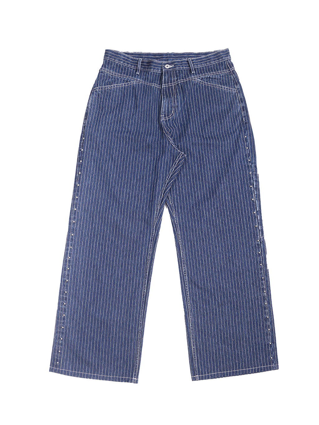 The fabric is vertical striped denim, which undergoes multiple washes to naturally fade and retain its vintage texture. The sides are decorated with 40 silver round polished rivets, and the back leather patch is made of genuine cowhide suede with laser engraving to highlight the theme. The cut is a straight-leg wide-leg style, offering a comfortable and natural fit.
