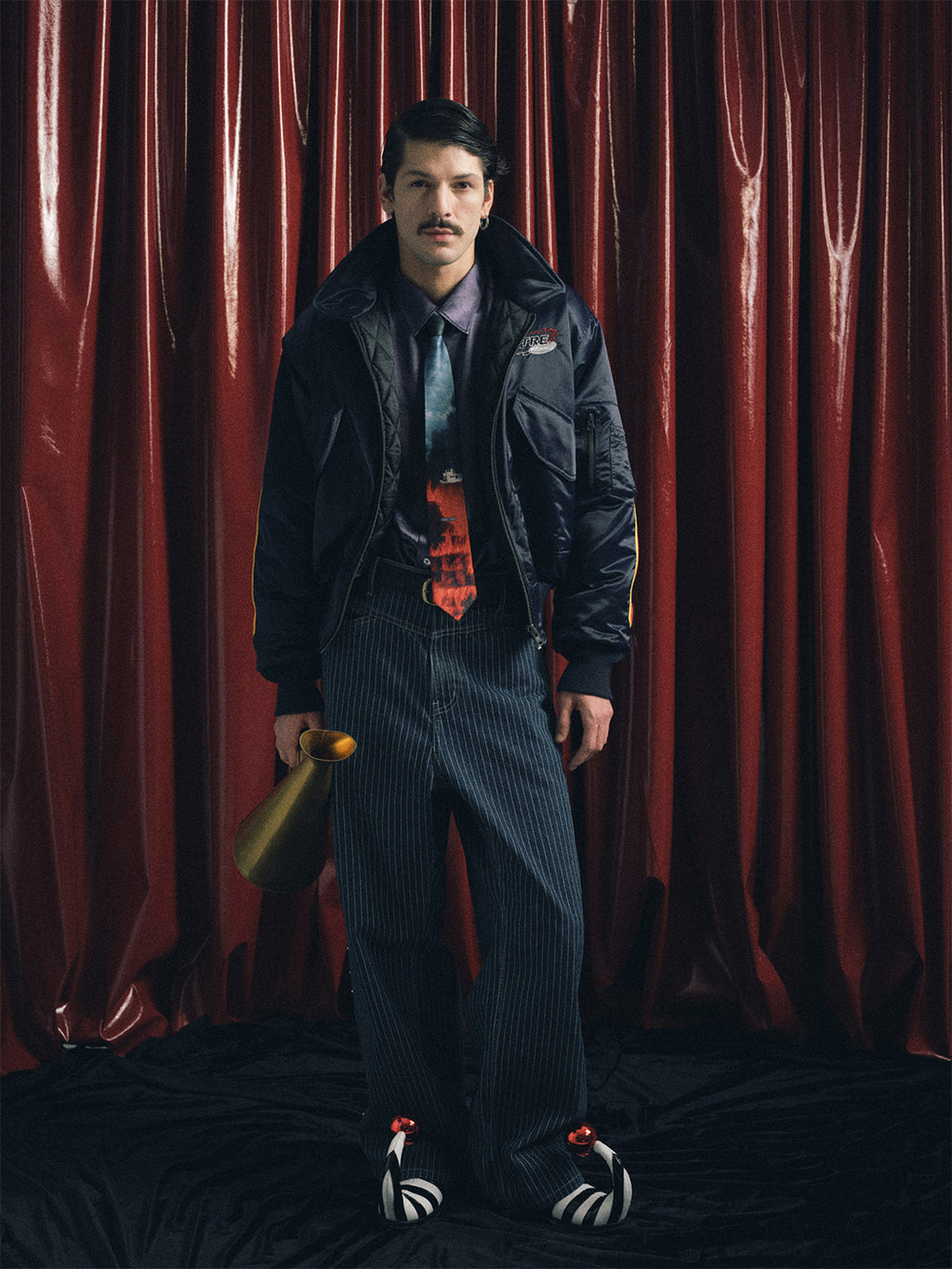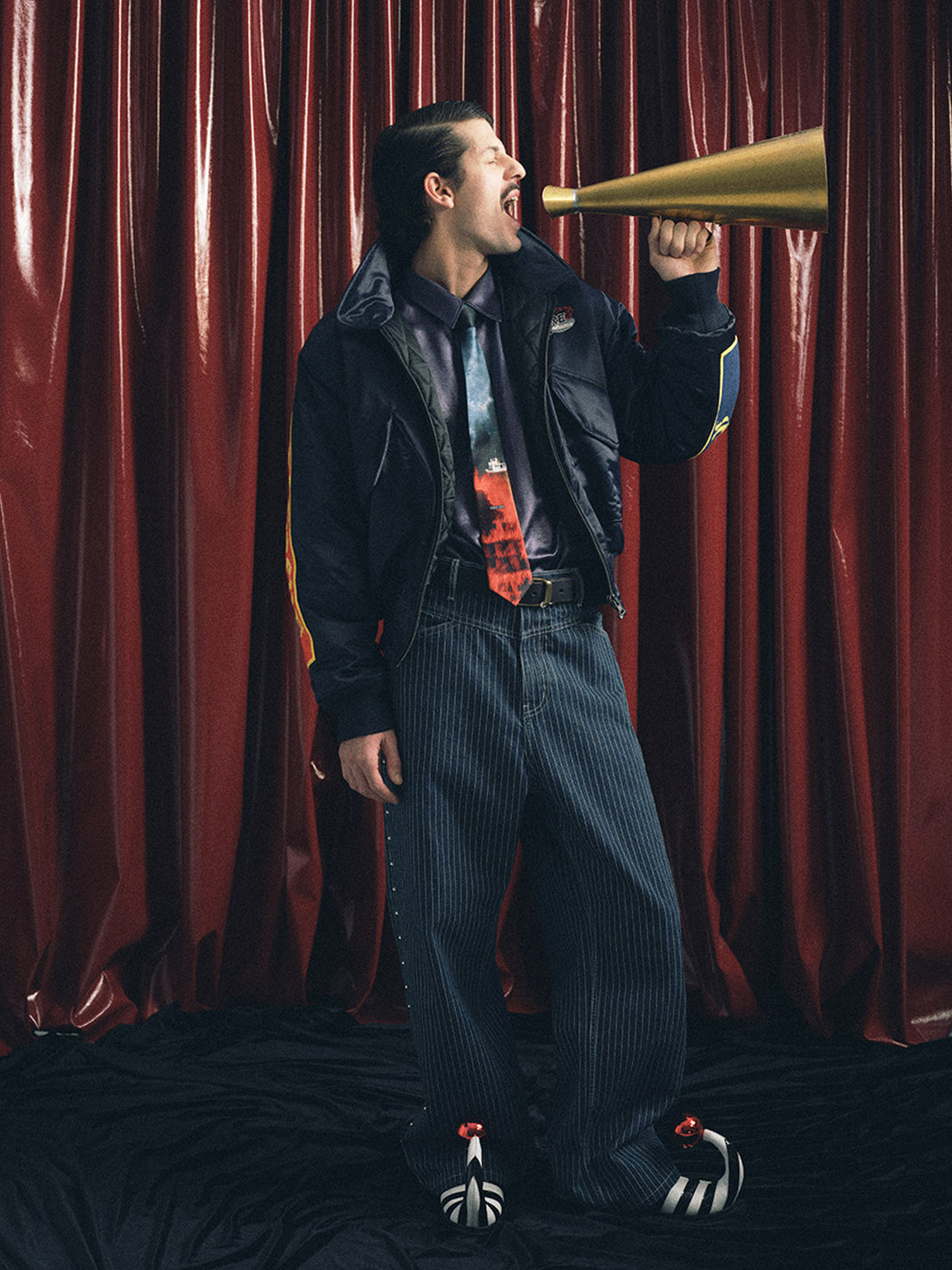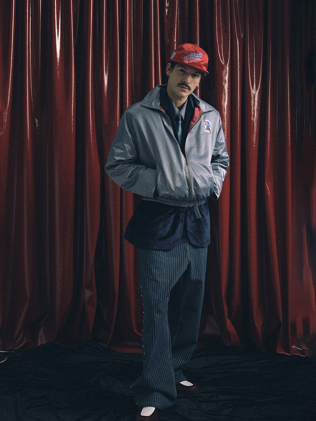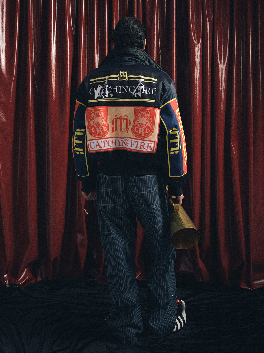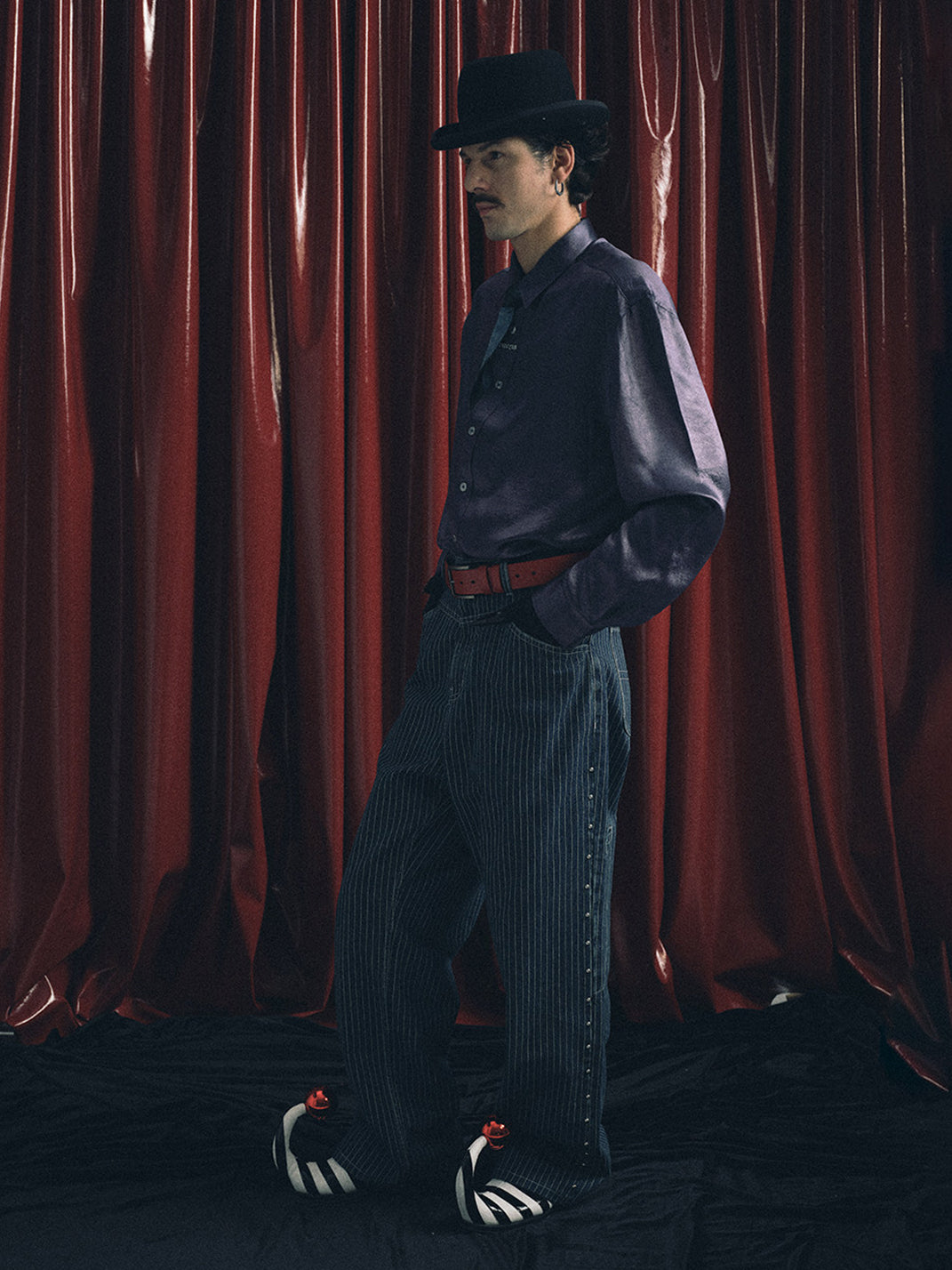 The fabric is vertical striped denim, which undergoes multiple washes to naturally fade and retain its vintage texture. The sides are decorated with 40 silver round polished rivets, and the back leather patch is made of genuine cowhide suede with laser engraving to highlight the theme. The cut is a straight-leg wide-leg style, offering a comfortable and natural fit.