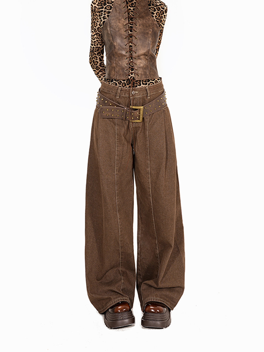 Arielink | Western Style Leopard Mesh T-shirt with Leather Bustier Vest